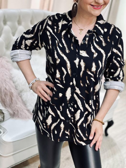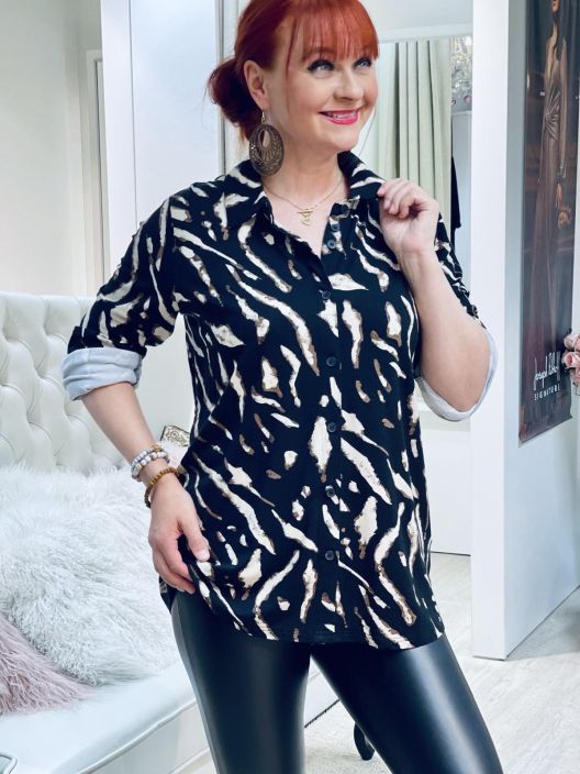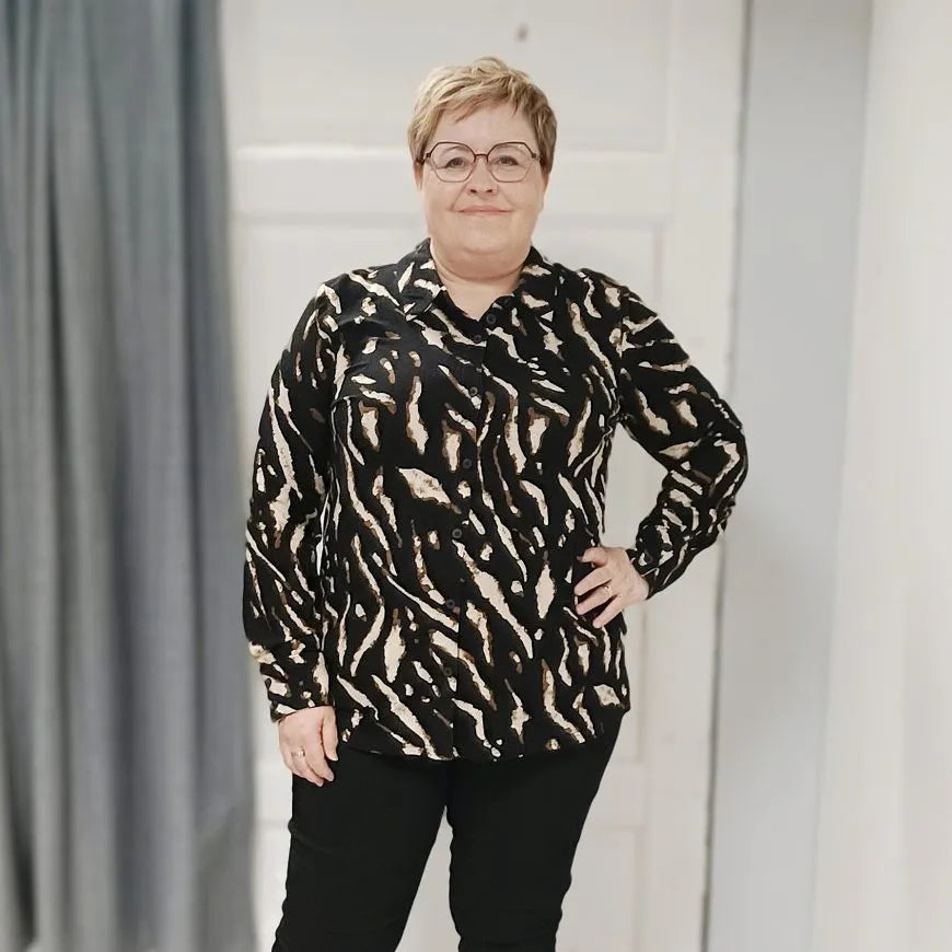 Ze-Ze - Julianna flott og sparileg skyrta með dýramynstri. Langar ermar, skyrtukragi, hneppt að framan, þétt og gott viskós efni sem fellur fallega. Hægt að nota bæði sem spari og hversdags.