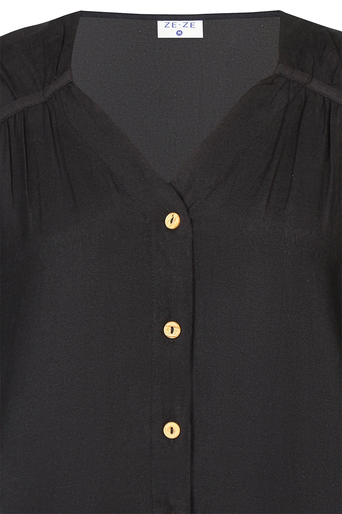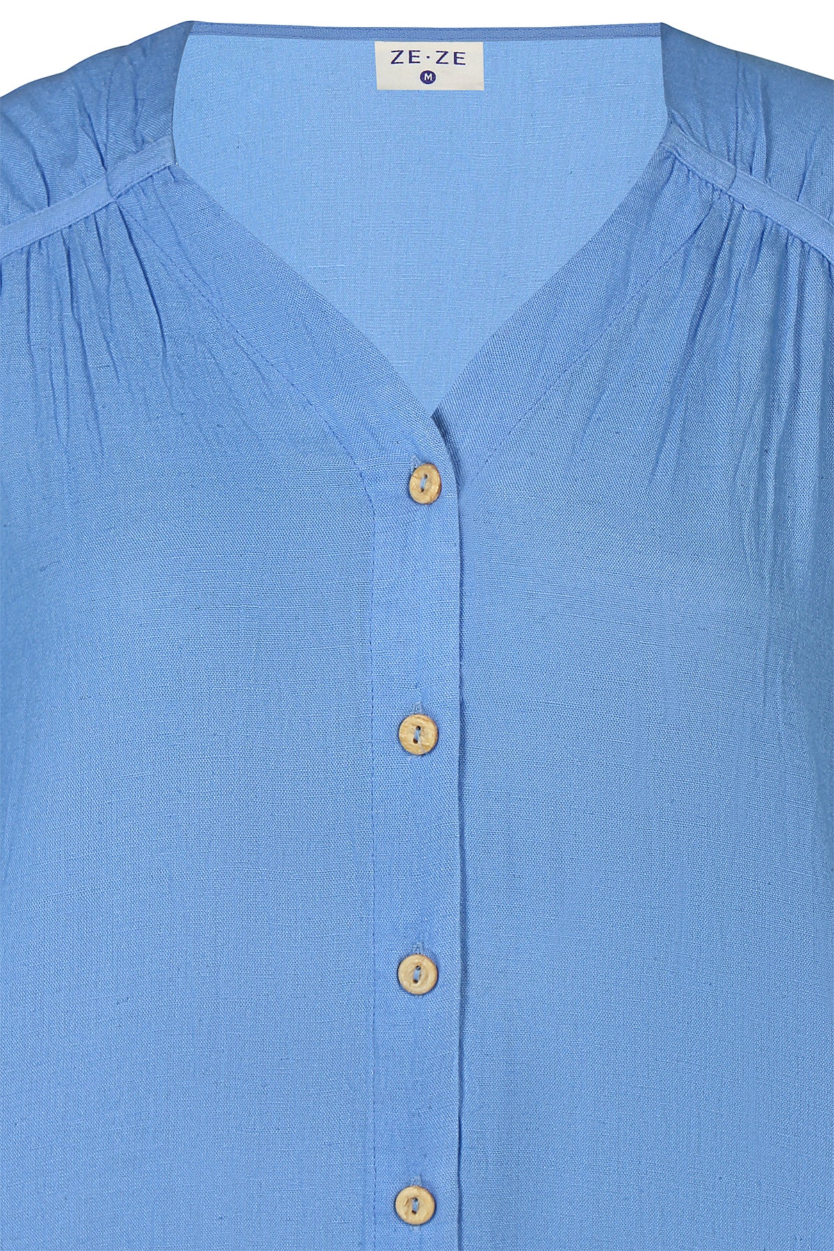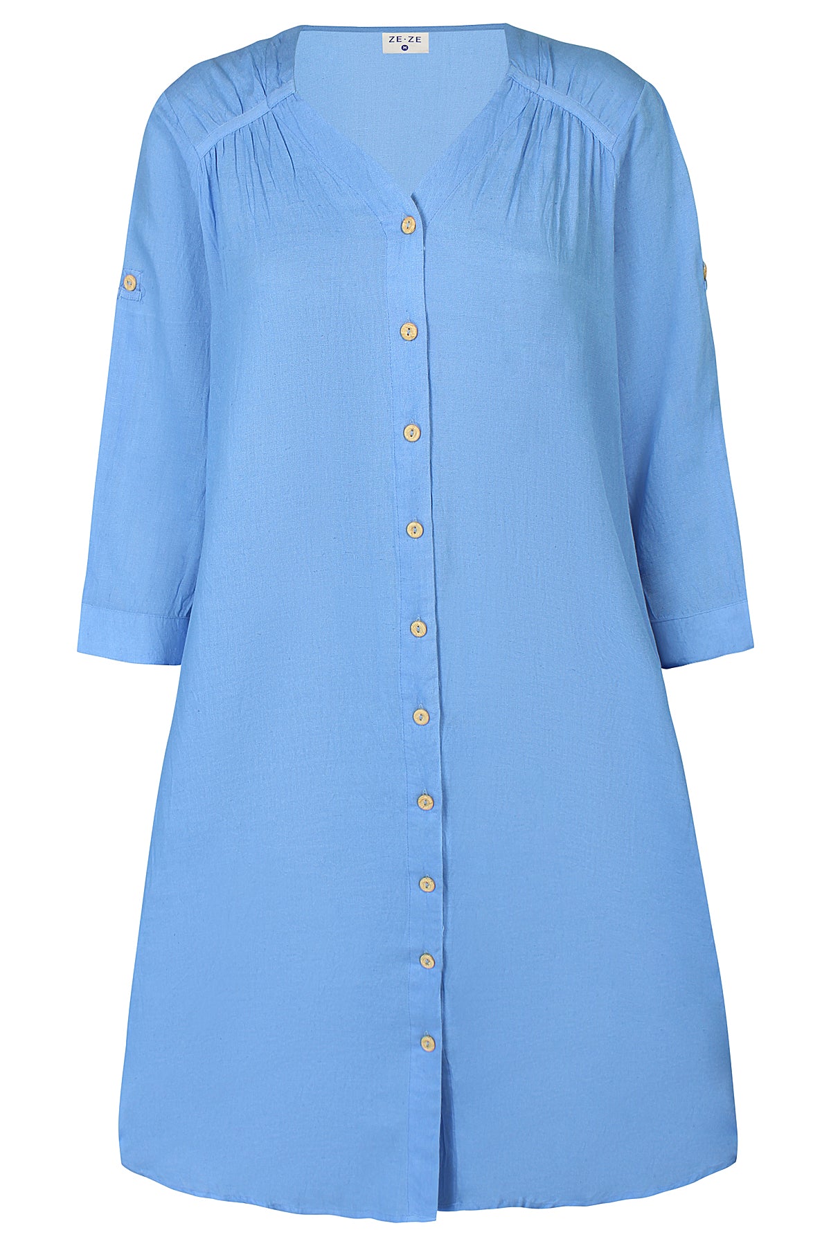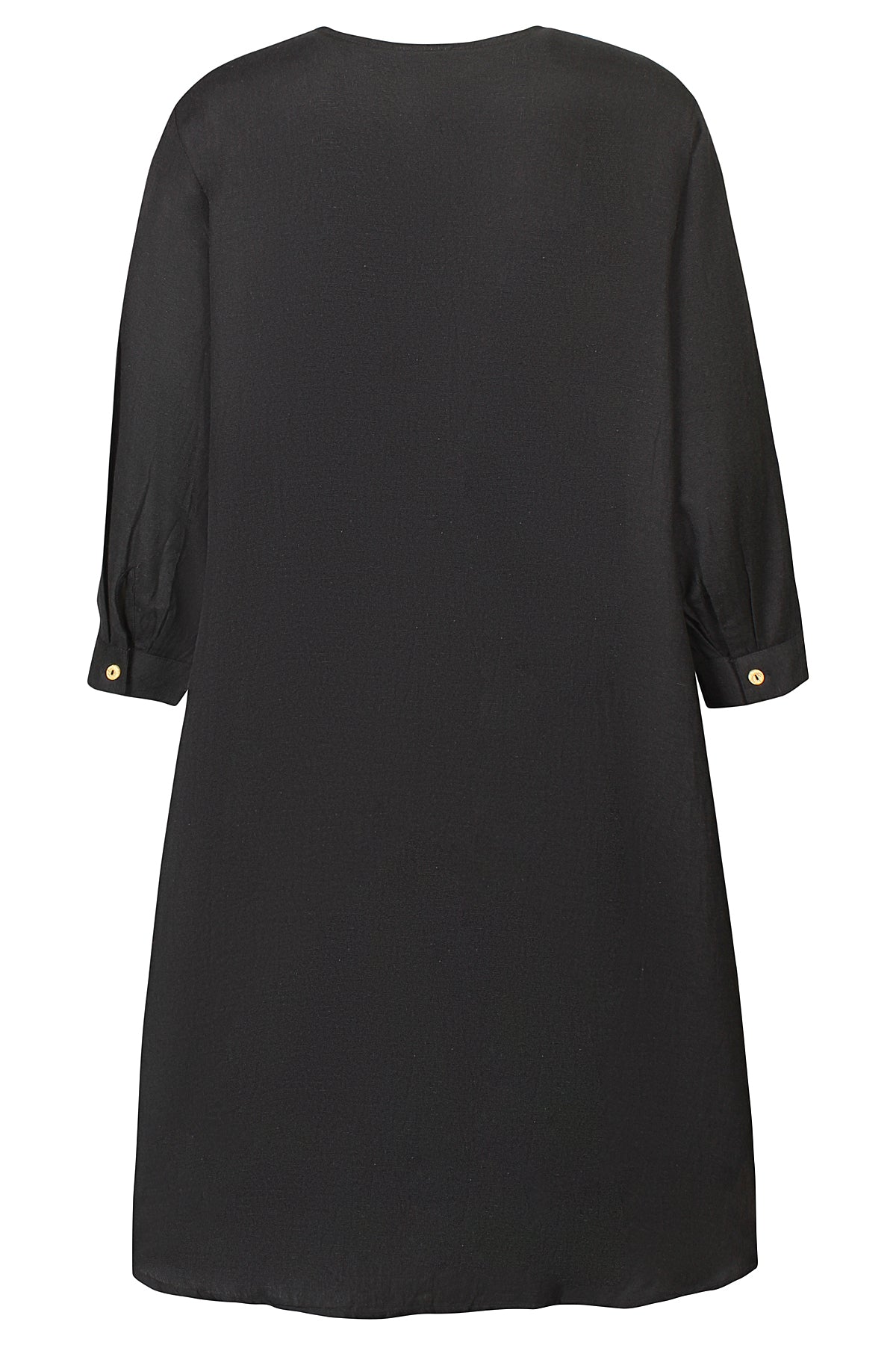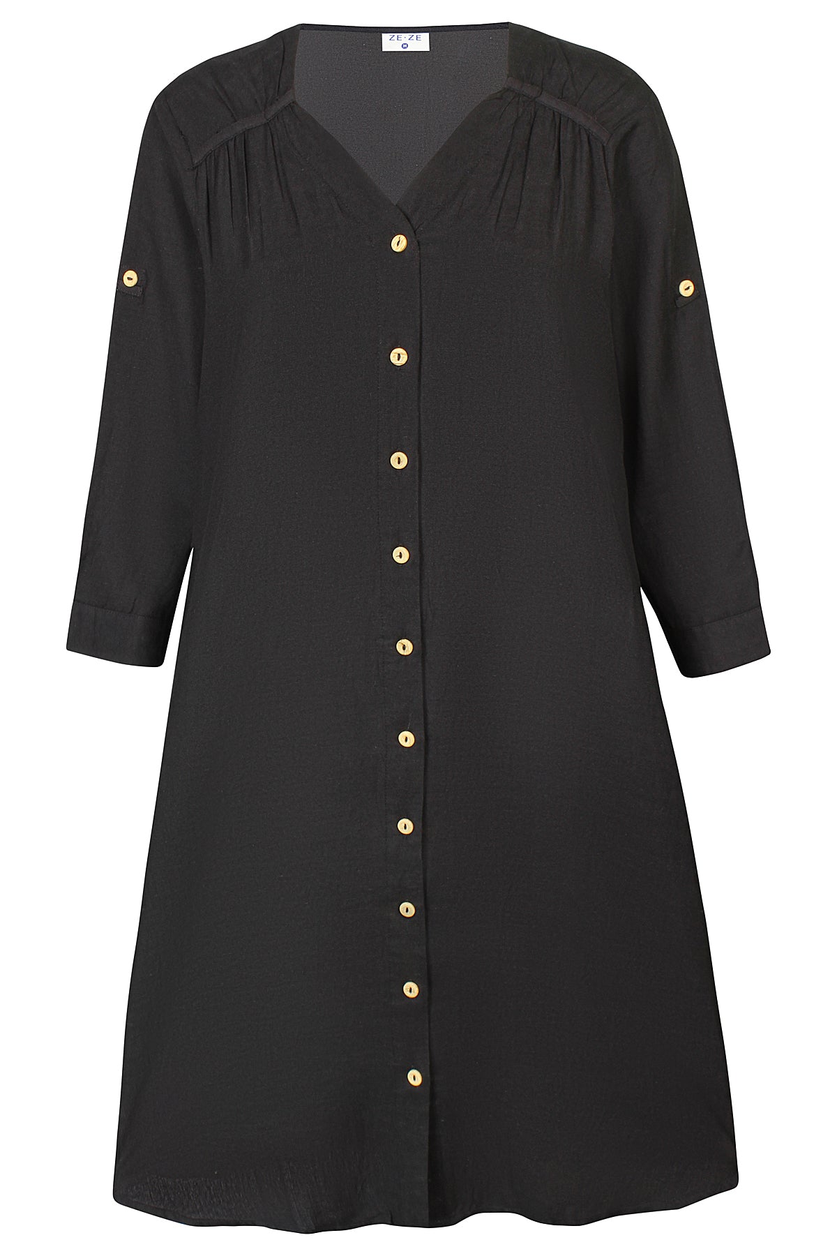 Ze-Ze - Lucia léttur og þægilegur bómullar-hör skyrtukjóll. V-hálsmál, hnepptur alla leið niður að framan, kvartermar með tölu sem er hægt að festa upp, rúnaður að neðan. Fæst í svörtu og bláu.