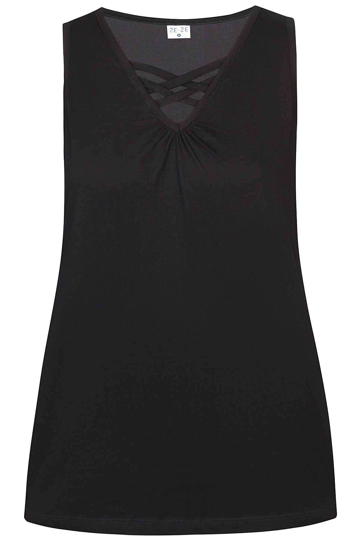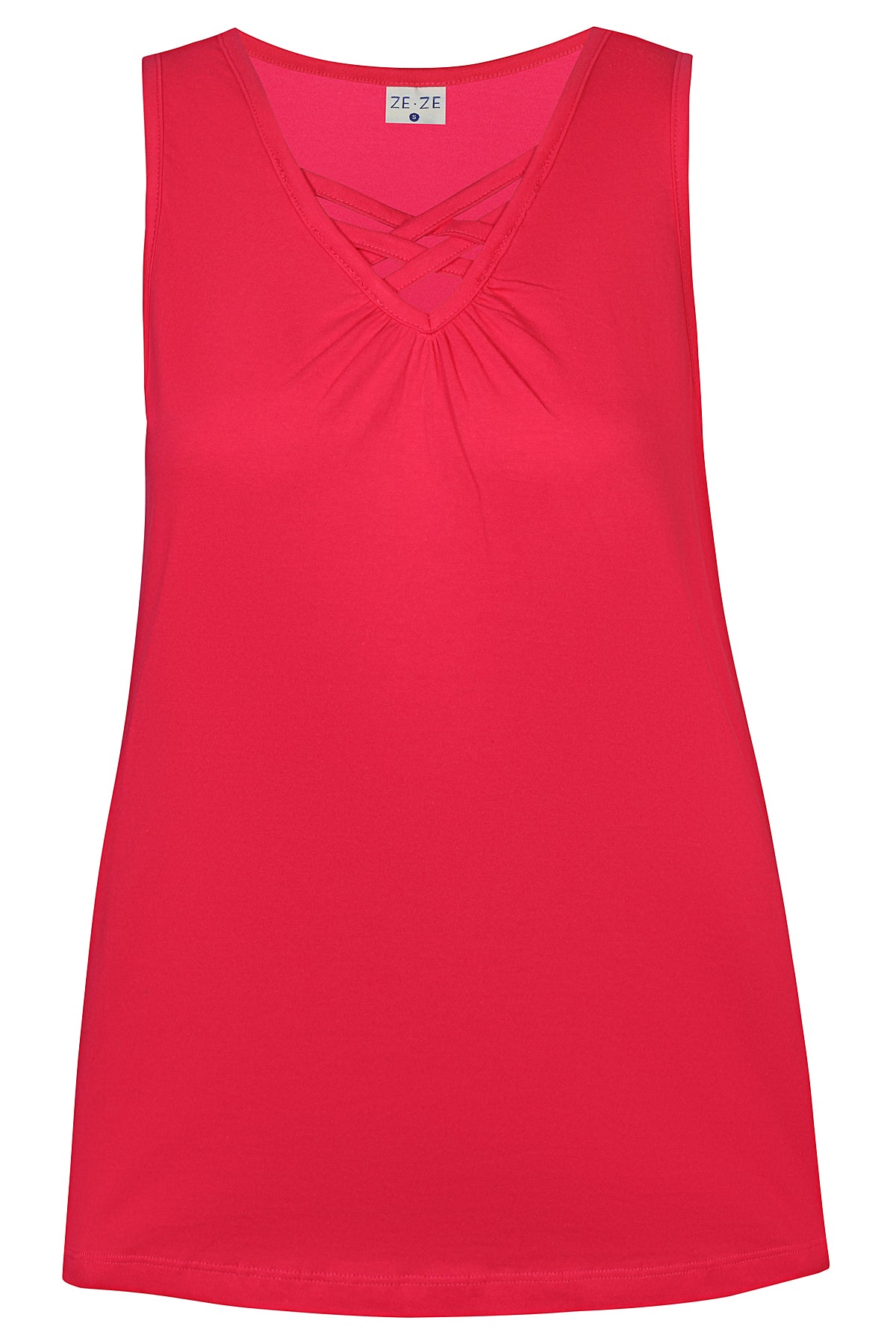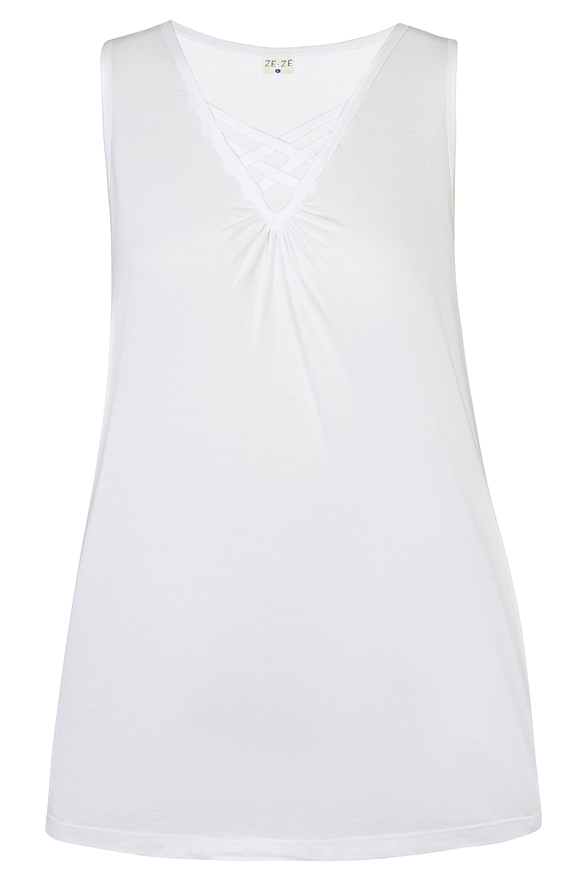 Ze-Ze - Luna 655 flottur og þægilegur toppur með böndum og rykkingu í hálsmáli. Breiðir hlýrar og V-hálsmál. Tilvalinn undir opnar blússur og peysur eða einn og sér.