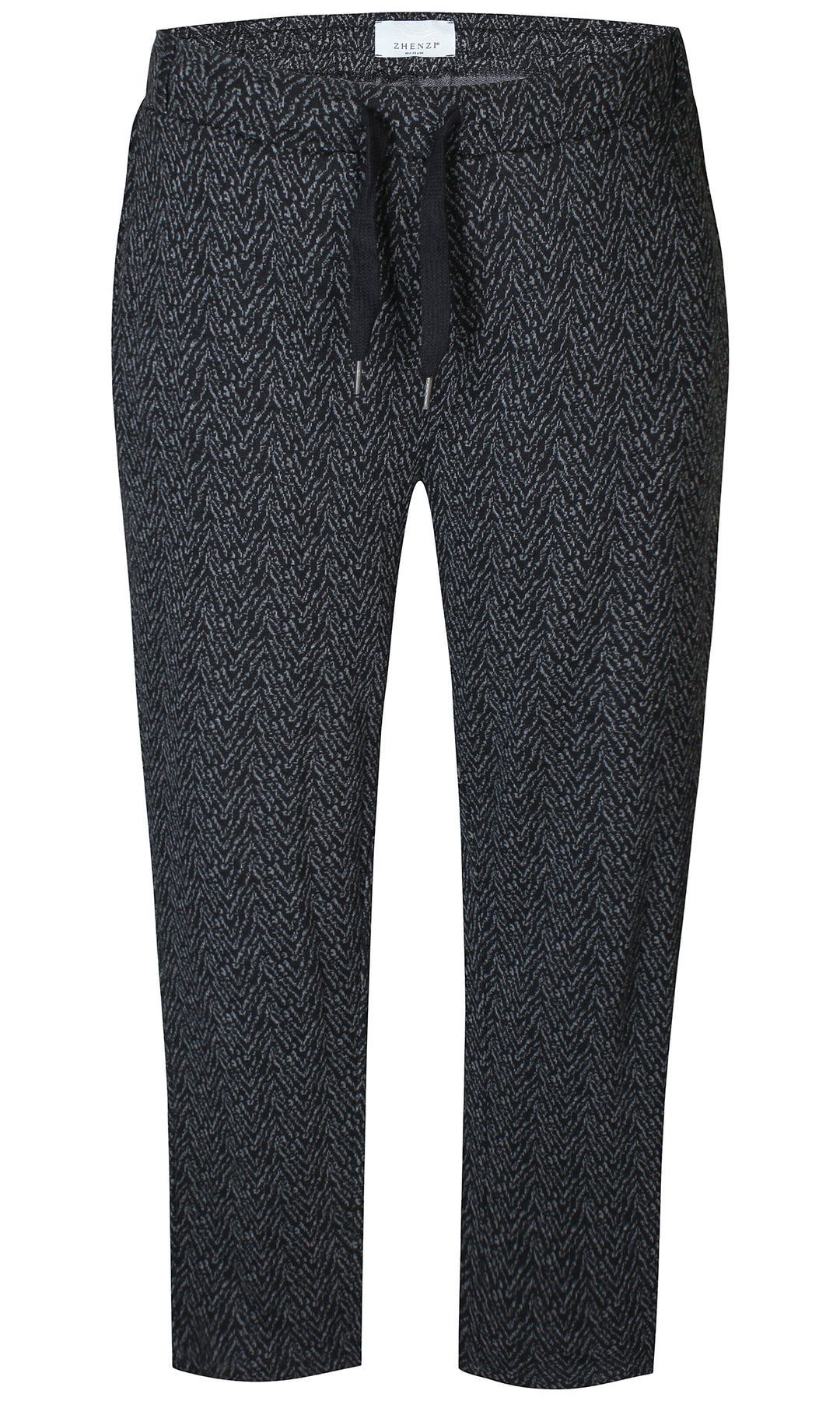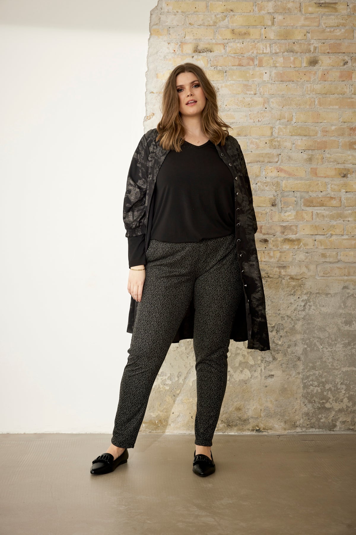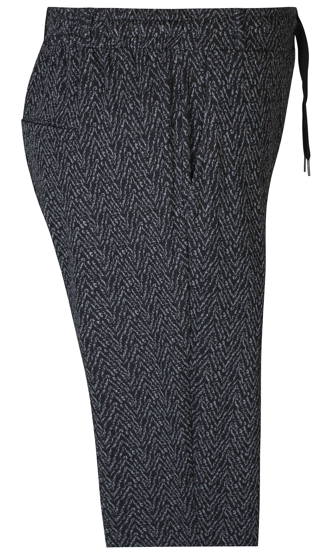 Zhenzi - Agne mynstraðar joggingbuxur með góðum vösum að framan og að aftan. Teygja í mitti og reimar, beinar niður, þétt og gott efni. Svartar í grunninn með gráu mynstri.