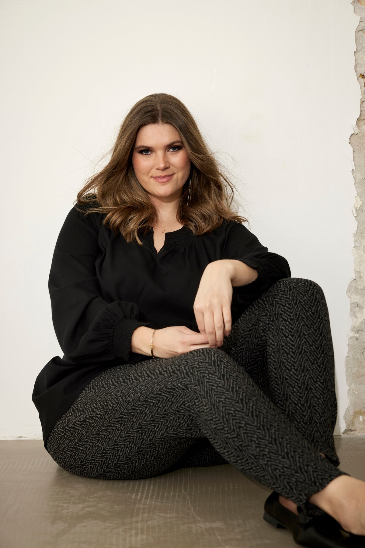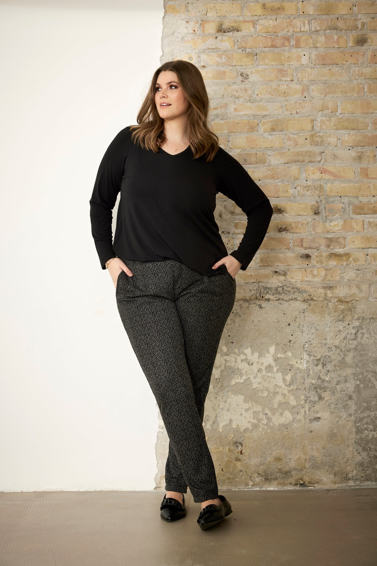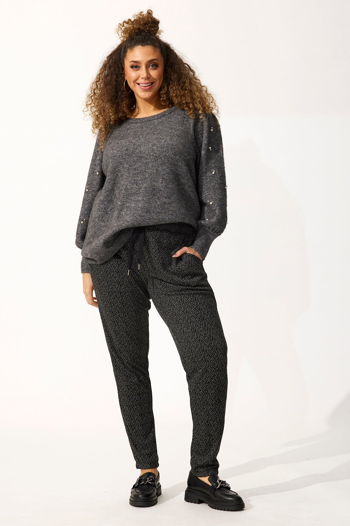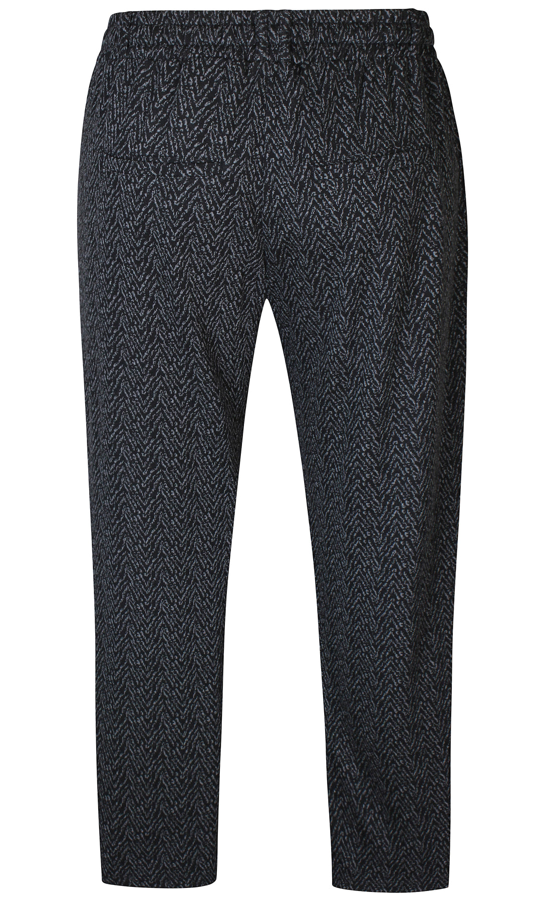Zhenzi - Agne mynstraðar joggingbuxur með góðum vösum að framan og að aftan. Teygja í mitti og reimar, beinar niður, þétt og gott efni. Svartar í grunninn með gráu mynstri.
