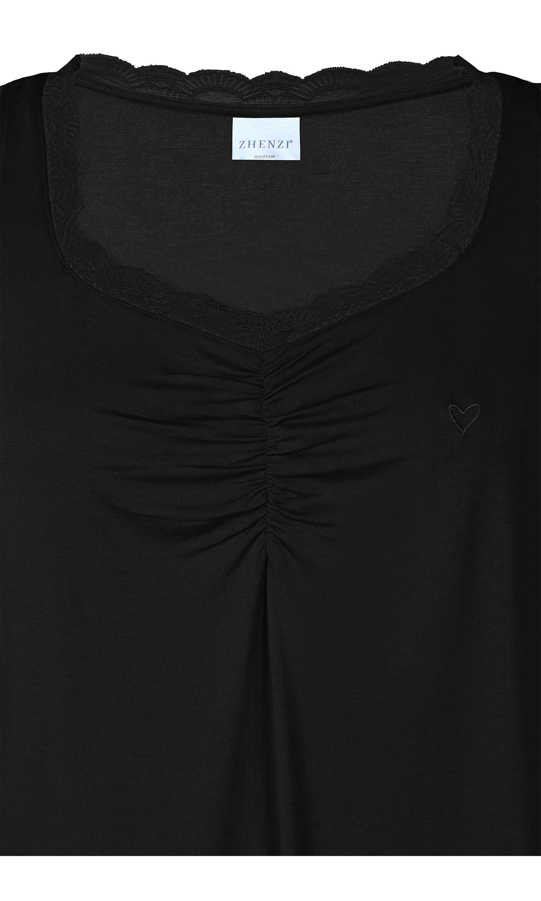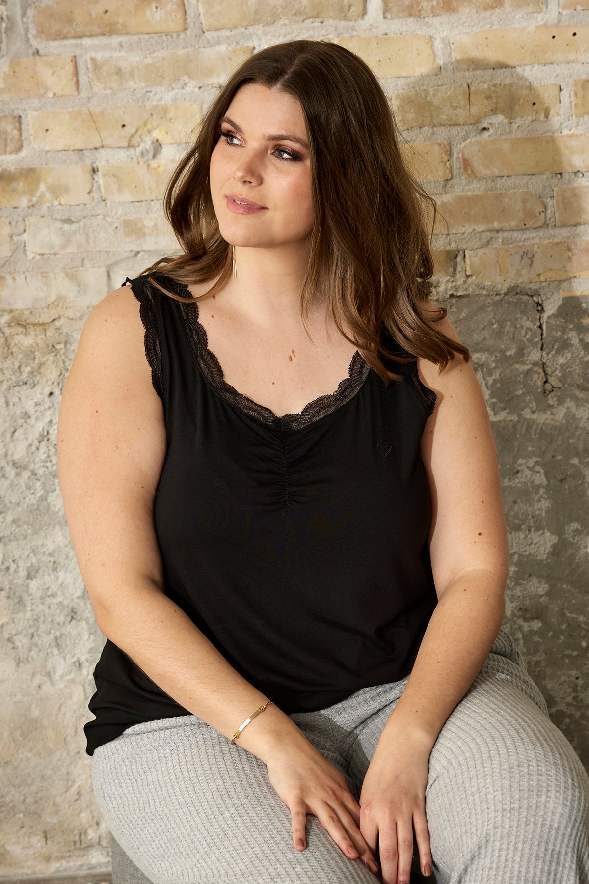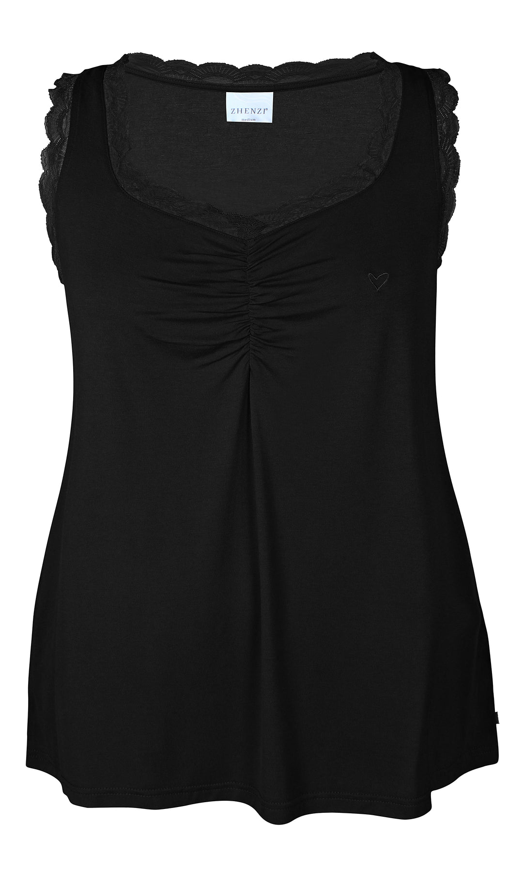 Zhenzi - Coco flottur og þægilegur toppur með blúndu og rykkingu að framan. Tilvalin undir opnar blússur og peysur eða einn og sér.