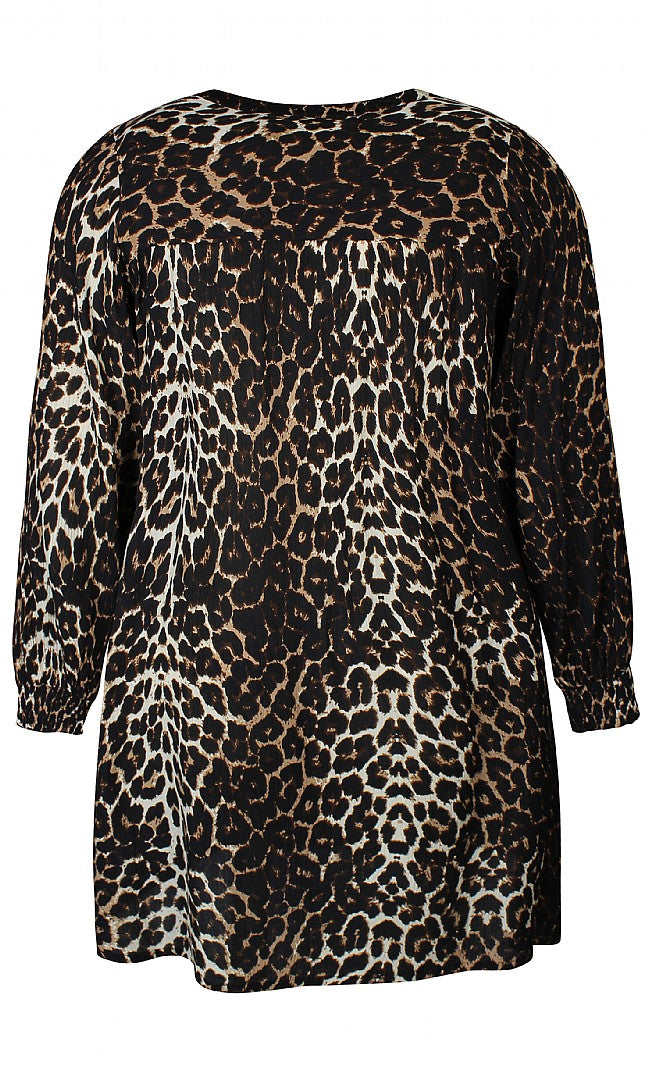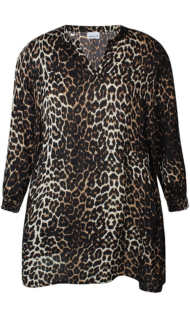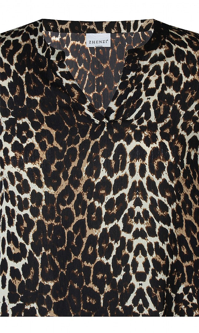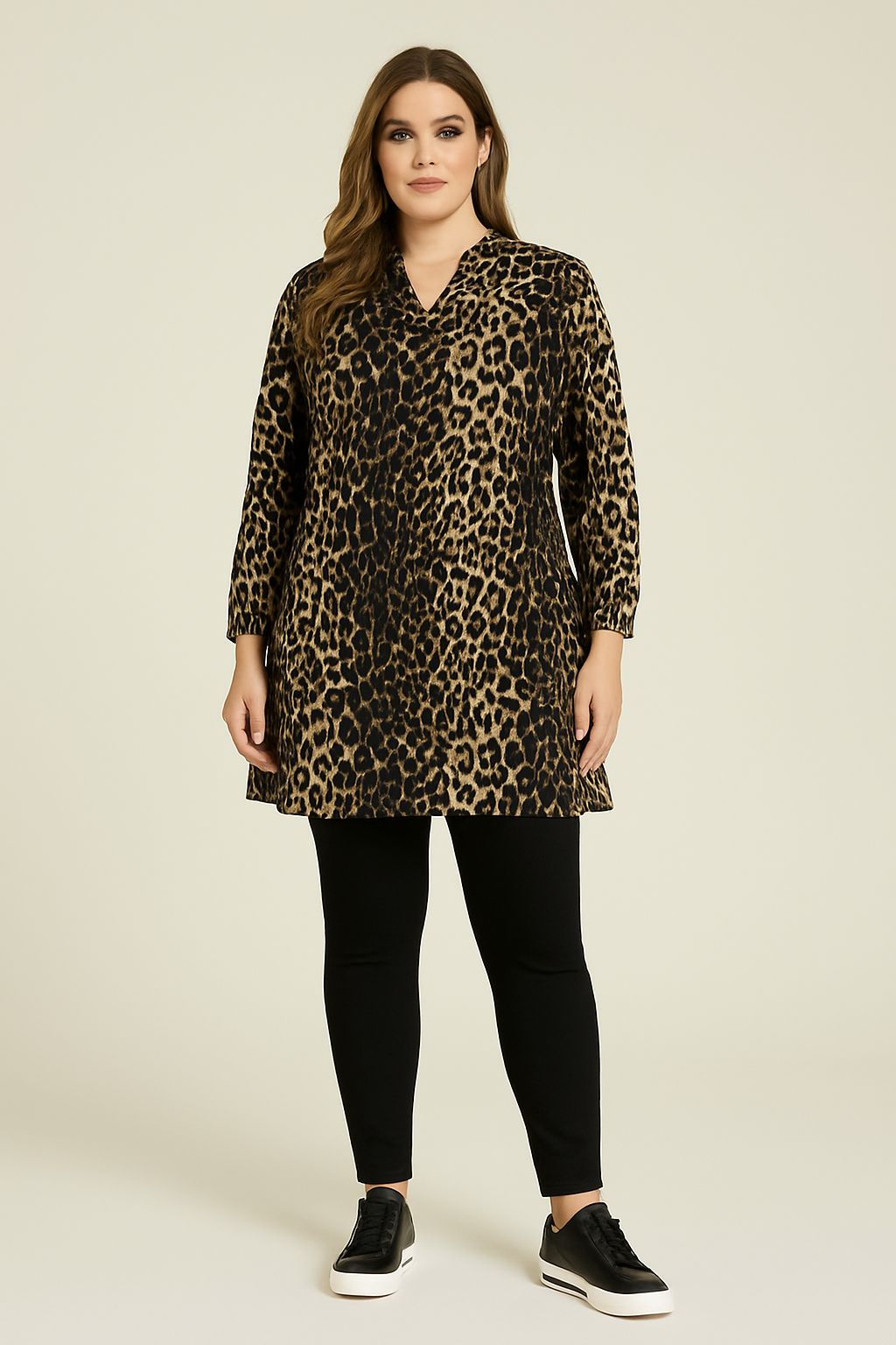 Zhenzi - Niki tunika með hlébarðamynstri og góðum vösum. Rúnað hálsmál sem endar í opnu V, síðar ermar. Hægt að nota bæði sem spari og hversdags.