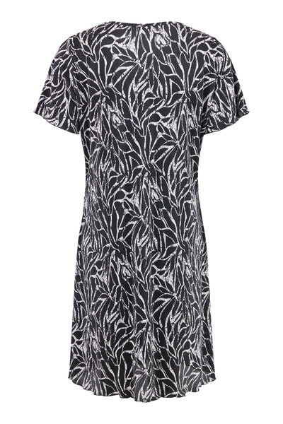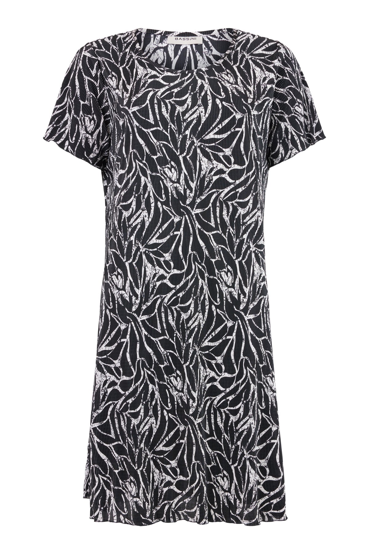 Bassini - Maxxy, kjóll með laufamynstri, rúnuðu hálsmáli, A-sniði og stuttum ermum. Fín plísering í efni sem gefur því meira líf.