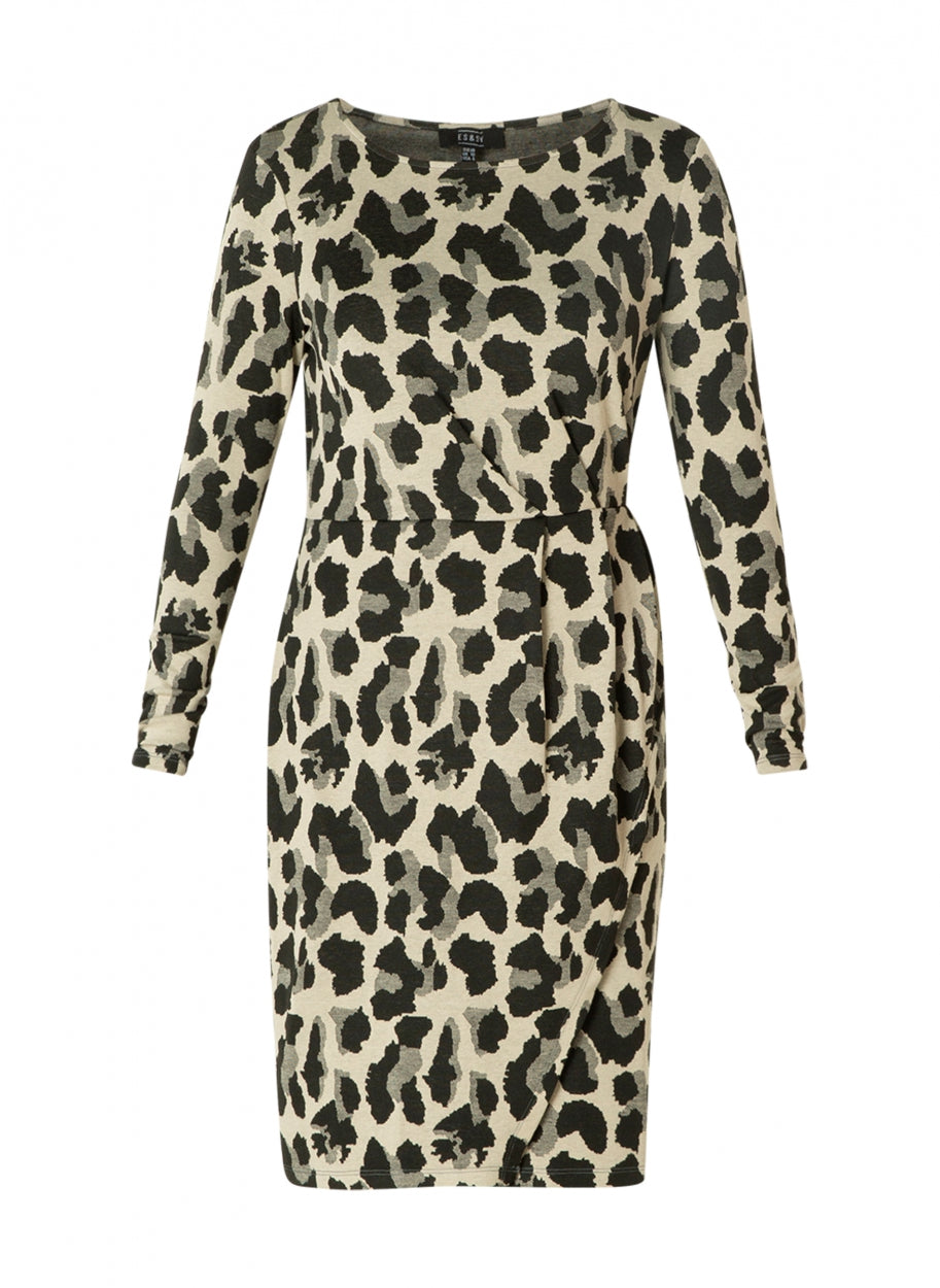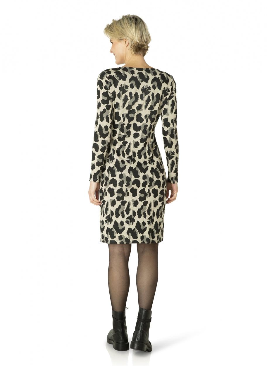 ES&SY - Zisa þægilegur, mjúkur kjóll með með vafnings (wrap around dress) lúkki og smá klauf upp að framan. Rúnað hálsmál, langar ermar og hlébarða mynstur.