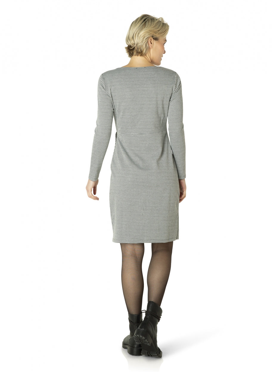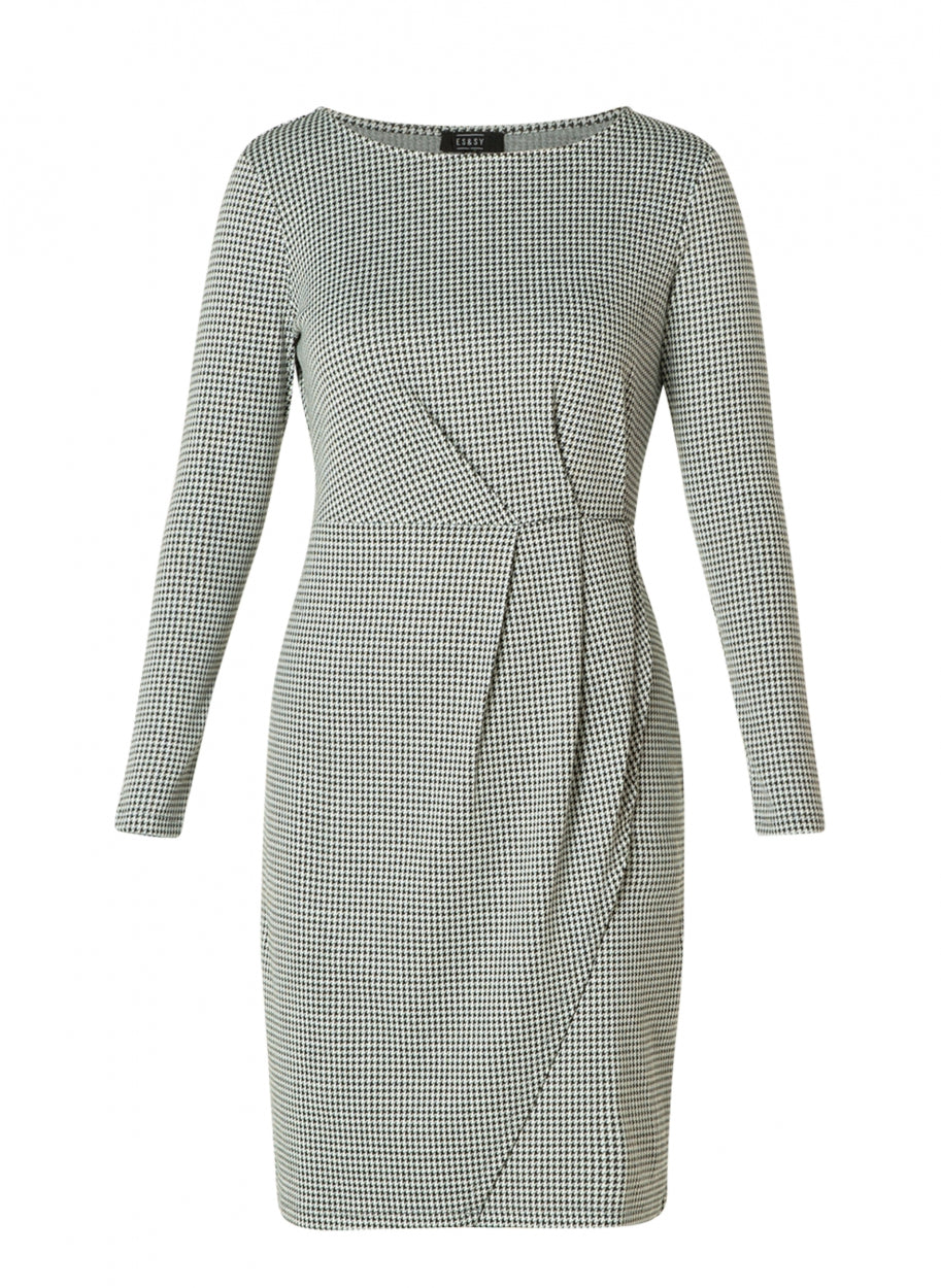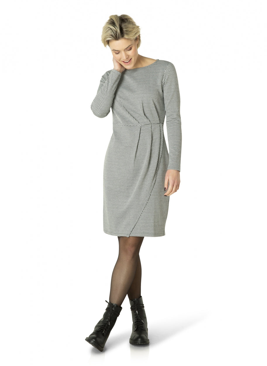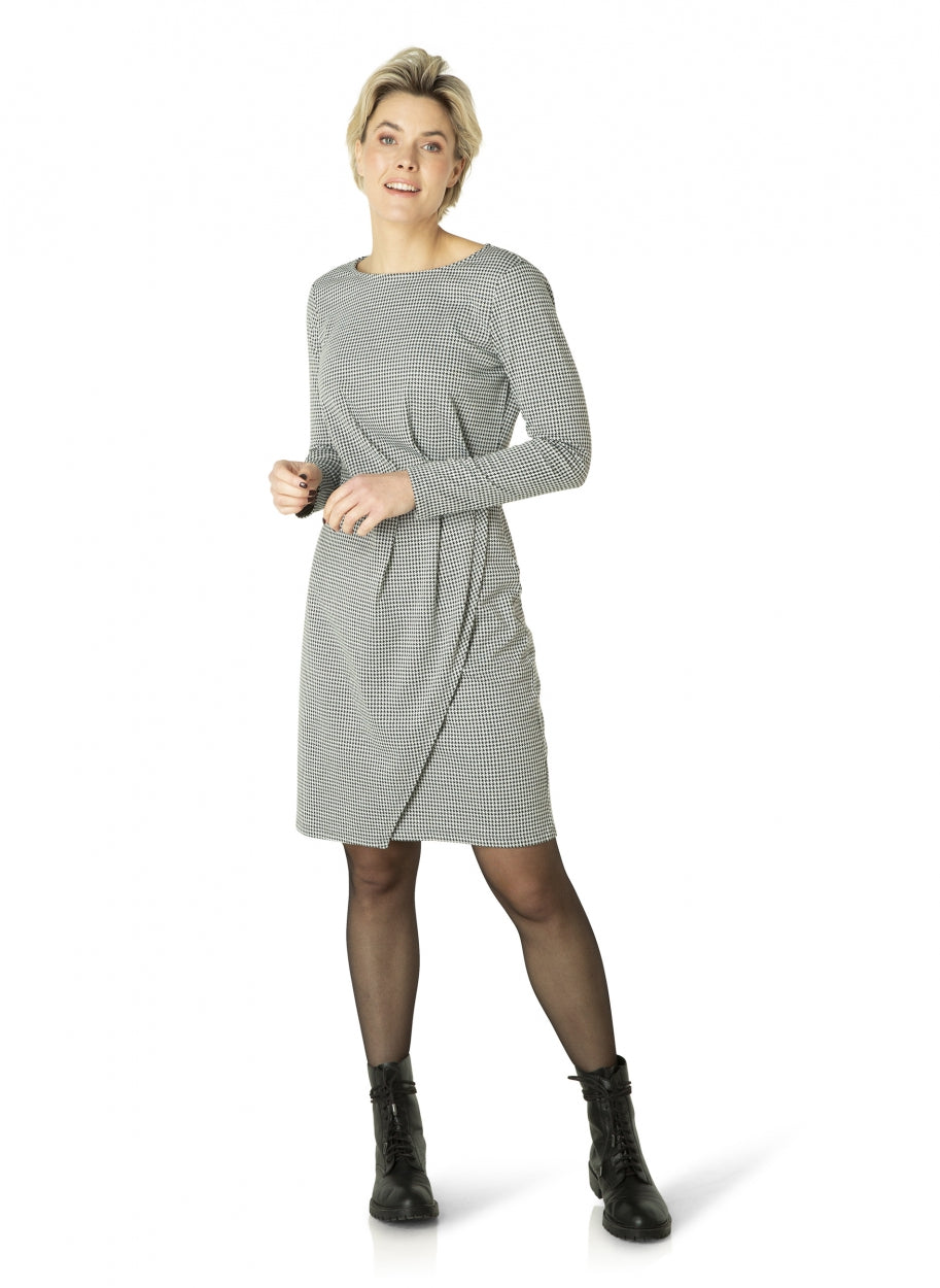 ES&SY - Zoe þægilegur, mjúkur kjóll með með vafnings (wrap around dress) lúkki og smá klauf upp að framan. Rúnað hálsmál, langar ermar og houndstooth mynstur.