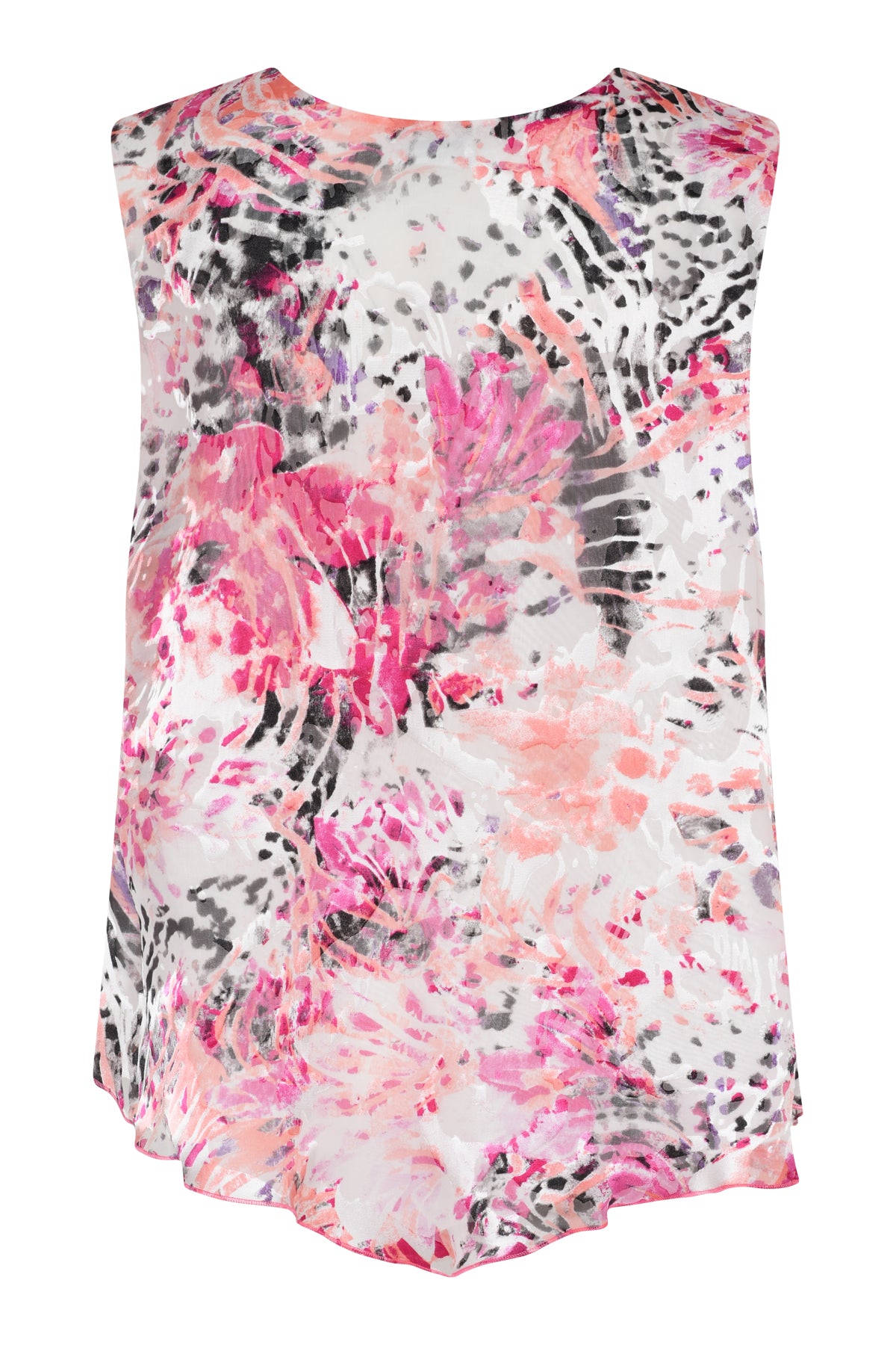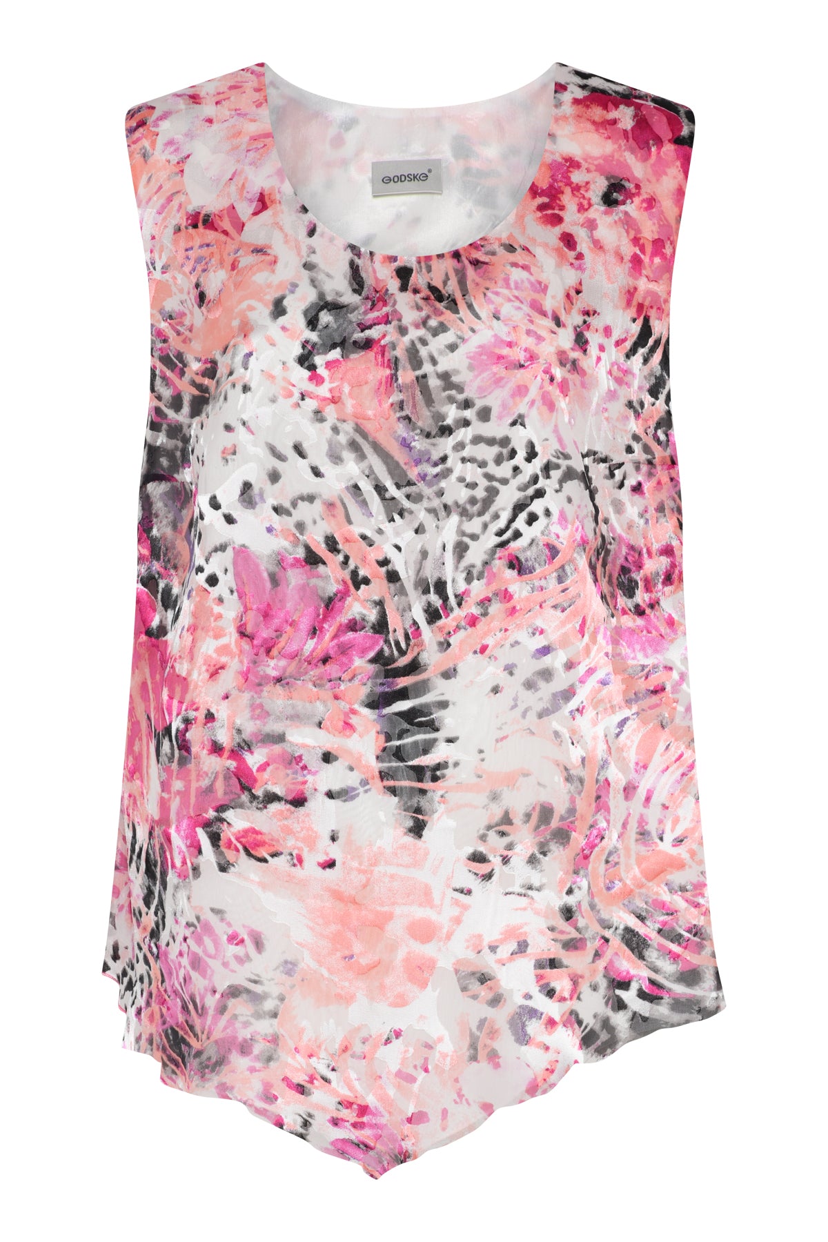 Godske - Sparileg ermalaus blússa með fallegu mynstri, áföstum undirbol og rúnuðu hálsmáli. Létt og þægileg, hægt að vera í undir jakka eða peysu.