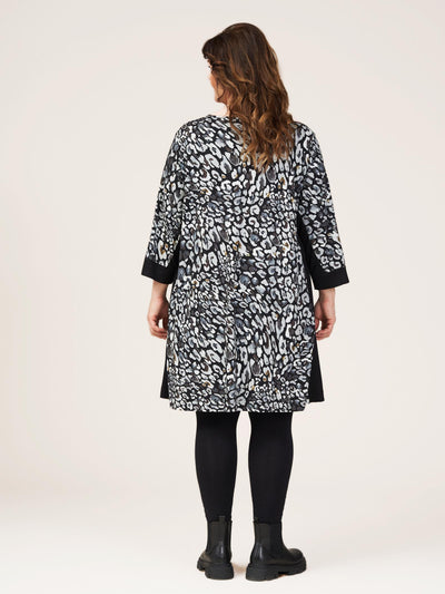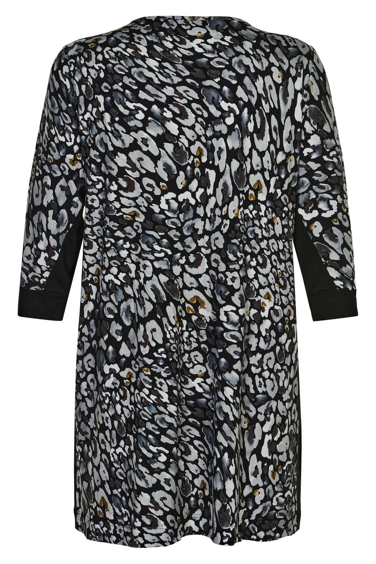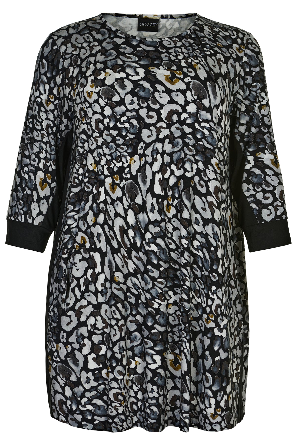 Gozzip - Pil tunika. Síð og mjúk kjólatunika með hlébarðamynstri og vösum. Svartir panelar á hliðum og undir ermum. Kvartermar og rúnað hálsmál.