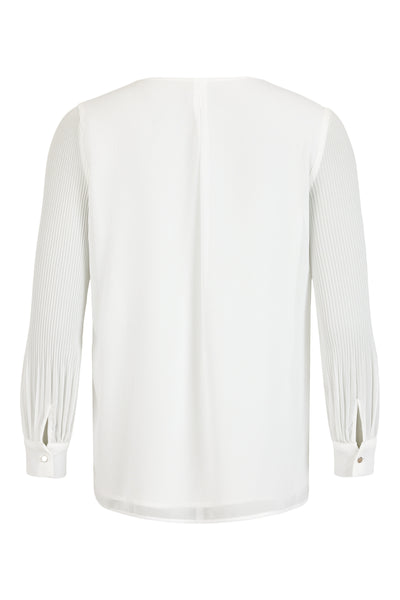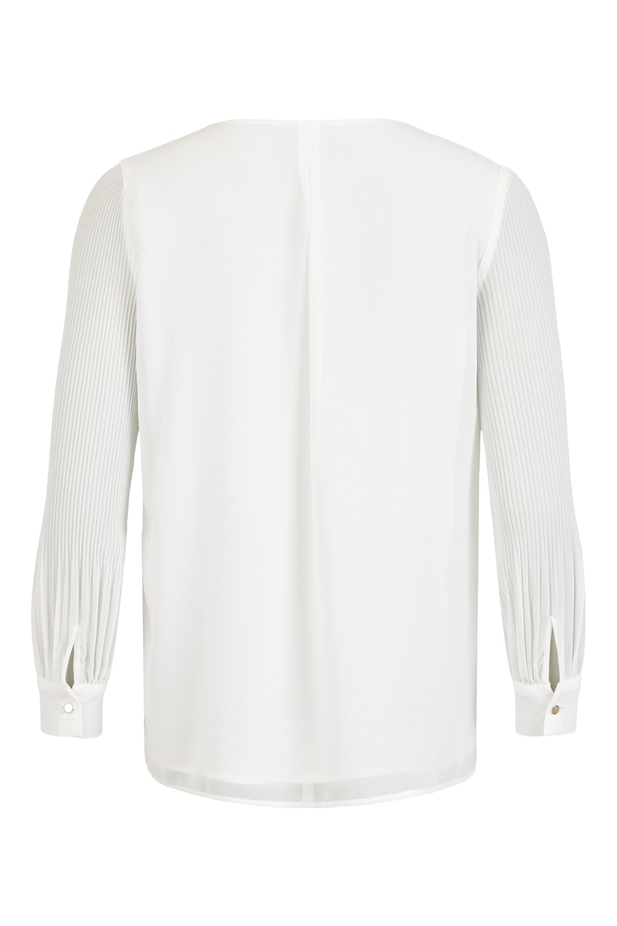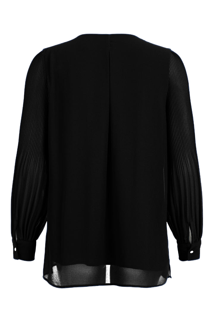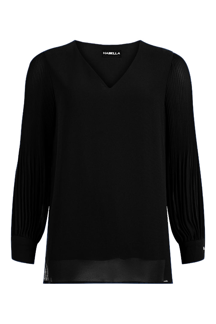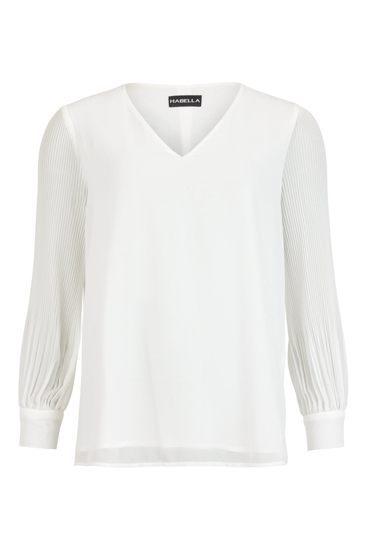 Habella - Ella létt shiffon síðermablússa með V-hálsmáli, áföstum undirbol og plíseruðum ermum með stroffi og silfur tölu neðst. Smá felling í baki sem gefur meiri vídd ásamt klauf á hliðum.