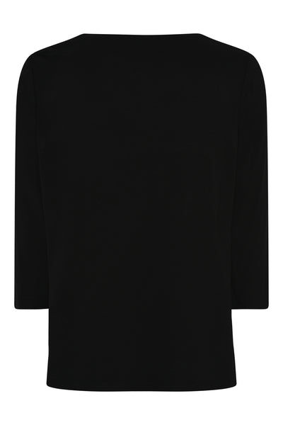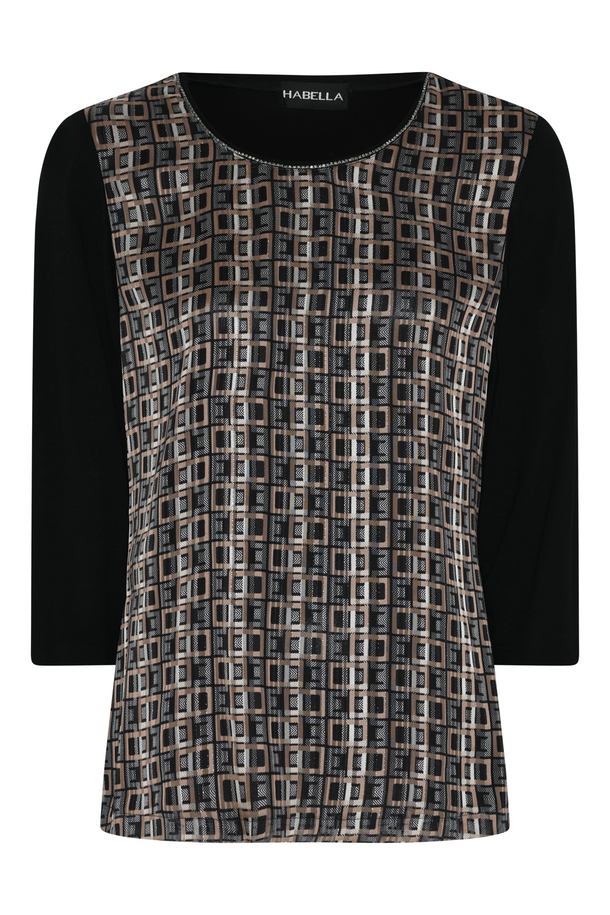 Habella - Gizella, látlaus kvartermabolur með fallegu mynstri að framan og einlitur í baki og ermum, rúnað hálsmál með smá steinum í hálsmáli, tvöfalt blússuefni að framan sem fellur vel og gefur skemmtilega áferð. Fallegur og vandaður bolur sem passar við allt.