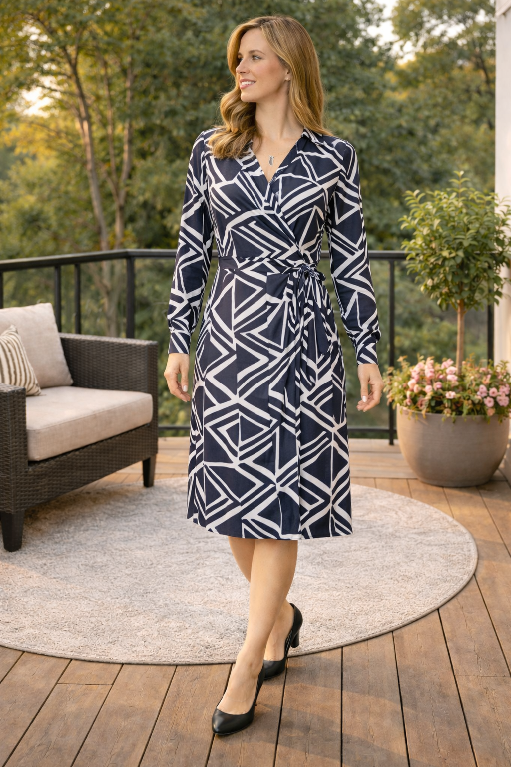 Habella -Jenna, Sparilegur og mynstraður wrap kjóll með silki áferð, teygju í mitti, smá kraga og síðum ermum með stroffi og tveim tölum. Létt og fallegt efni sem flæðir vel.
