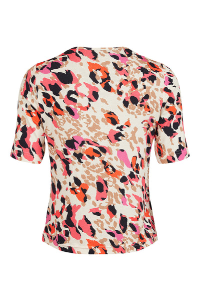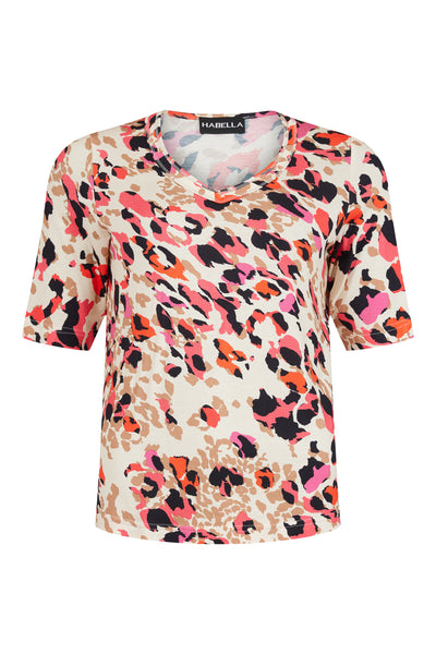 Habella - Mina stuttermabolur með V-hálsmáli og smá silfur þræði í hálsmáli. Mynstur er beige grunnur með lituðum skellum. Sparilegur og sætur við bæði buxur og pils.