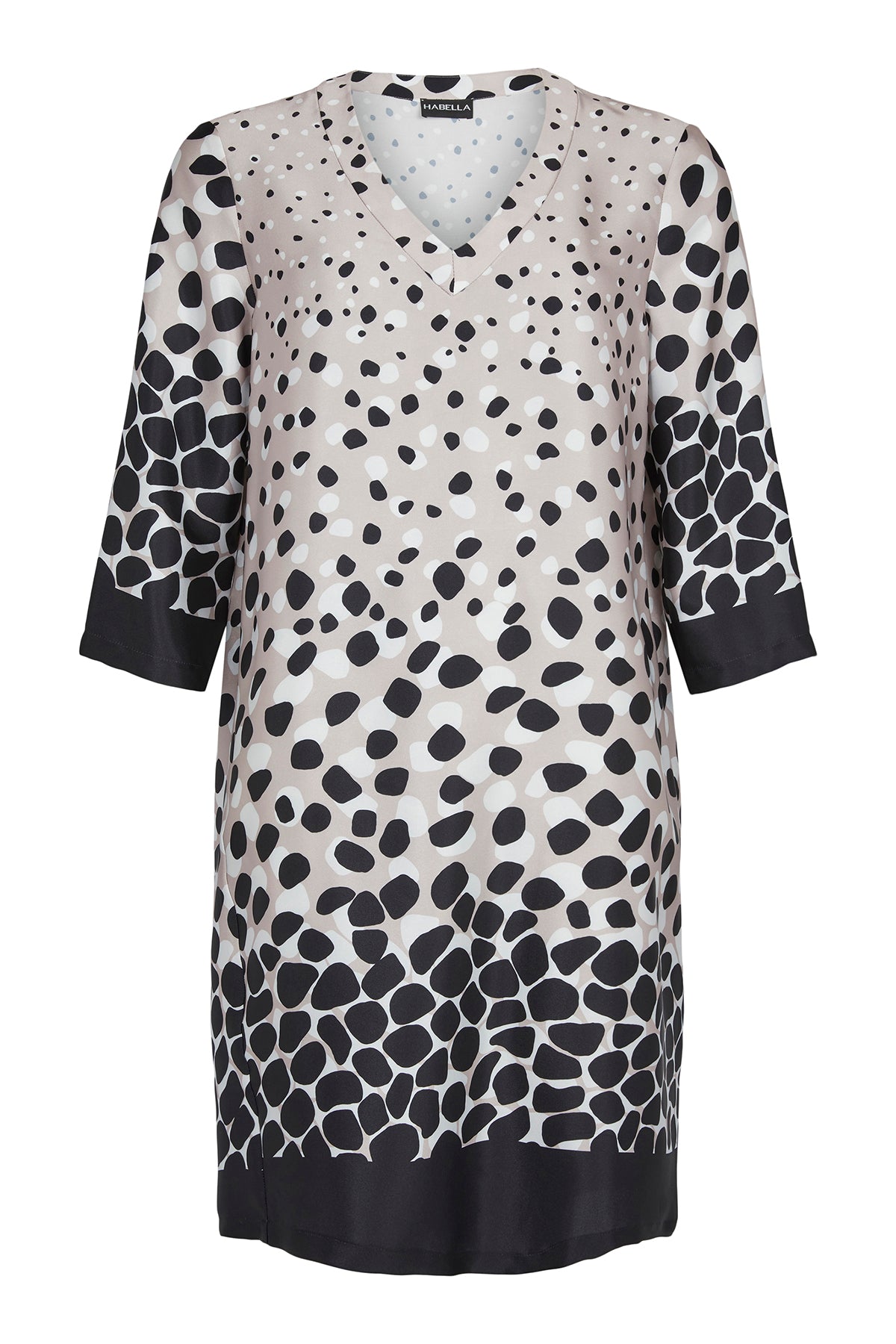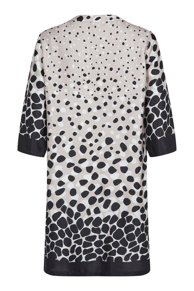 Habella - Rosalind kjóll úr afar sparilegu efni með silkiáferð. Fallegt svart og hvítt doppu mynstur á fölbleikum grunni.