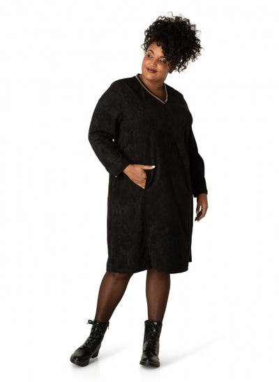 Ivy beau hnésíður kjóll, langar ermar, V-hálsmál með shimmer, aðsniðnum saumum að framan og litlum vösum.