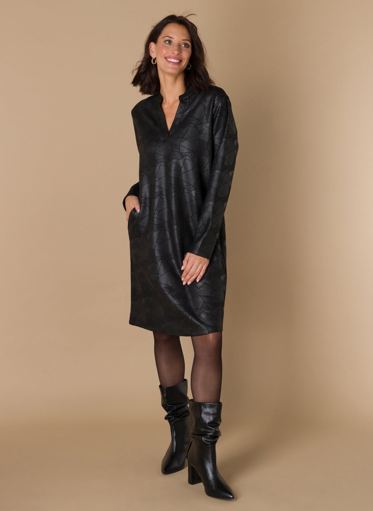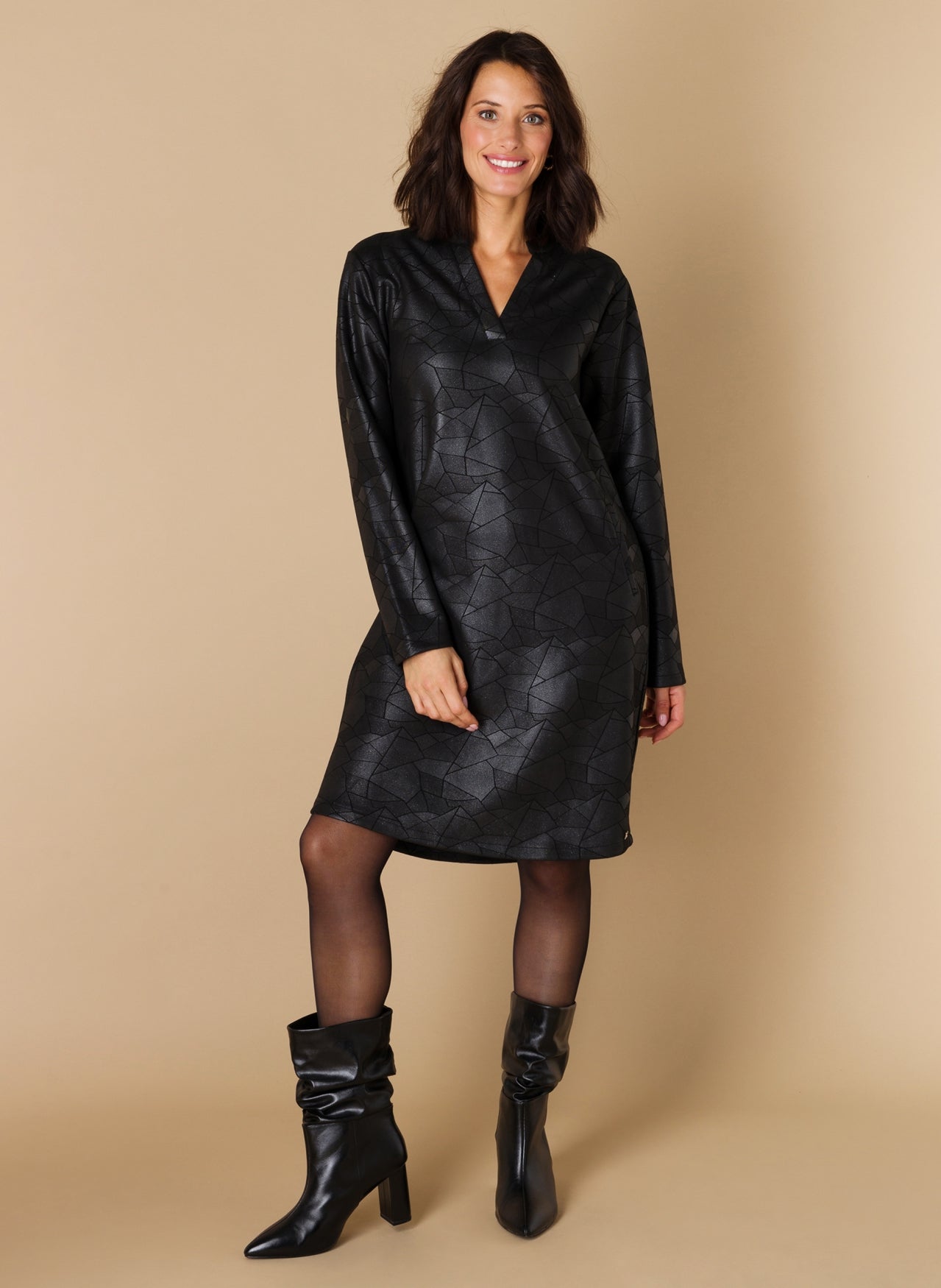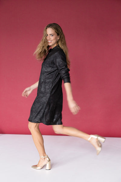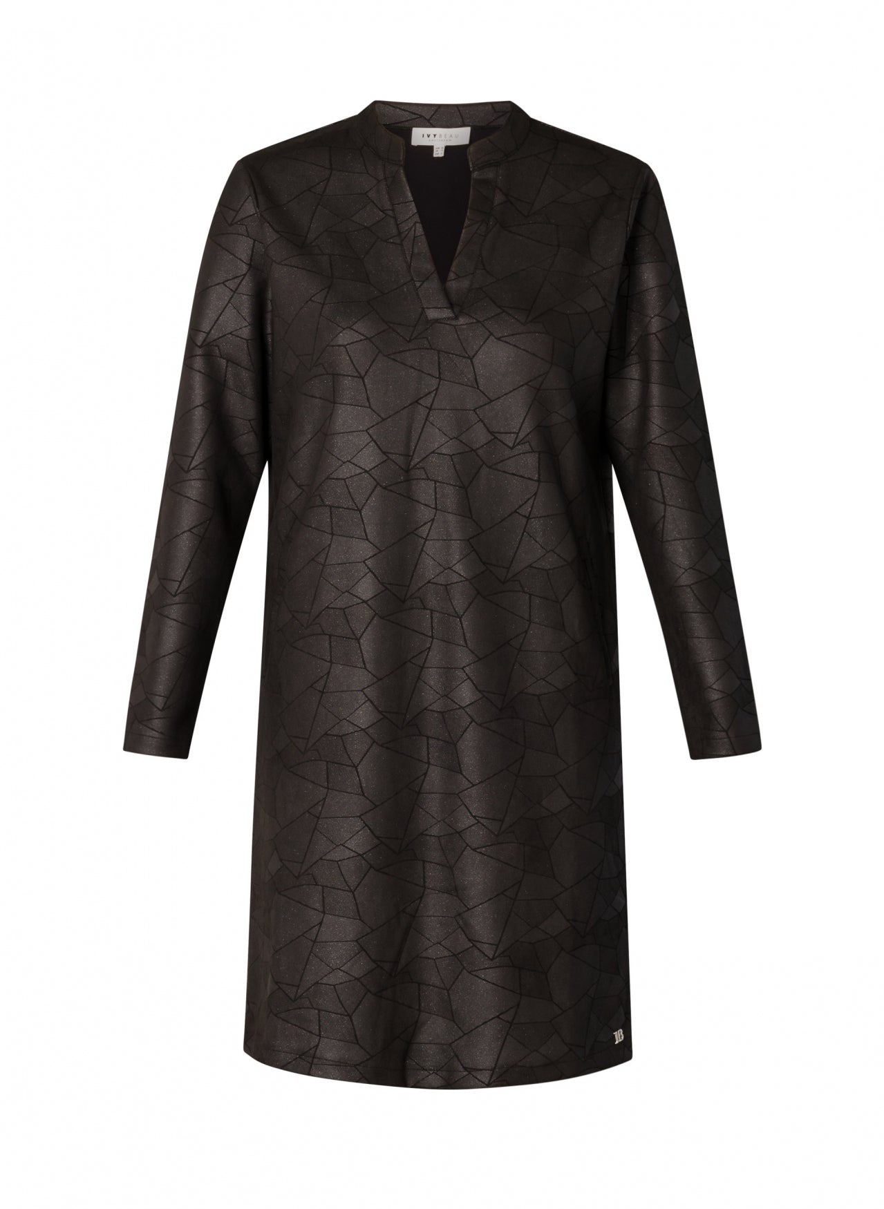 Ivy Beau - Flower flottur og sparilegur kjóll. Langar ermar, rúnað hálsmál með kraga sem endar í V-hálsmáli. Svartur í grunninn með silfruðu og geómetrísku mynstri. Þétt og gott efni sem fellur vel. Flottur kjóll sem hentar við öll tækifæri.