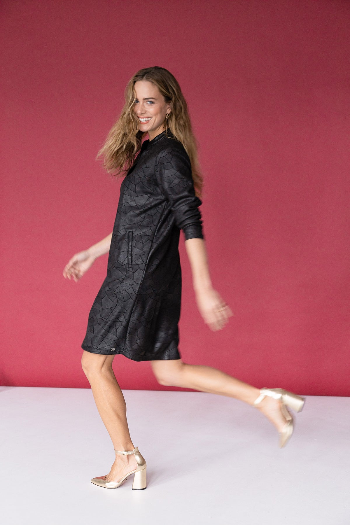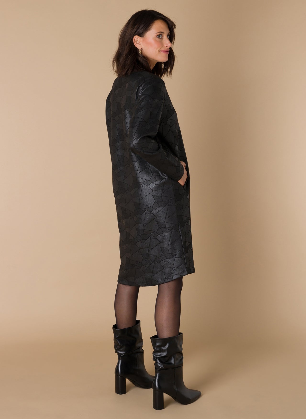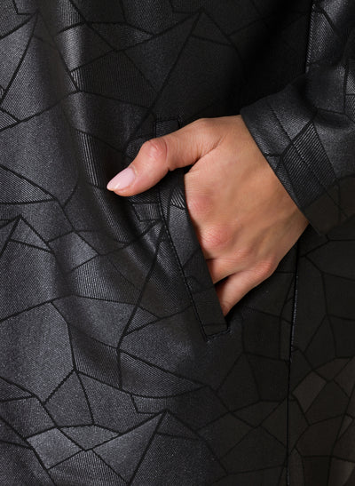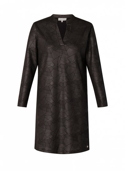 Ivy Beau - Flower flottur og sparilegur kjóll. Langar ermar, rúnað hálsmál með kraga sem endar í V-hálsmáli. Svartur í grunninn með silfruðu og geómetrísku mynstri. Þétt og gott efni sem fellur vel. Flottur kjóll sem hentar við öll tækifæri.