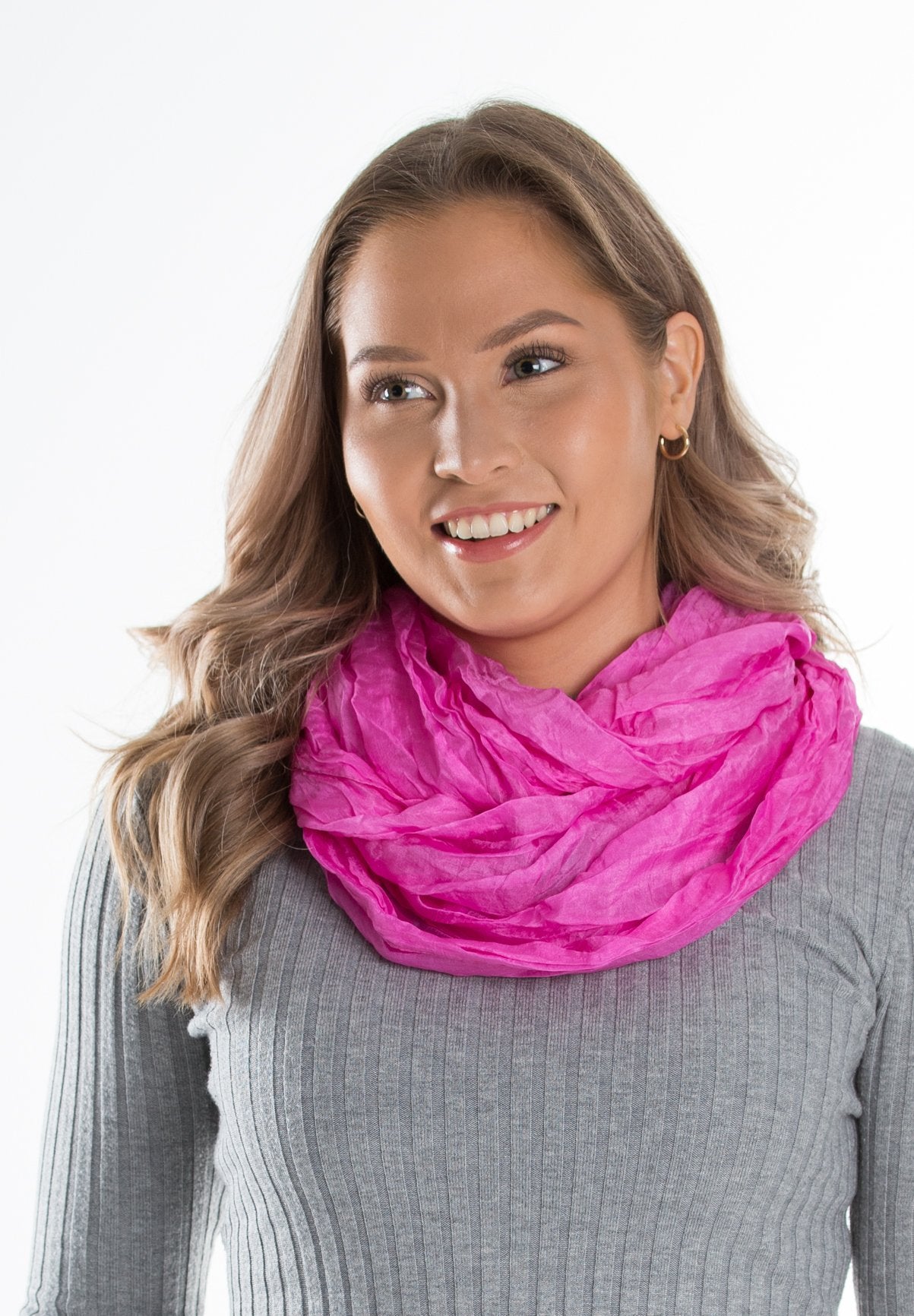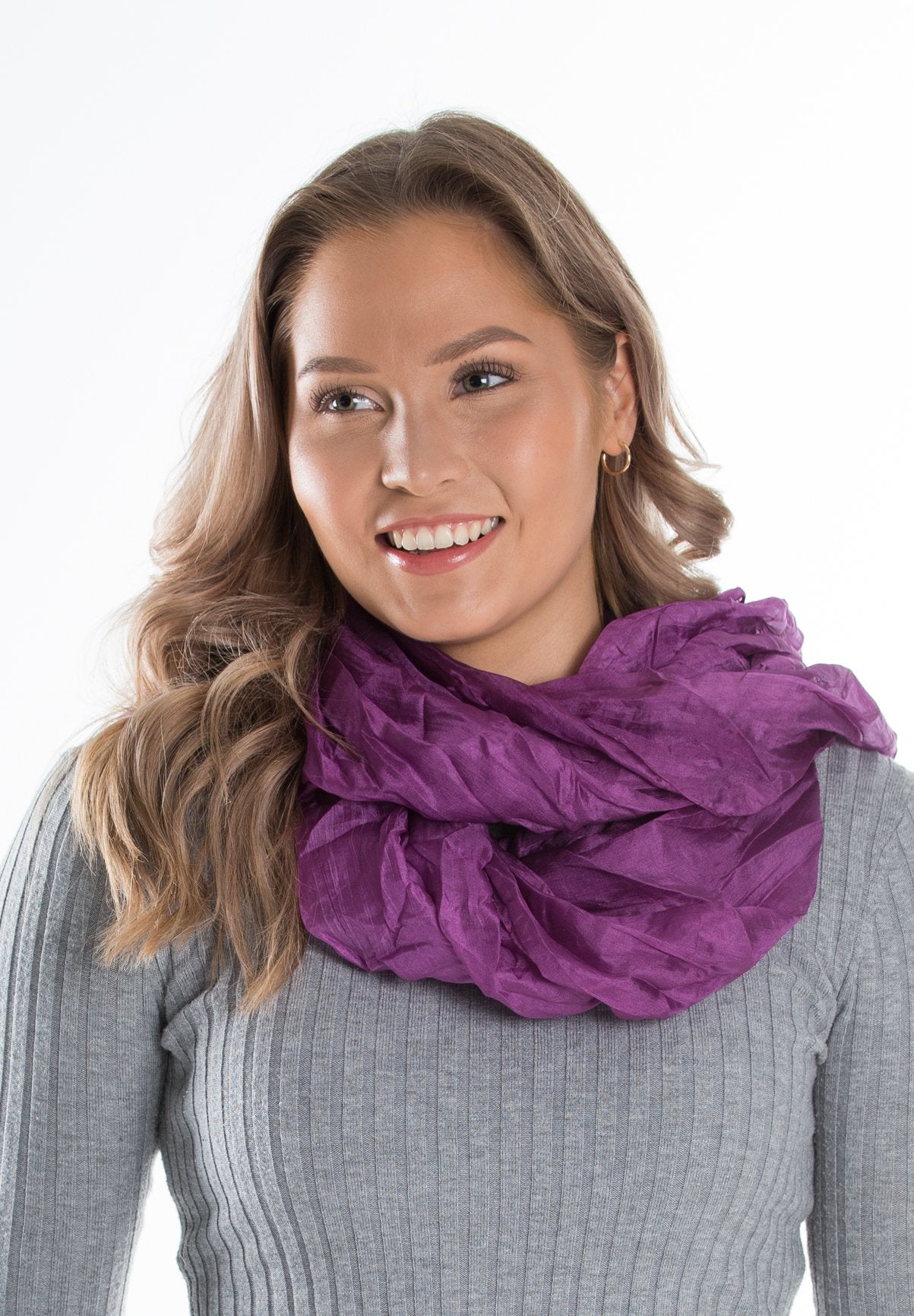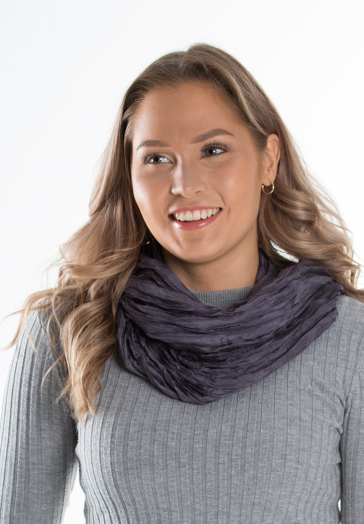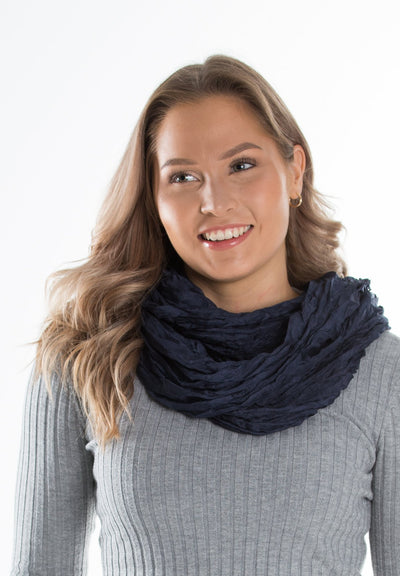 Léttur og lipur hringklútur með snúningi, sem gerir það að verkum að hann fellur vel þegar hann liggur óvafinn um hálsinn.