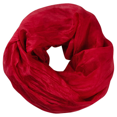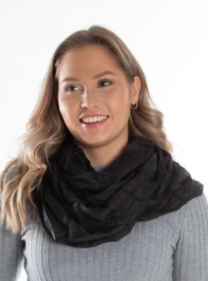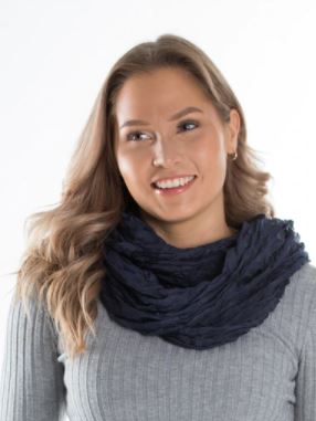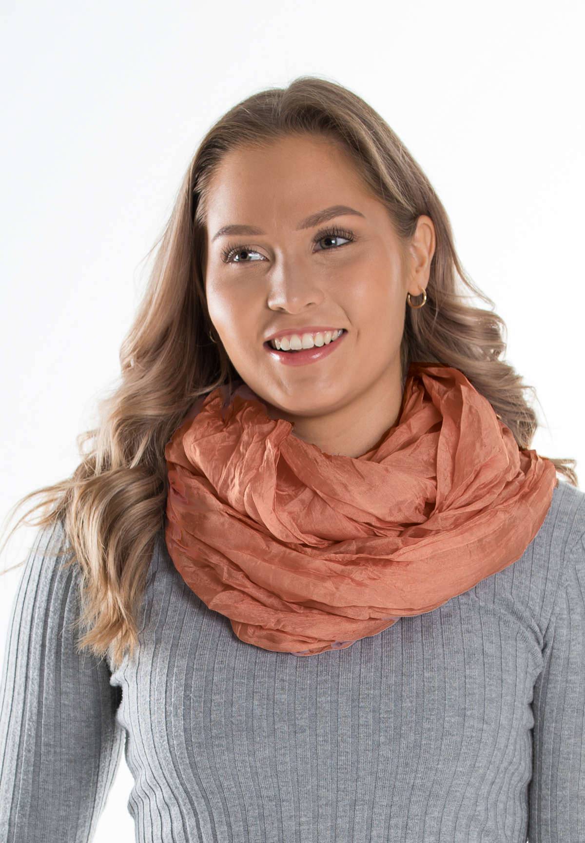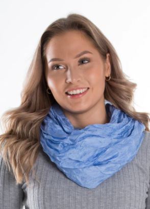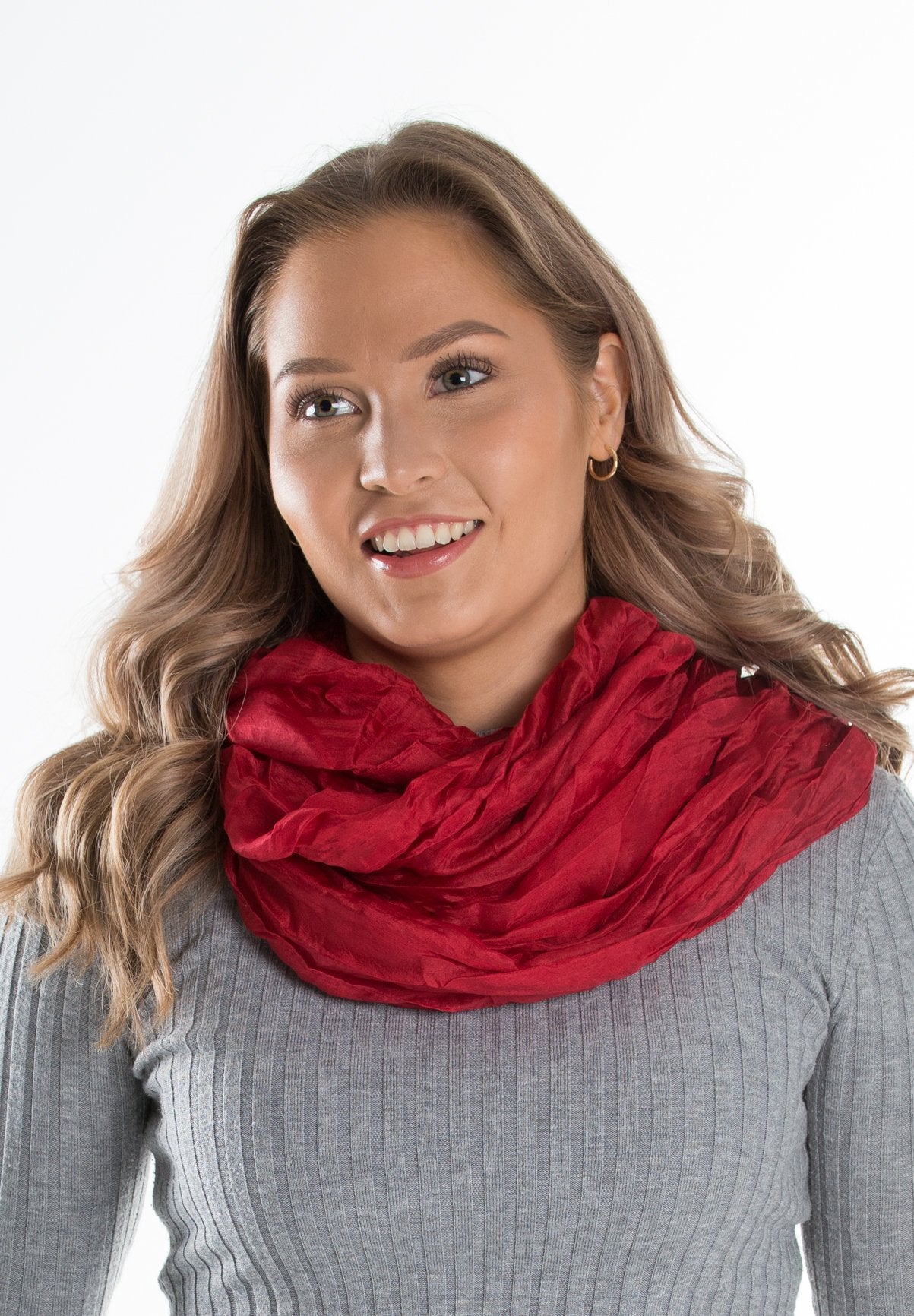 Léttur og lipur hringklútur með snúningi, sem gerir það að verkum að hann fellur vel þegar hann liggur óvafinn um hálsinn.