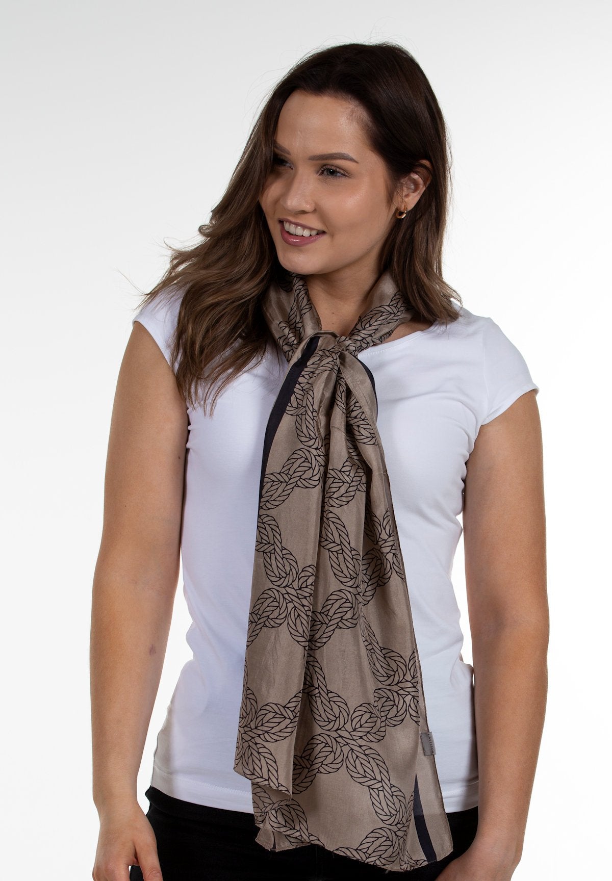 Silkiklúturinn er 50x160 cm að stærð og hentar því fullkomlega til að nota fyrir léttan hnút um hálsinn, rúlla honum upp eða nota sem hárskraut.