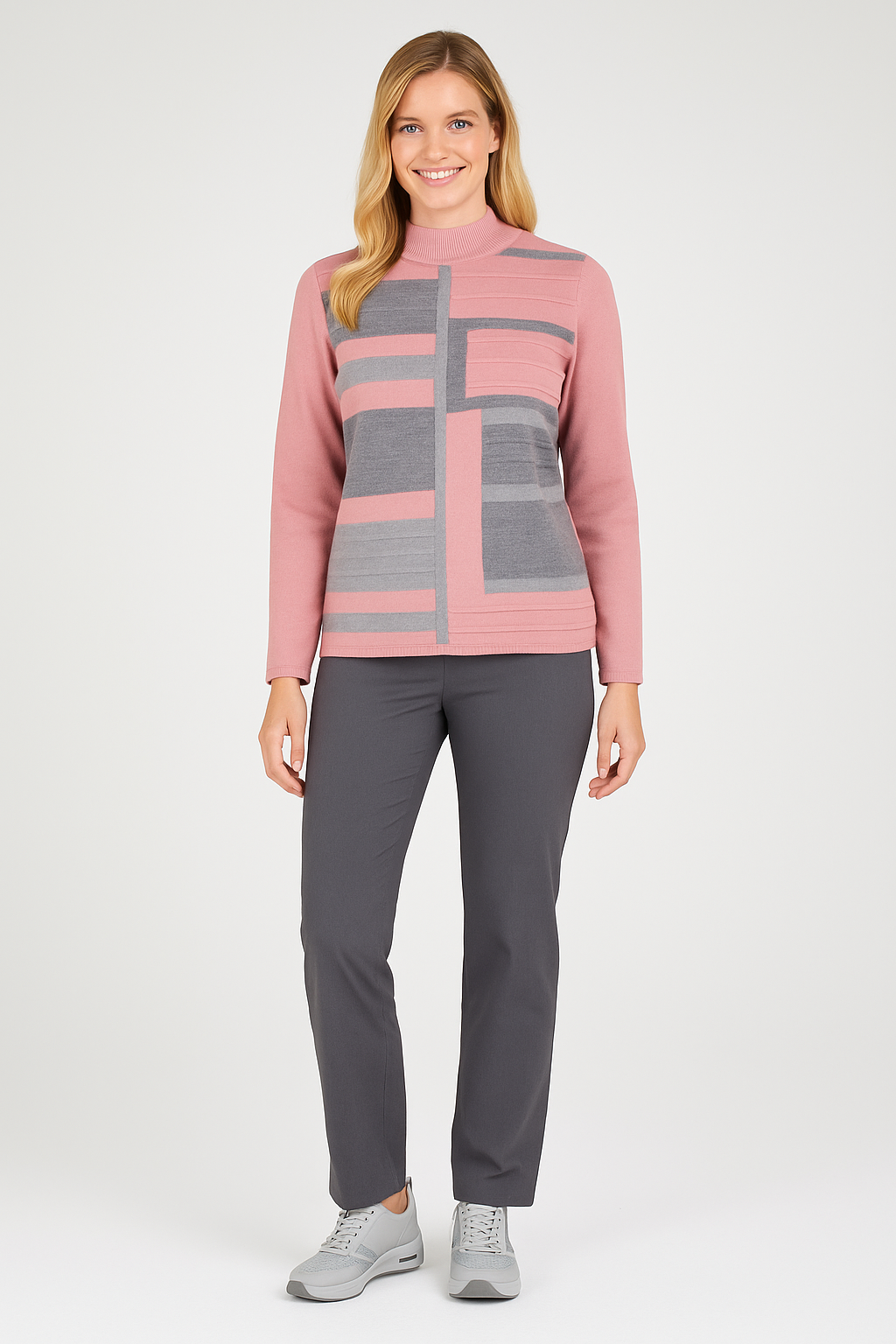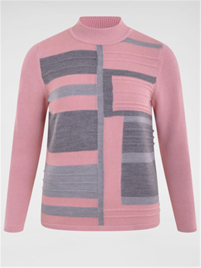 Navigazione - Caitlin er mjúk og sæt peysa með kraga, stoff neðst á ermum, að neðan og í hálsmáli. Bleik og ljósgrá að framan.