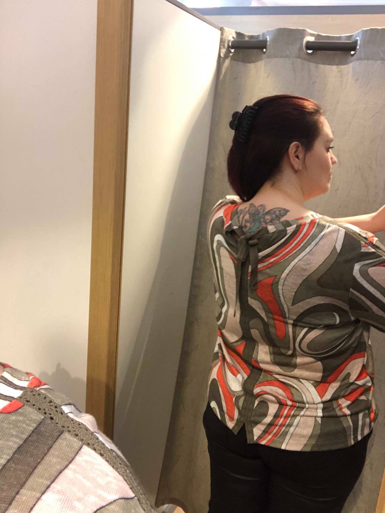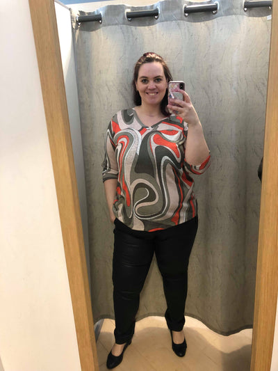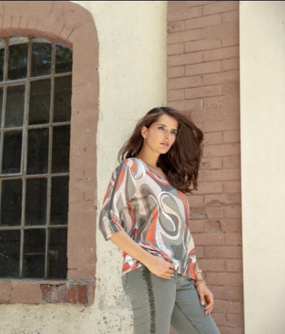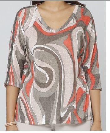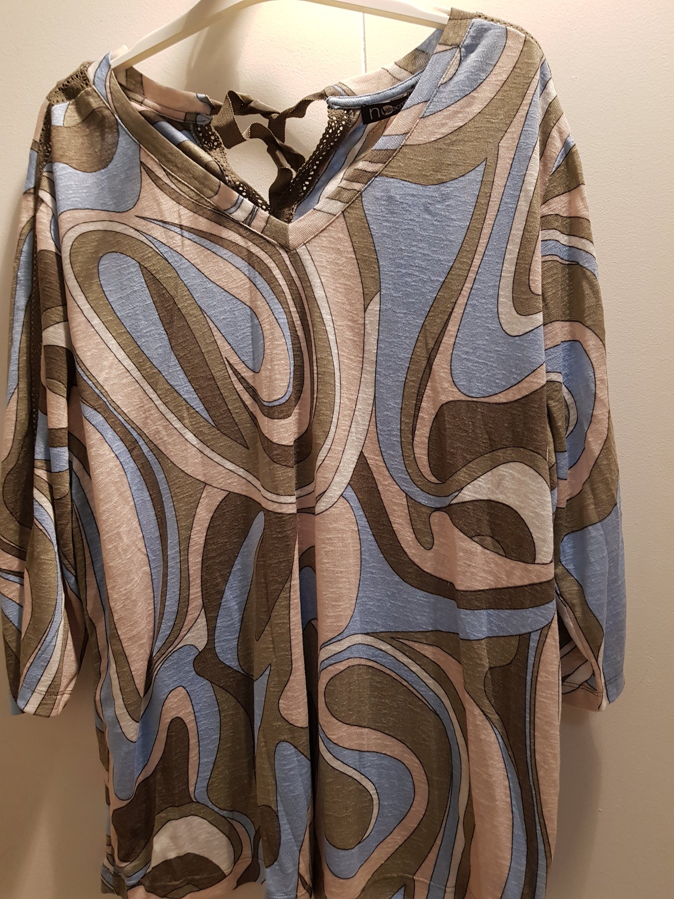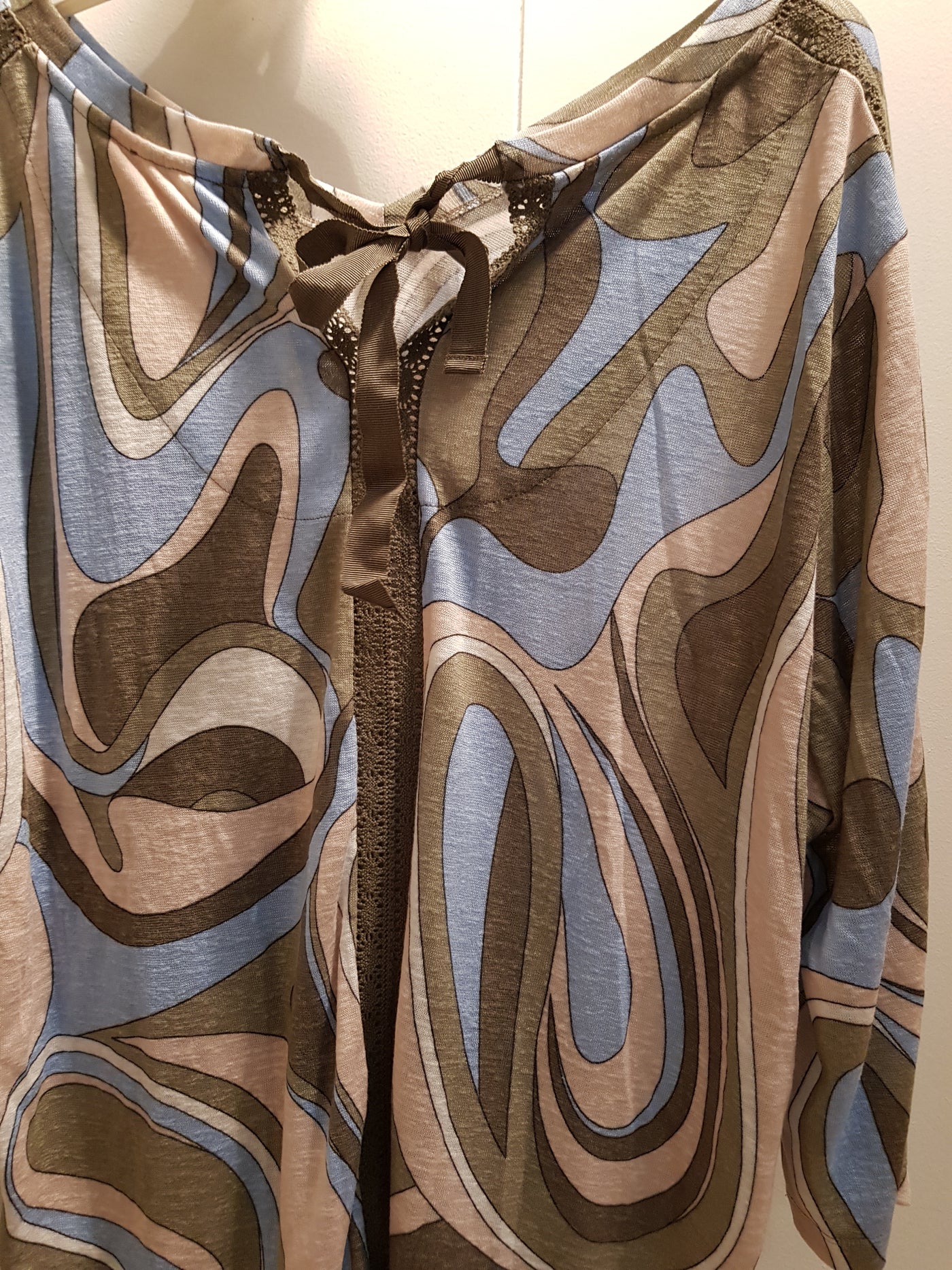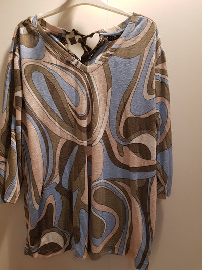 Mynstraður kvartermabolur með V-hálsmáli og bandi í hálsmáli á baki.