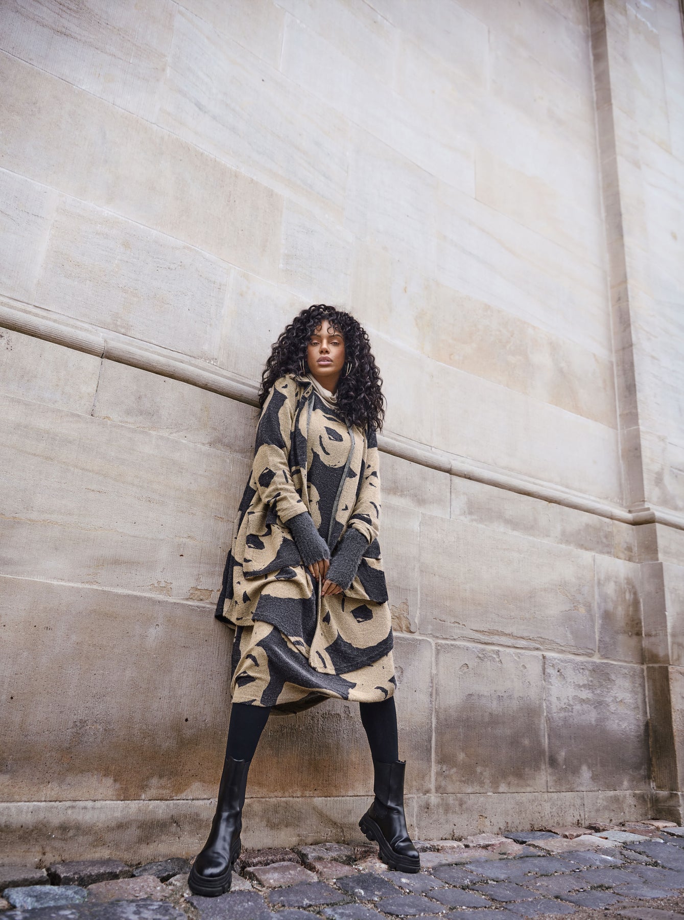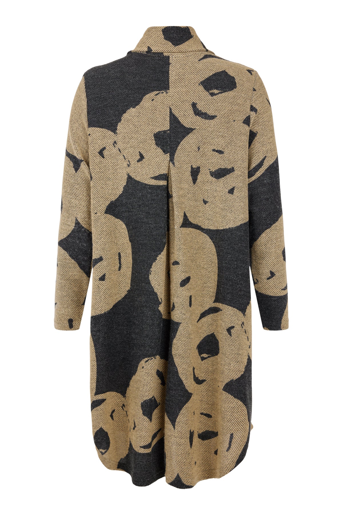 Noen - Vanessa flott og vönduð jakkapeysa. Hneppt að framan, langar ermar, kragi, vasar að framan, felling í baki sem gefur betri vídd. Beige í grunninn með dökkgráu mynstri.