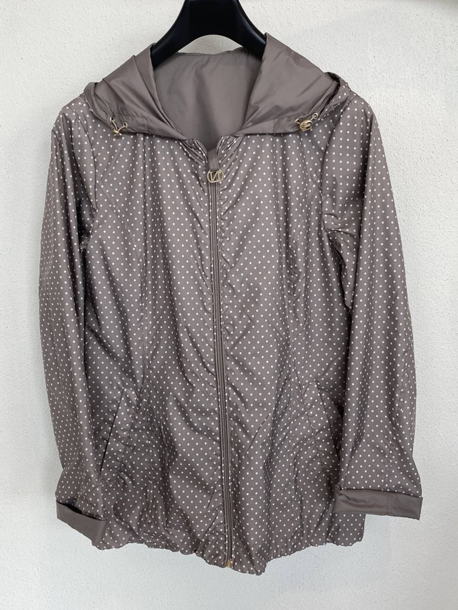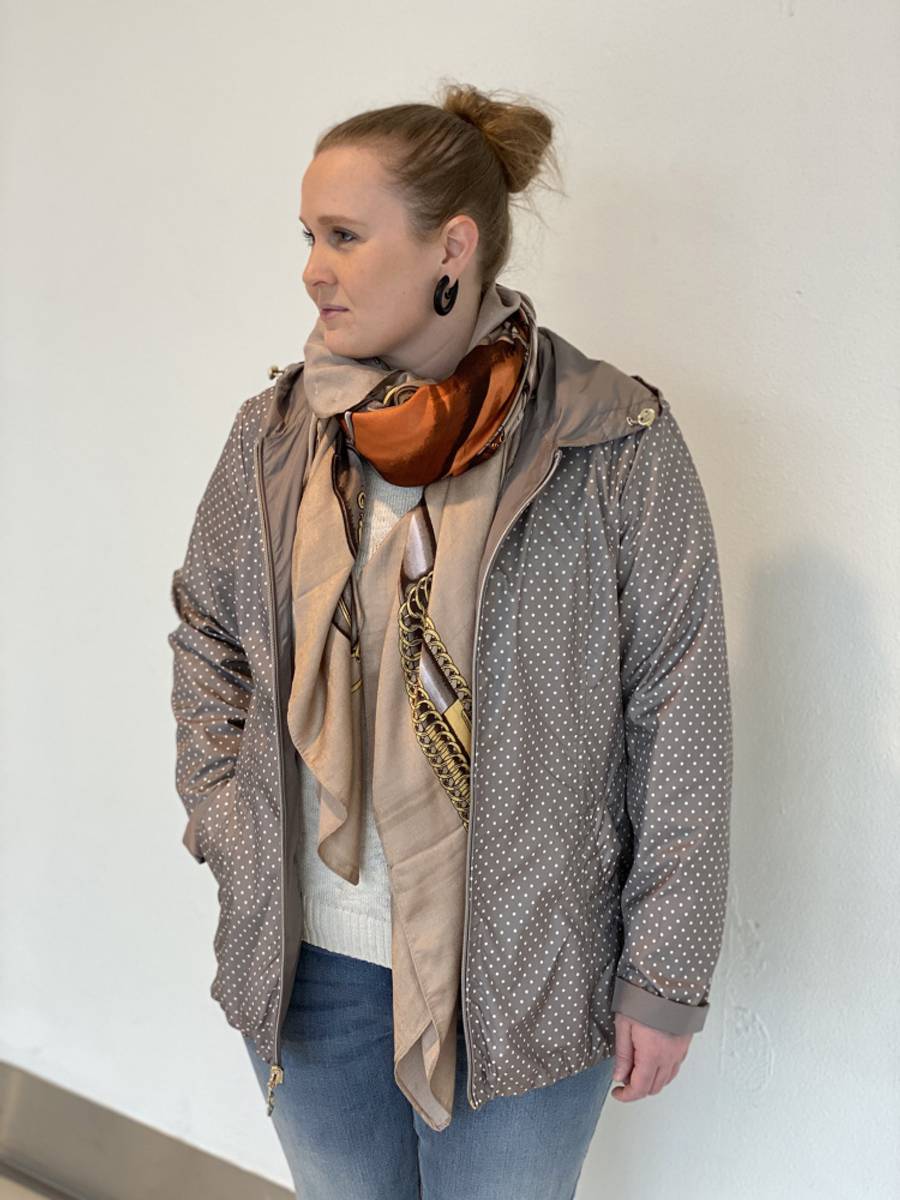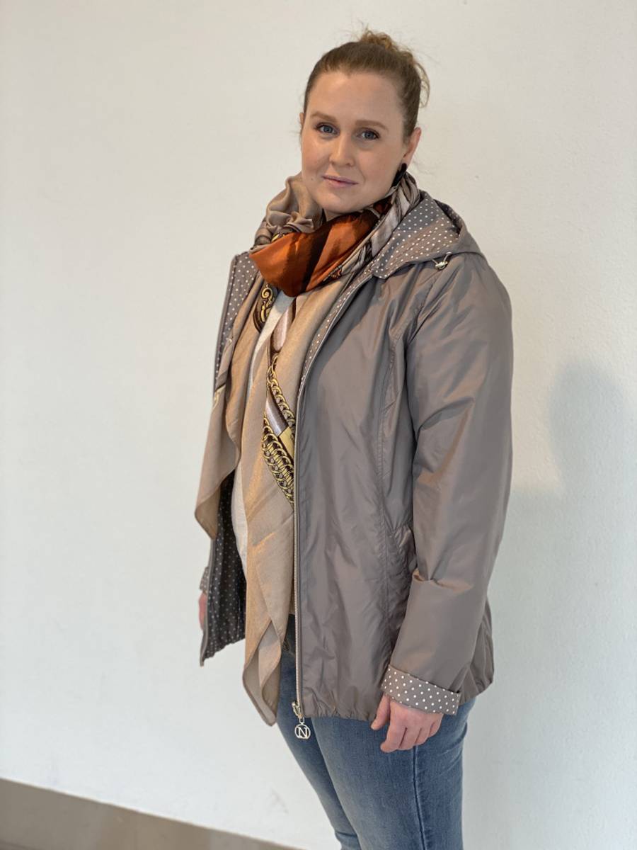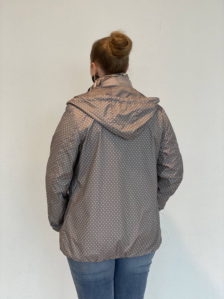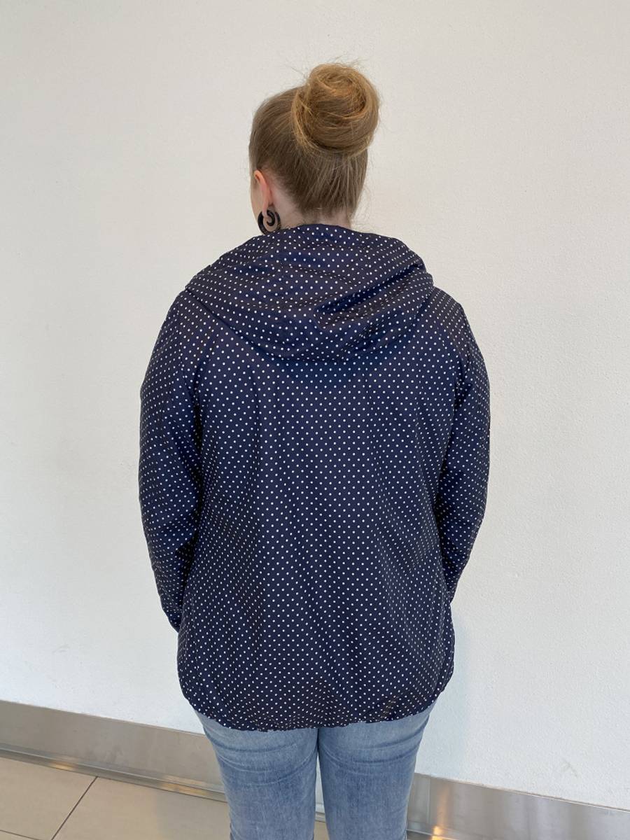 Normann - Jacey léttur jakki/vendingur. Gott snið, rennilás að framan, góðir hliðarvasar, hetta sem er hægt að draga saman, poki úr sama efni og jakkinn fylgir með. Jakkinn er einlitur öðru megin og doppóttur hinu megin.