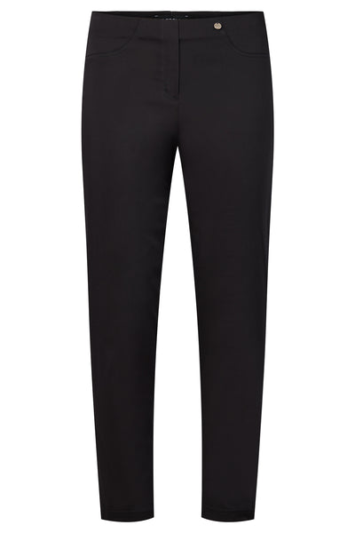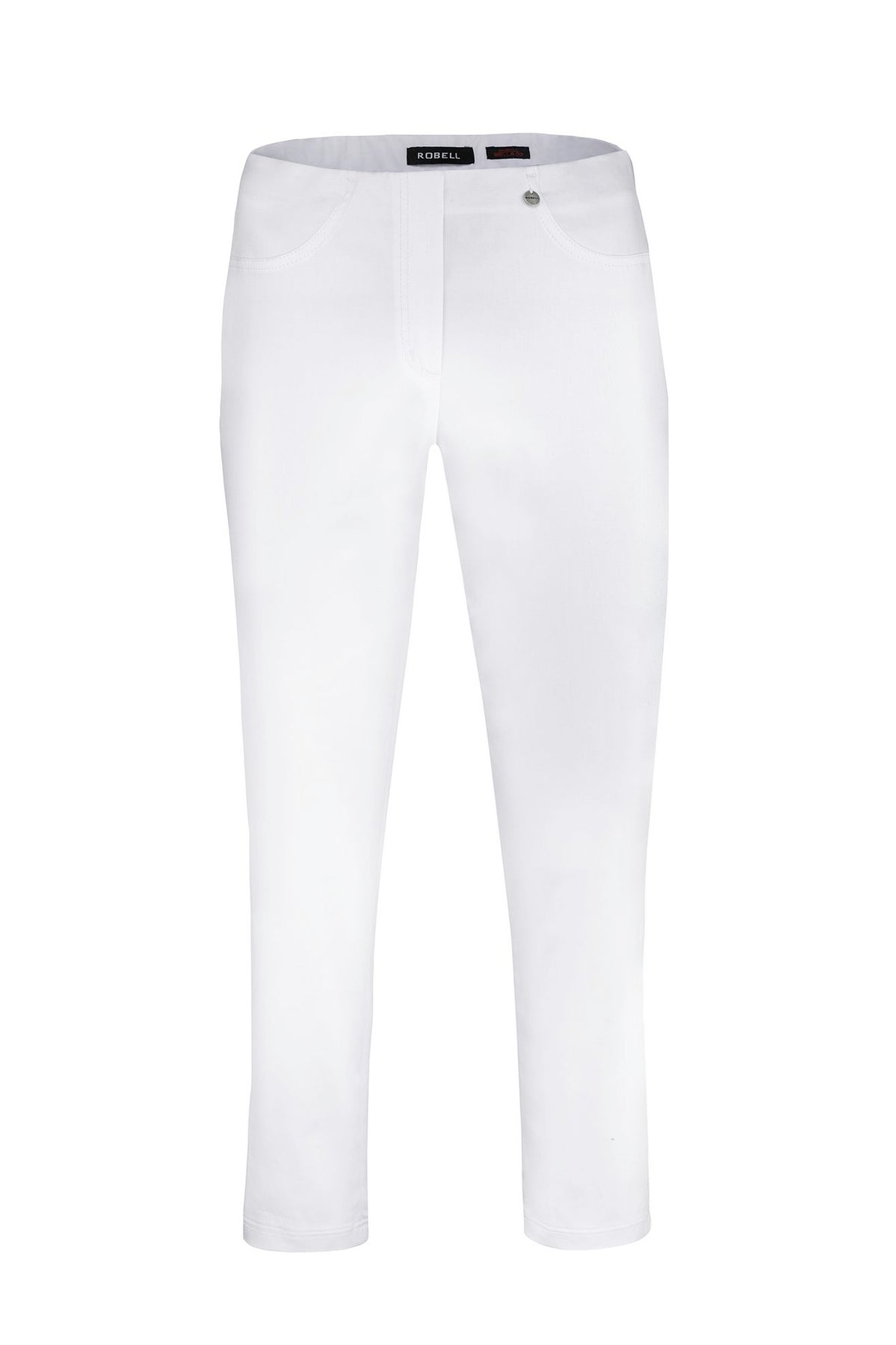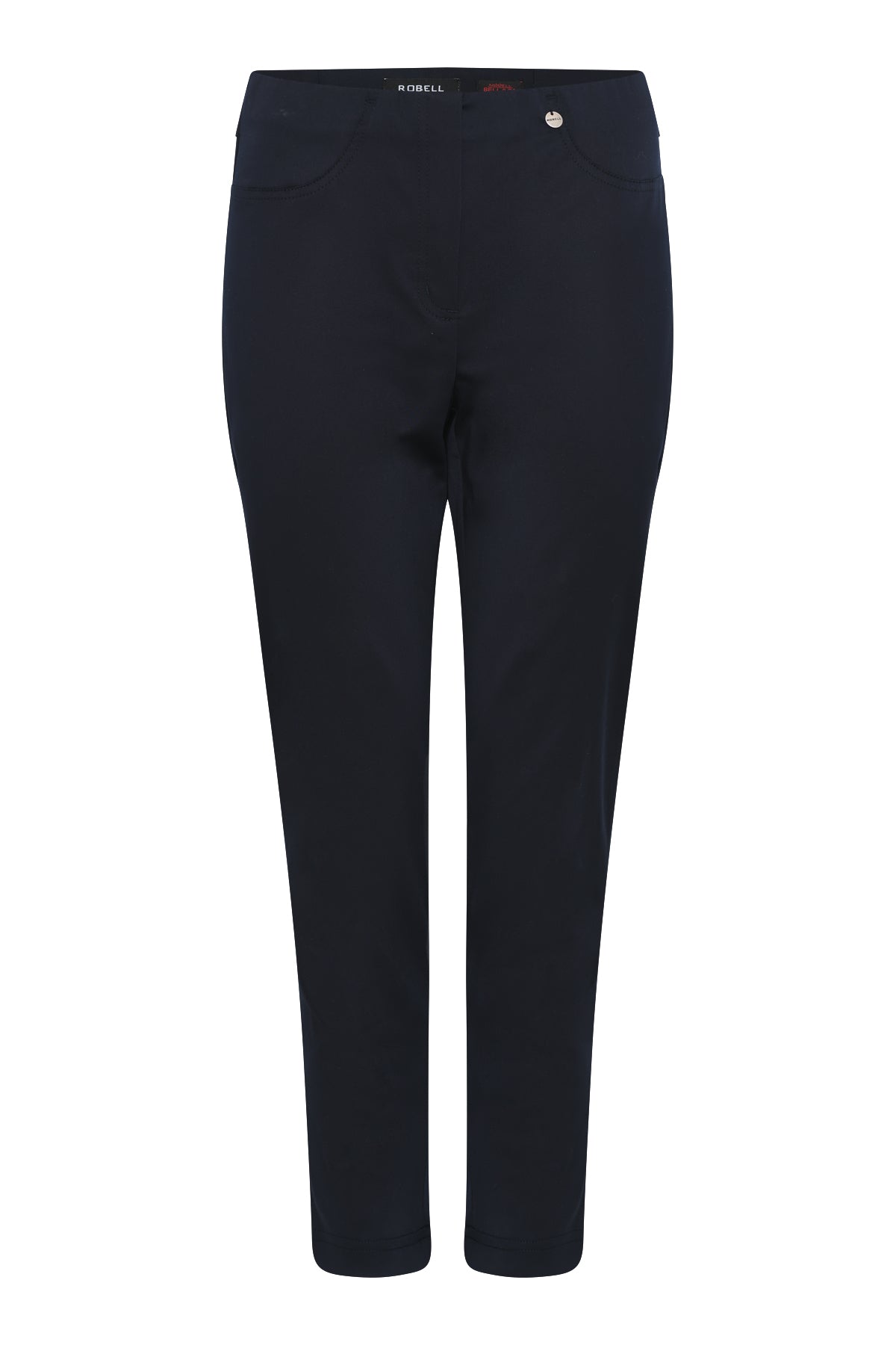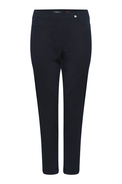Robell - Bella09 ökklasíðar strechbuxur með teygju í mittið, rennilásaklauf að framan, en það er bara fyrir útlitið, eins eru saumar fyrir vasa, en þær eru vasalausar að framan en með ágætum rassvösum. Þessar eru úr aðeins sparilegra bómullarefni en þessar klassísku og því með minni teygju.Örlítill glans á efninu.
