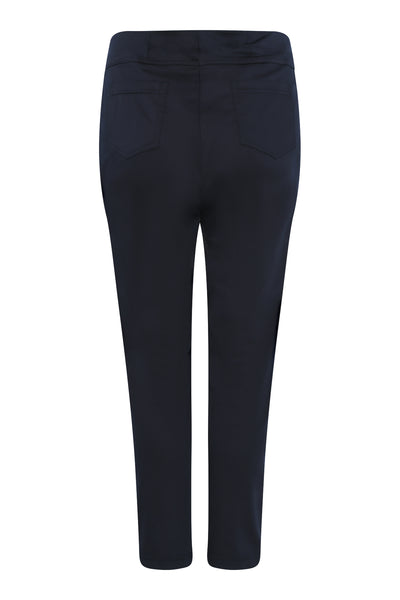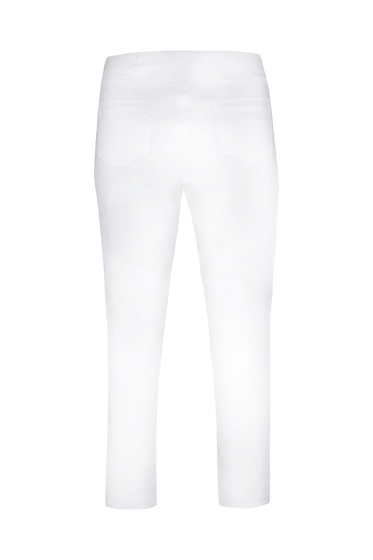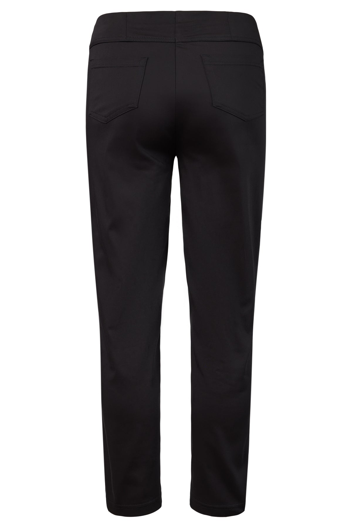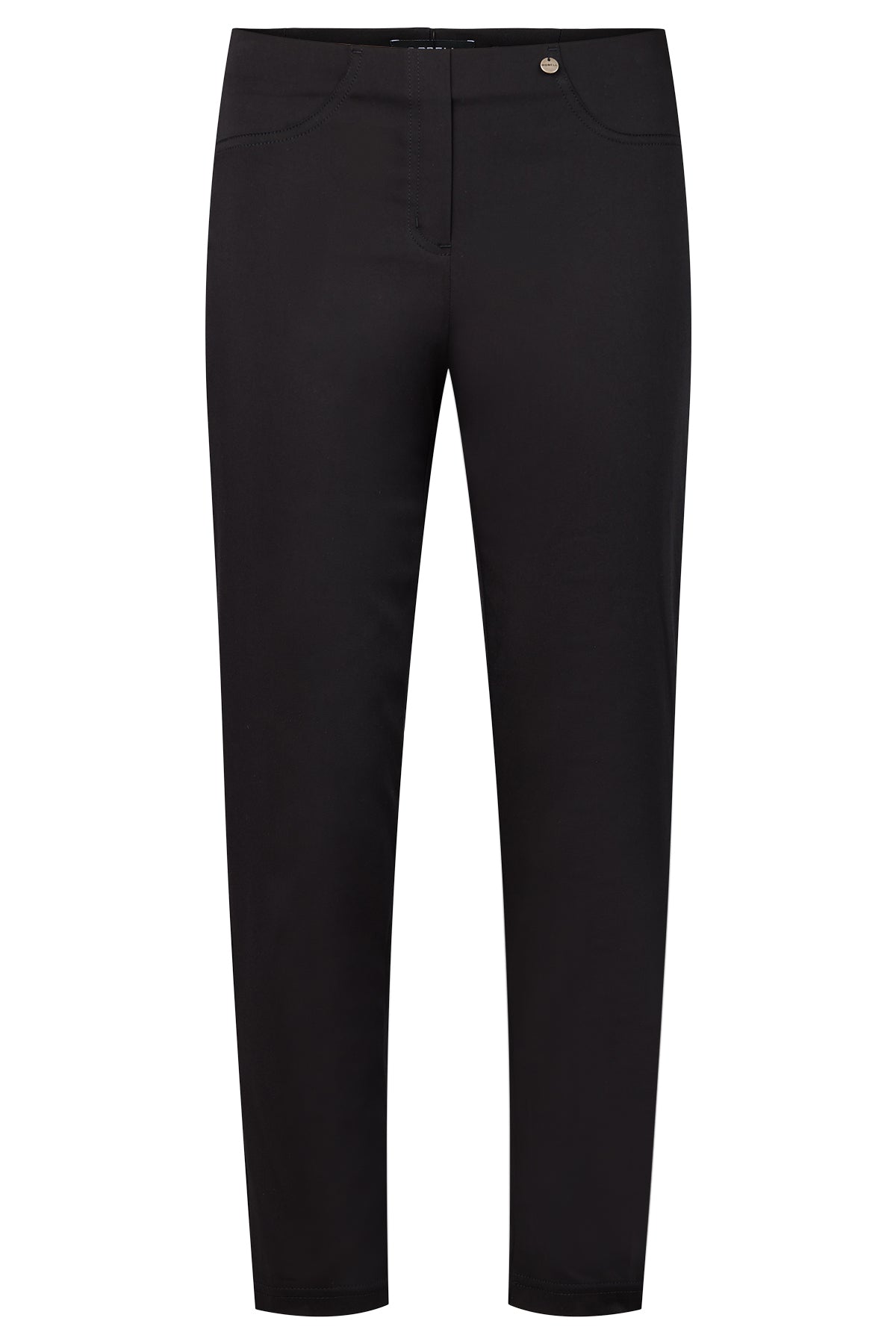Robell - Bella09 ökklasíðar strechbuxur með teygju í mittið, rennilásaklauf að framan, en það er bara fyrir útlitið, eins eru saumar fyrir vasa, en þær eru vasalausar að framan en með ágætum rassvösum. Þessar eru úr aðeins sparilegra bómullarefni en þessar klassísku og því með minni teygju.Örlítill glans á efninu.