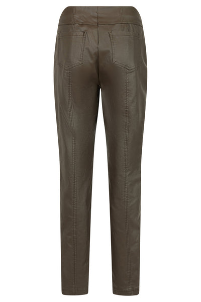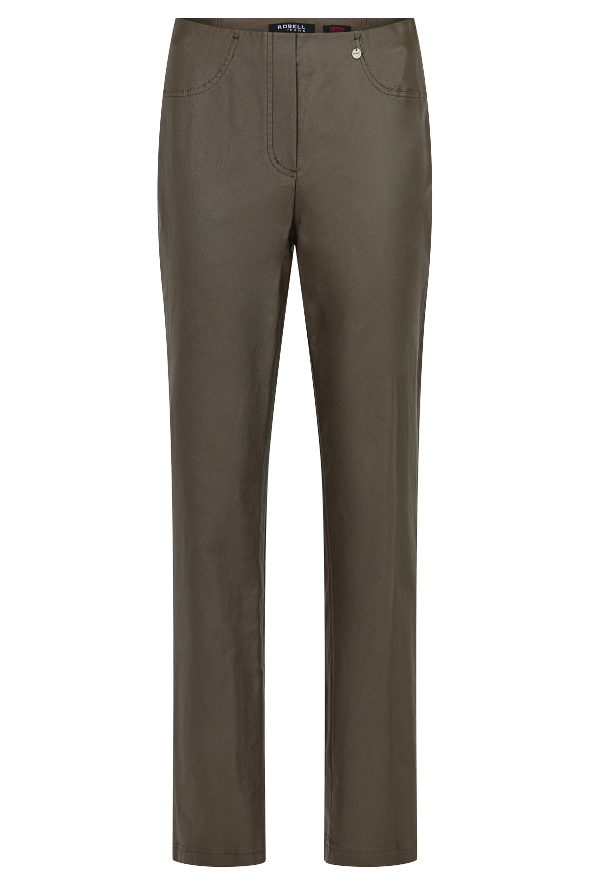 Robell - Bella - flottar pleðurbuxur með teygju í mittið, rennilásaklauf að framan, en það er bara fyrir útlitið, eins eru saumar fyrir vasa, en þær eru vasalausar að framan en með ágætum rassvösum. Saumar niður skálmar að aftan gefa skemmtilegt og sportlegt útlit. Flottar pleðurbuxur sem sitja vel, góðar stærðir og mikið strech í efni.