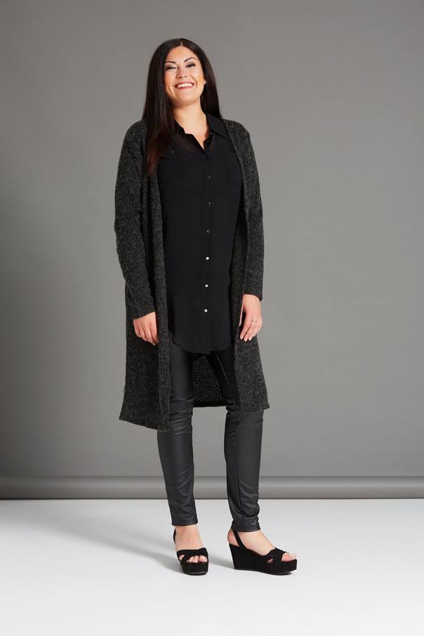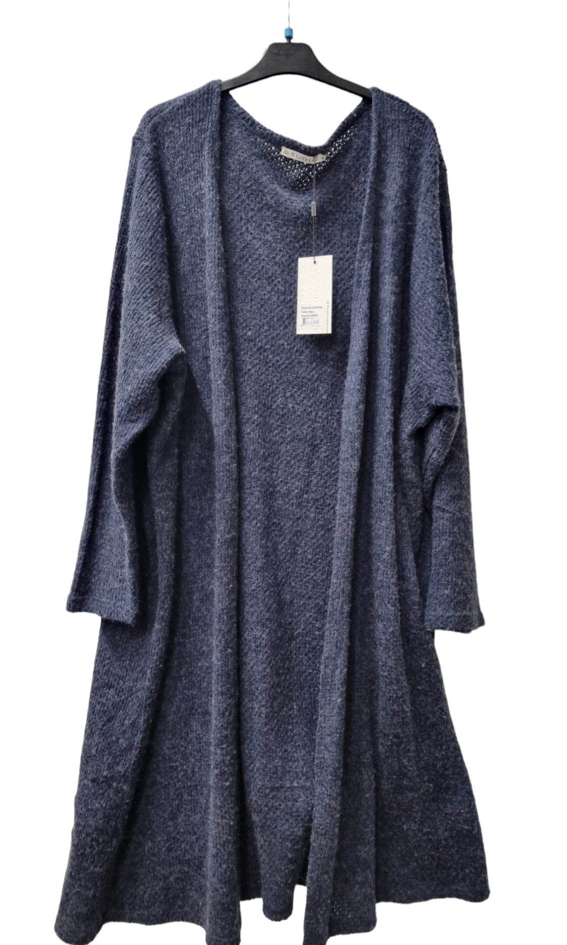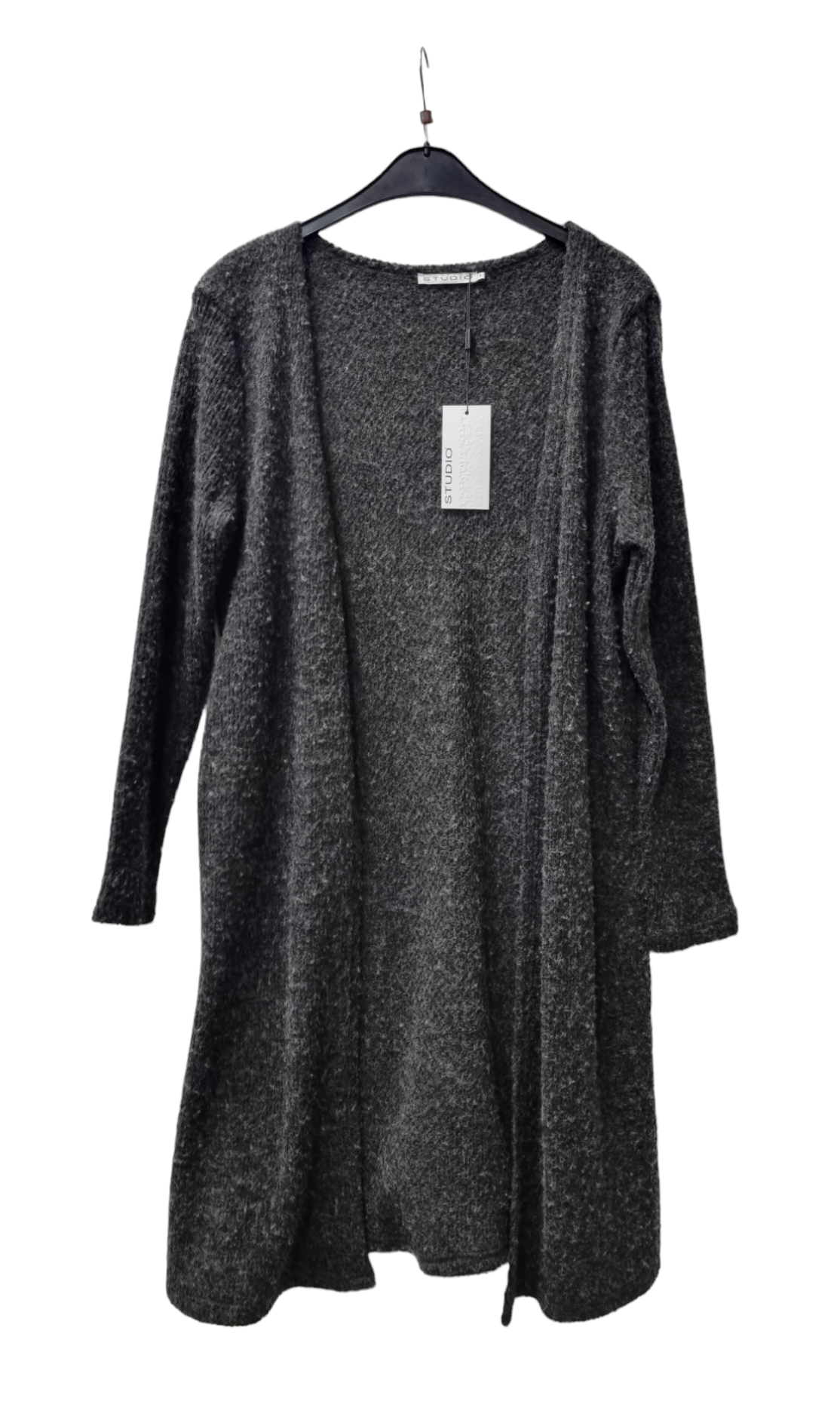 Studio, síð opin prjónapeysa úr góðu ullarblönduðu efni.