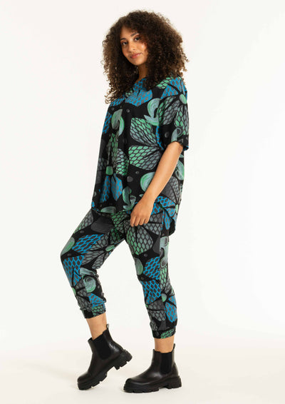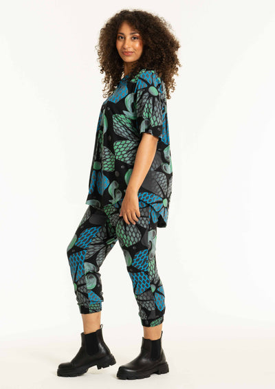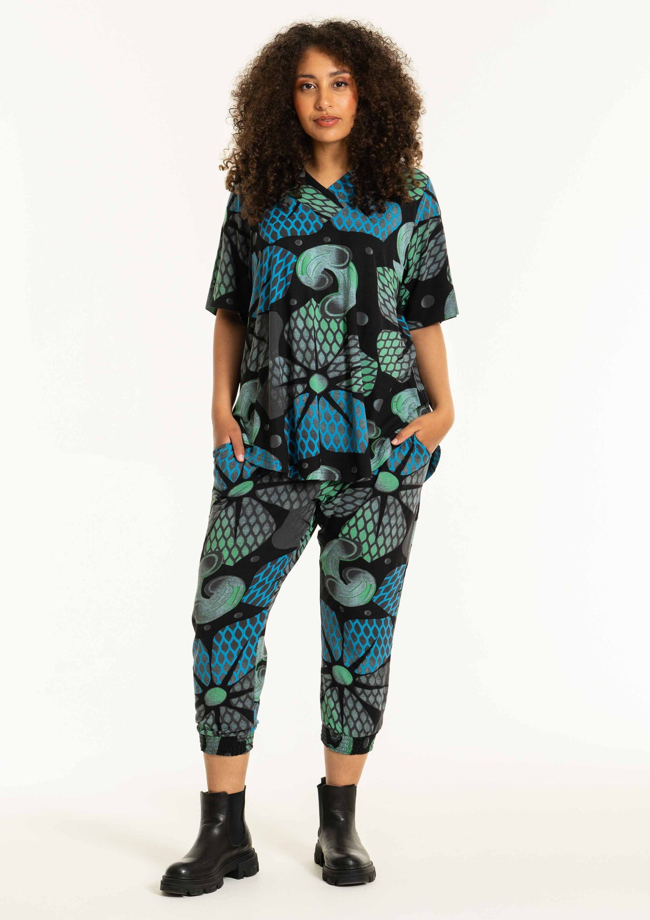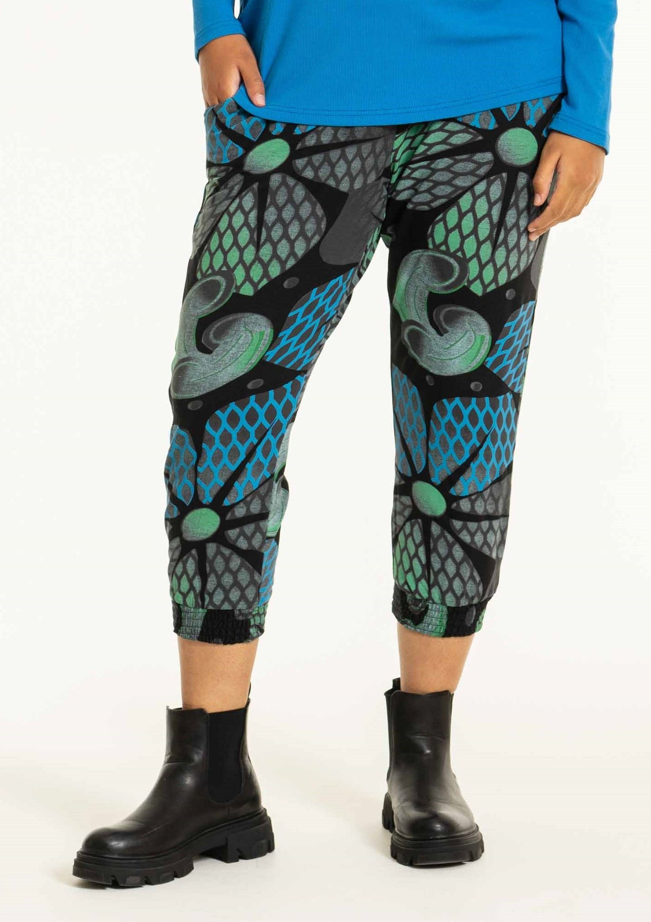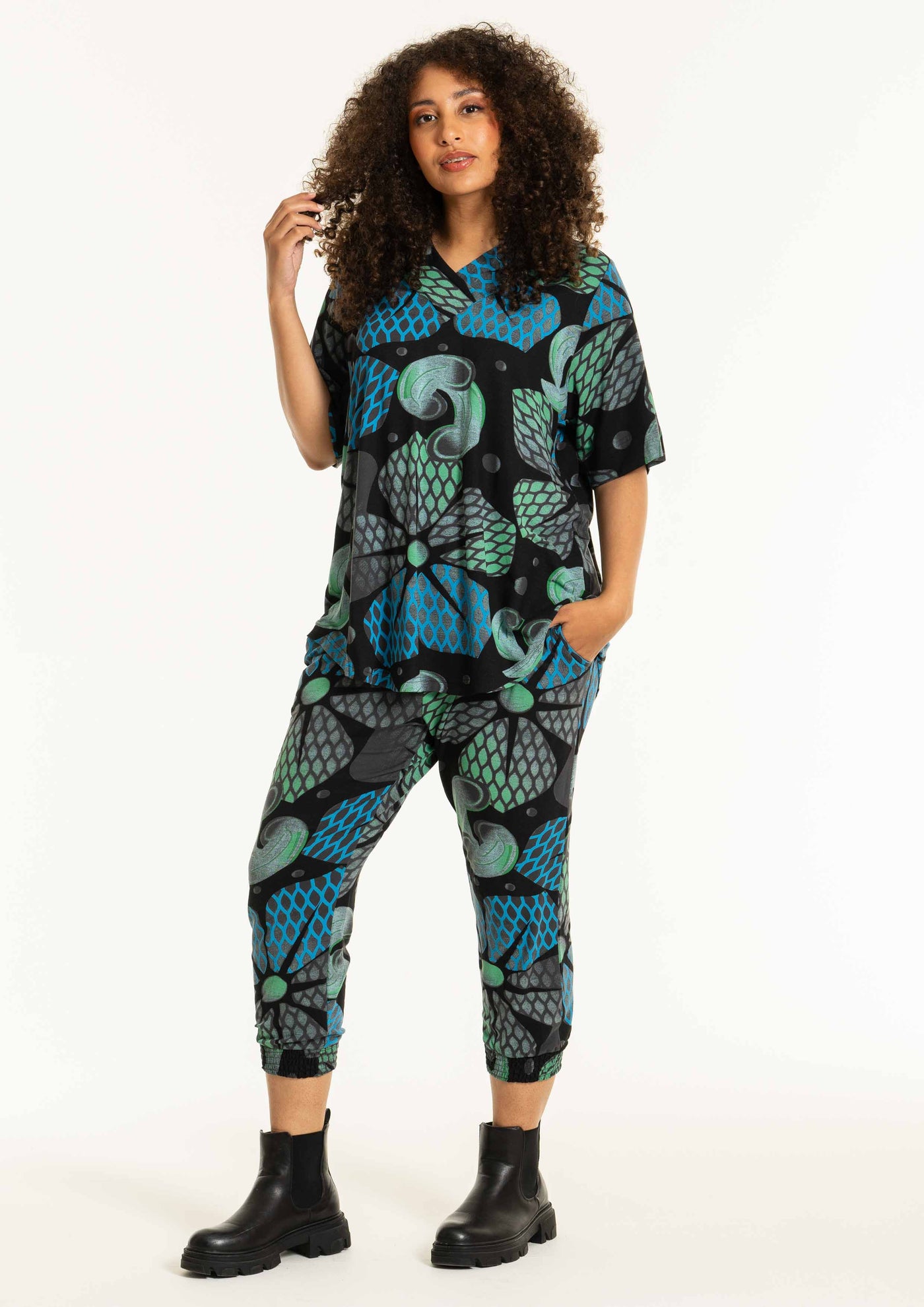 Studio - Gudrun sportlegar og þægilegar mynstraðar kvartbuxur með stroffi að neðan úr mjúku viscose efni, opnir hliðarvasar og teygja í mitti sem er slétt að framan og rykkt að aftan.