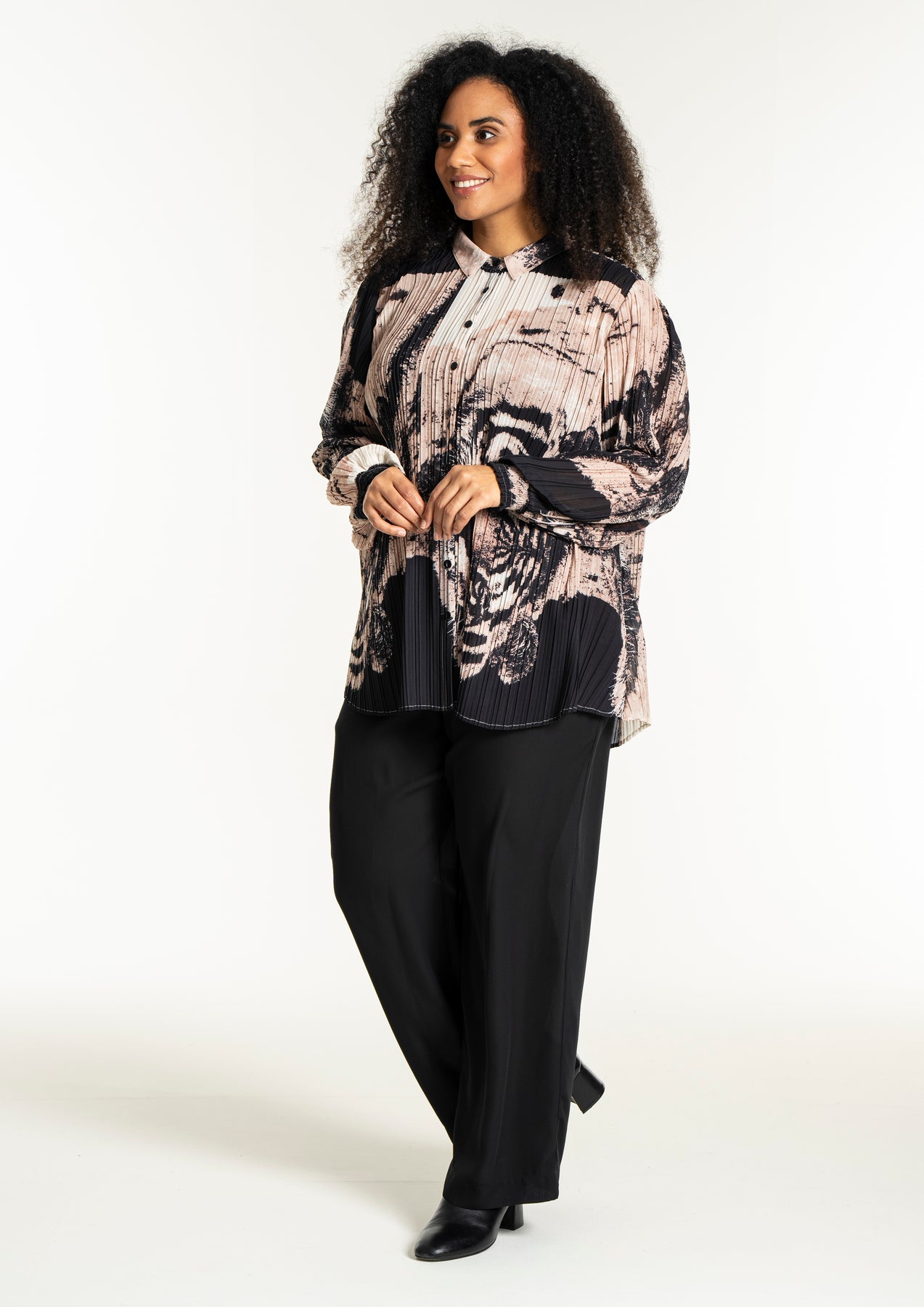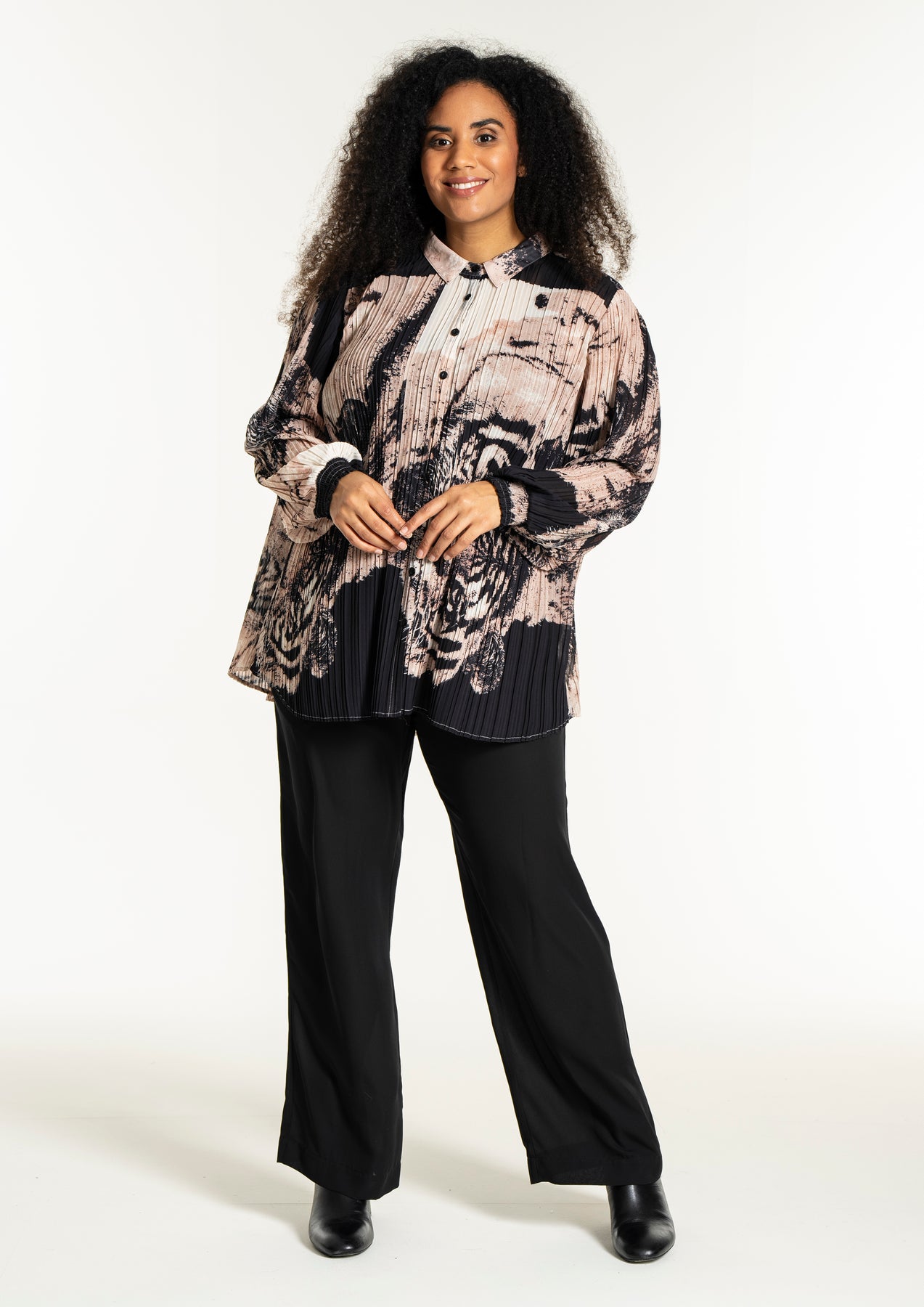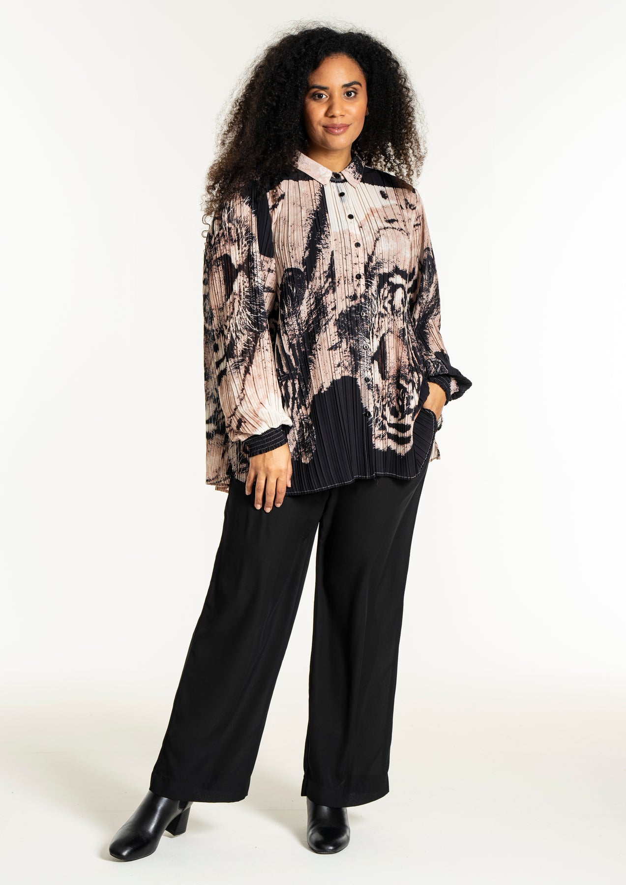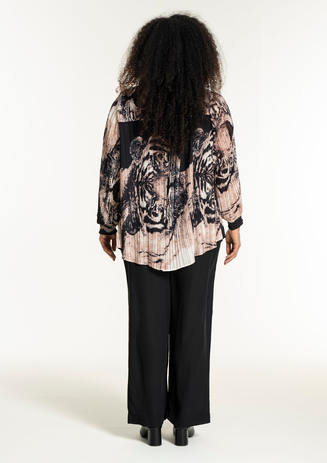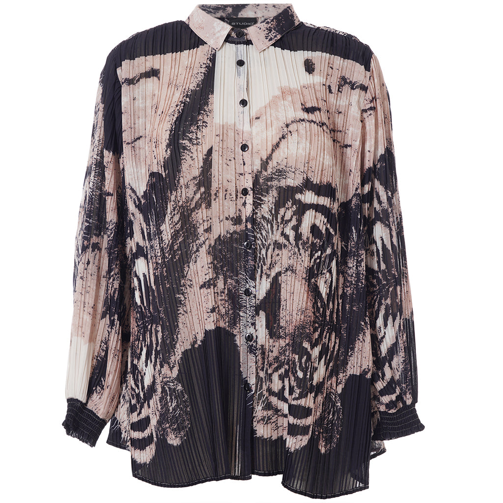 Studio - Norah plíseruð skyrta með tígrisdýrum. Skyrtukragi, hneppt að framan, langar ermar með teygju, rúnuð að neðan, felling í baki sem gefur betri vídd.