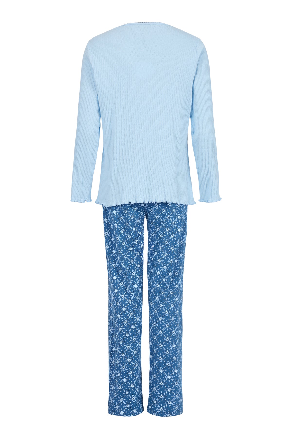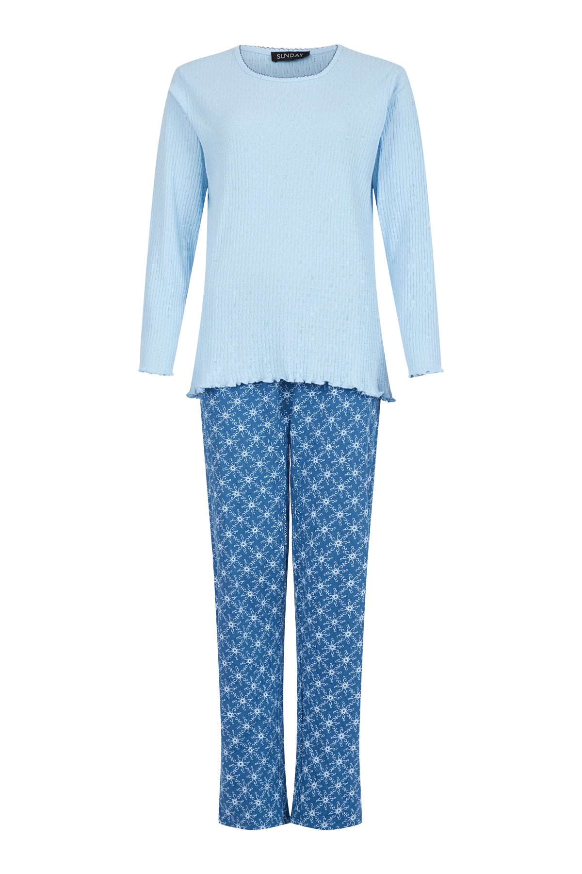 Sunday - Mariela mjúkt og notalegt náttfata sett. Mynstraðar buxur, beinar niður, einlitur langermabolur með rúnuðu hálsmáli. Settið er úr 100% bómull.
