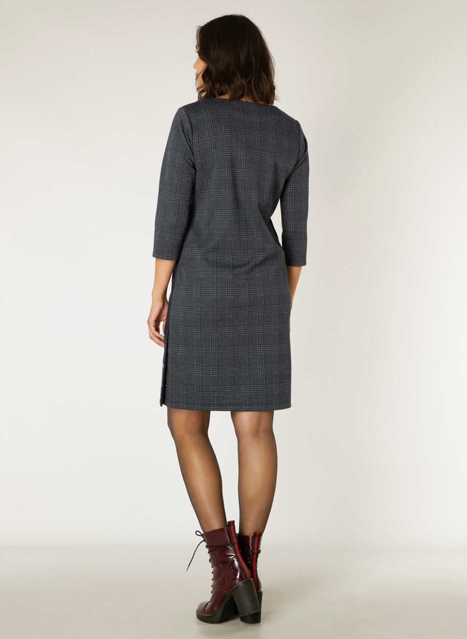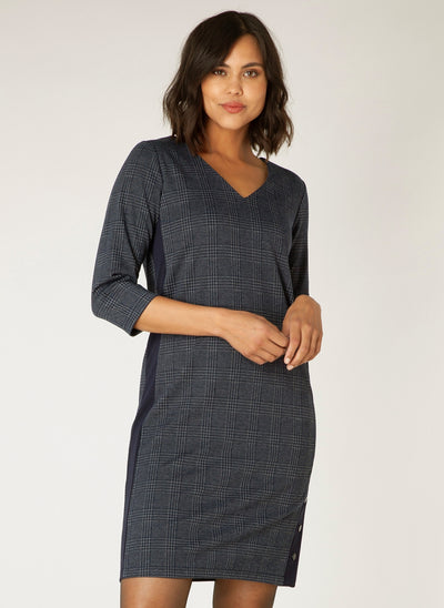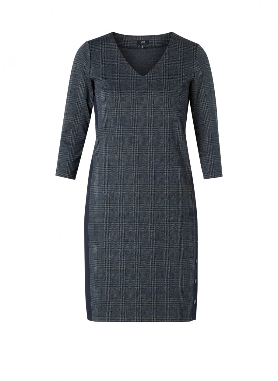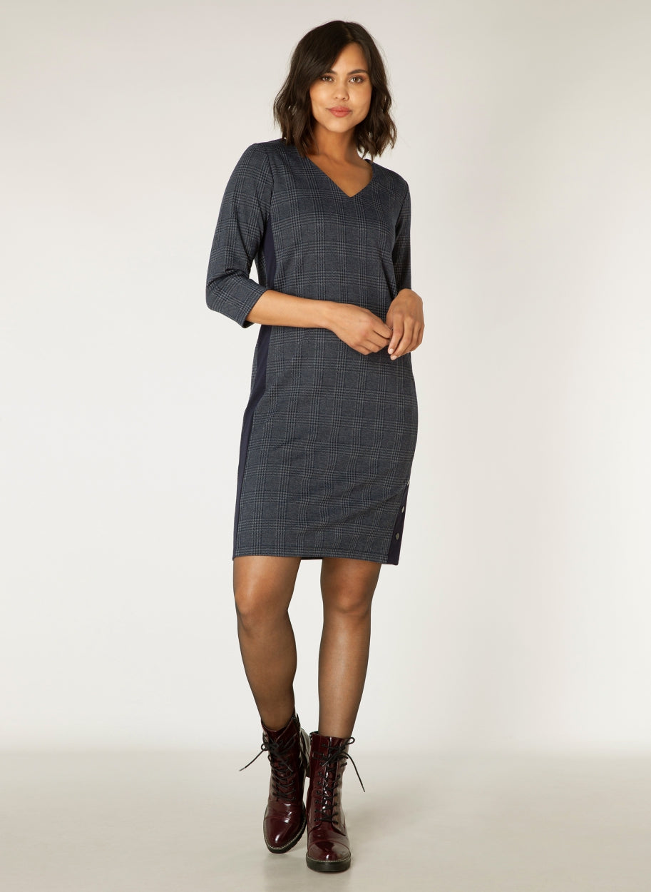 Yest hnésíður kjóll með rönd á hliðum með smellum neðst sem gefur skemmtilegan svip, V-hálsmál og kvartermar.