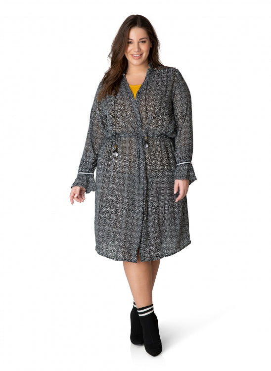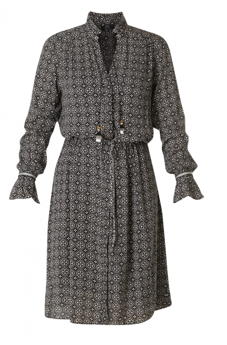 YestA, skyrtukjóll, V-hálsmál með bandi, smá pífa á ermum og hægt að draga saman með bandi í mitti.