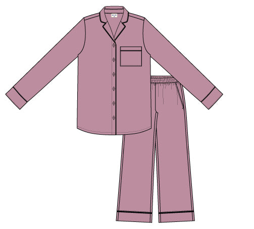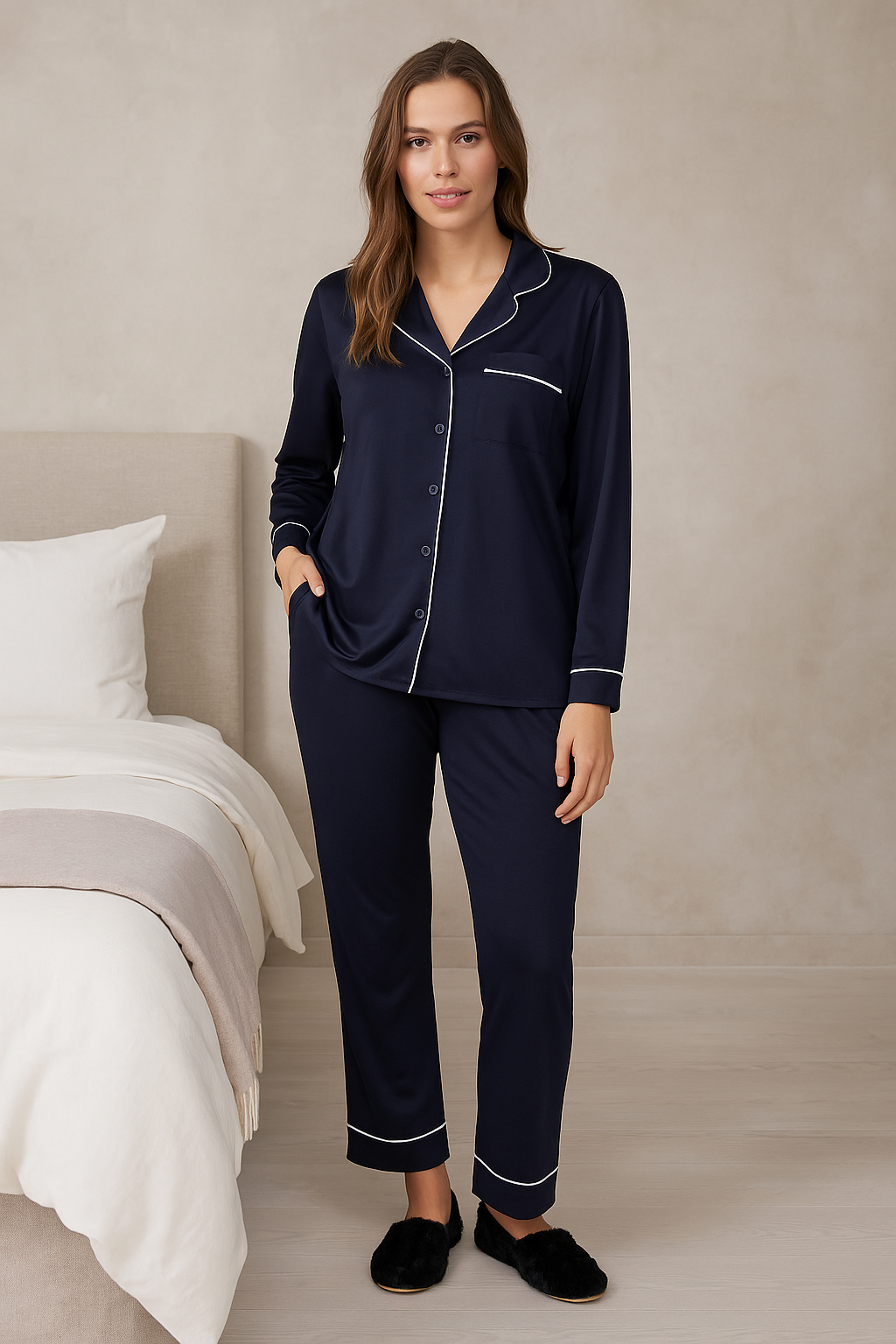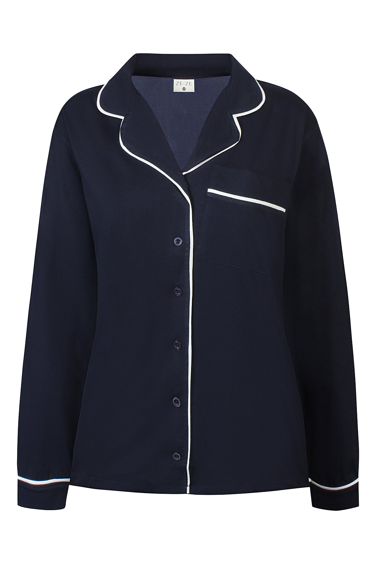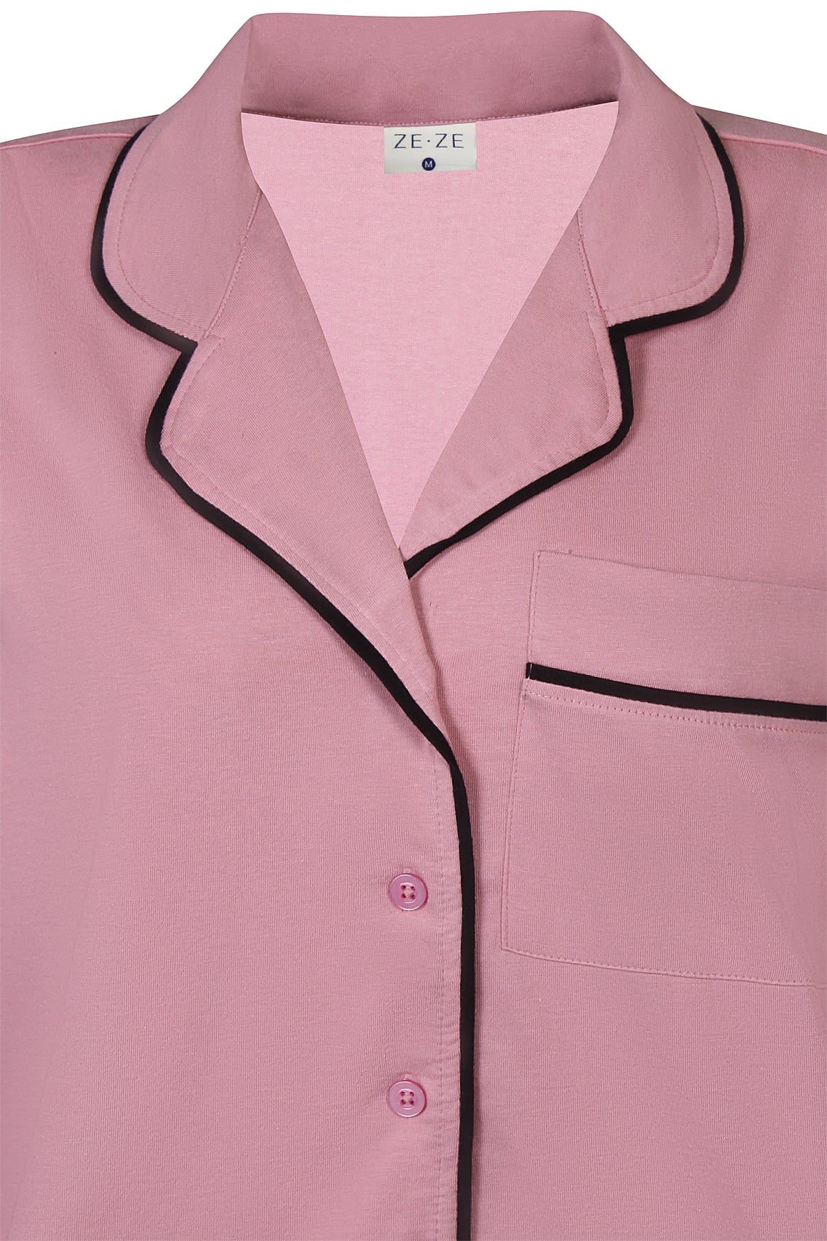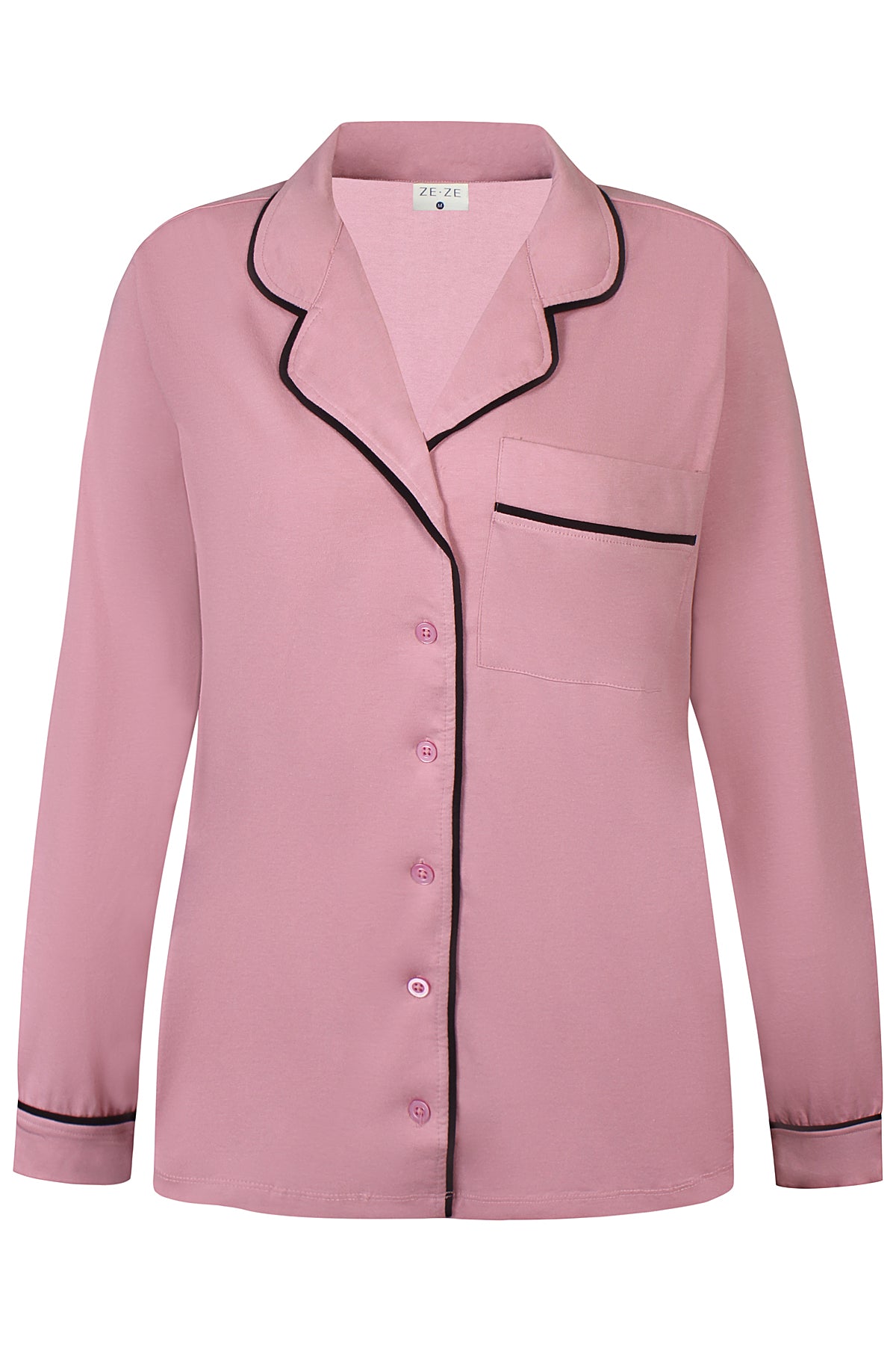 Ze-Ze, Aria mjúkt og notalegt náttfata sett. Síðar buxur með vösum og hneppt skyrta með kraga og brjóstvasa.