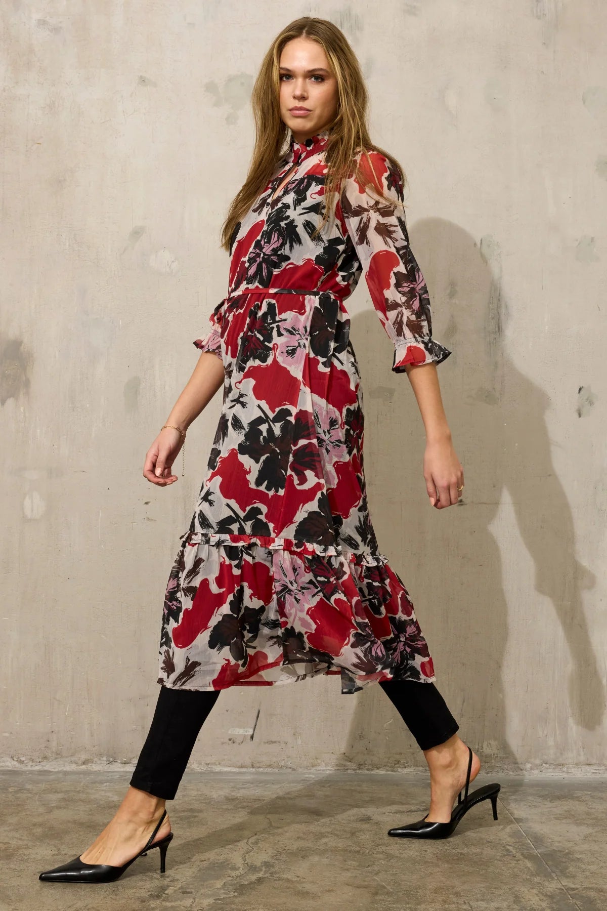 Rauður grunnur með ljóum, svörtum og vínrauðu blómamynstri.