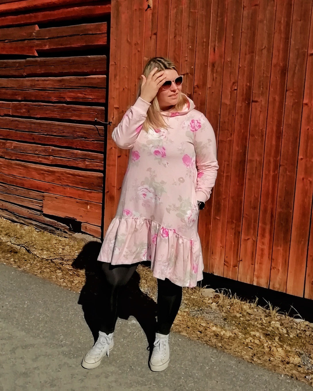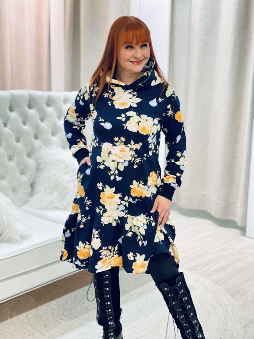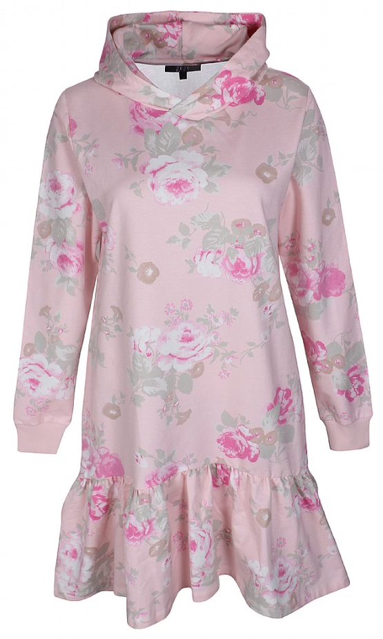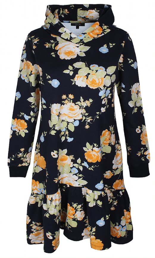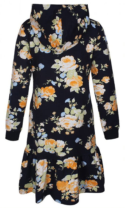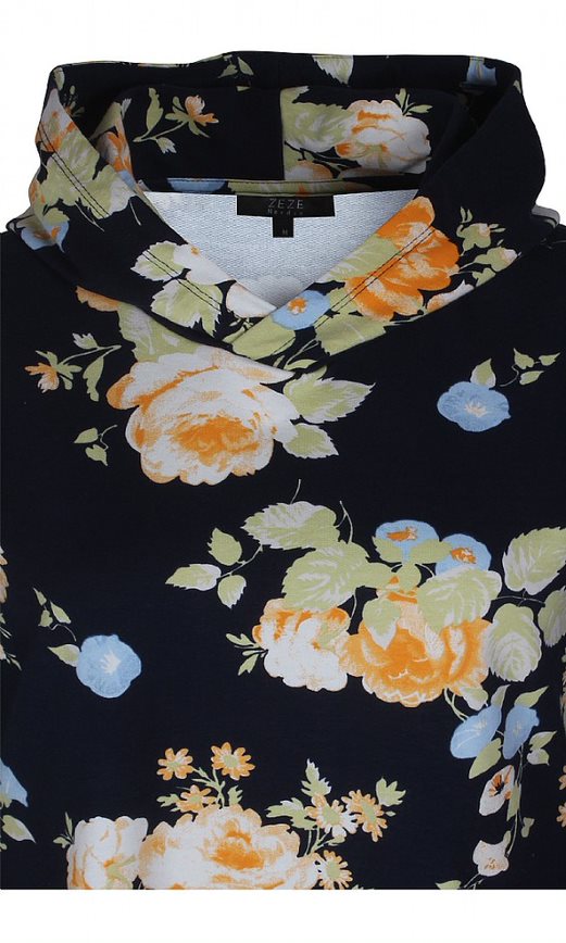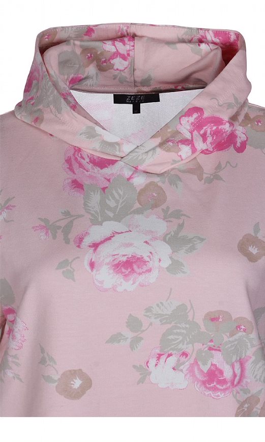 Ze-Ze kósýlegur hettupeysukjóll með blómamynstri og pífu.