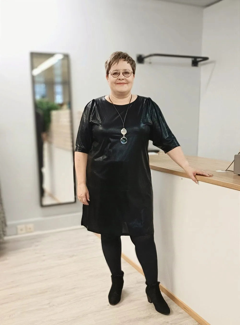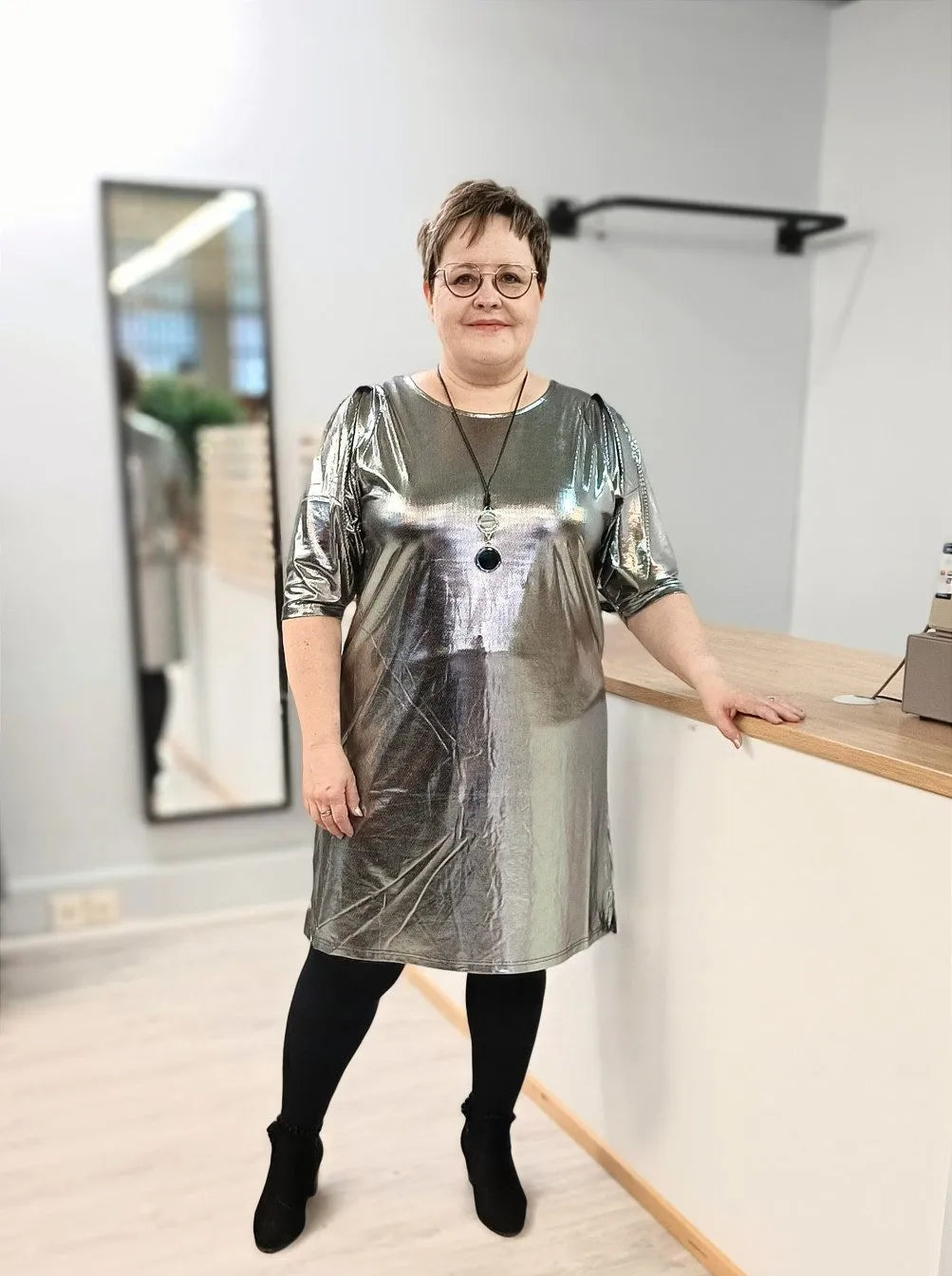Ze-Ze - Iris fallegur og sparilegur glansandi kjóll. Rúnað hálsmál, stuttar ermar og klauf á hliðum. Tilvalinn í veislurnar og hátíðirnar.