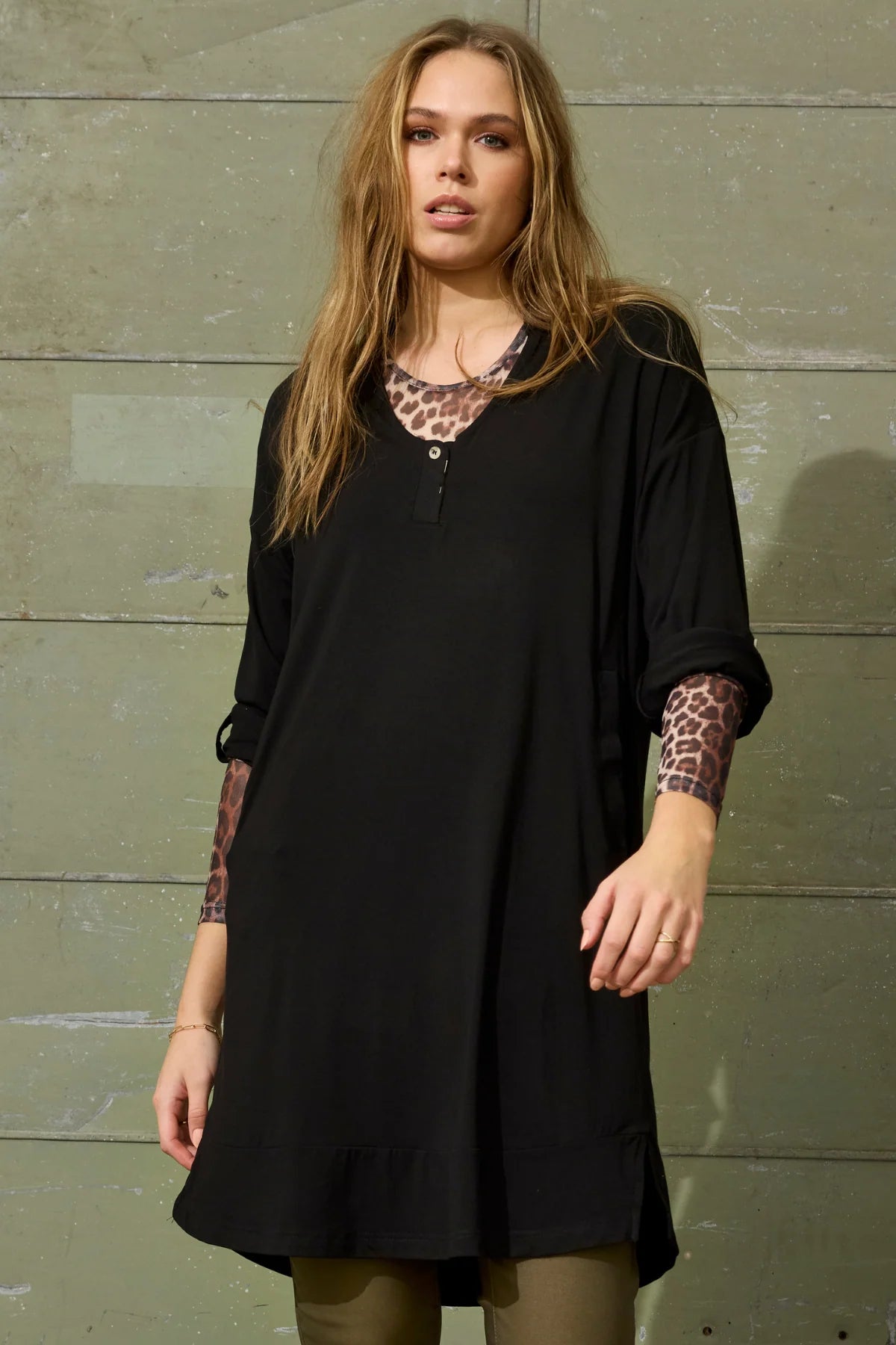 Ze-Ze - Kamelia flott og þægileg tunika. Rúnað hálsmál með tölum, langar ermar sem hægt er að bretta upp og festa með tölu. Passar vel við t.d. leggings, treggings eða gallabuxur.