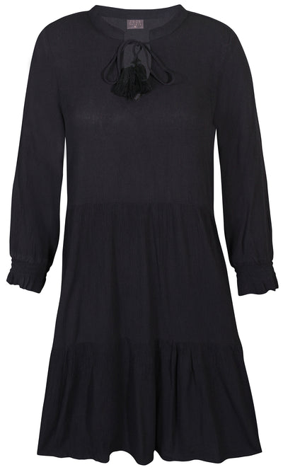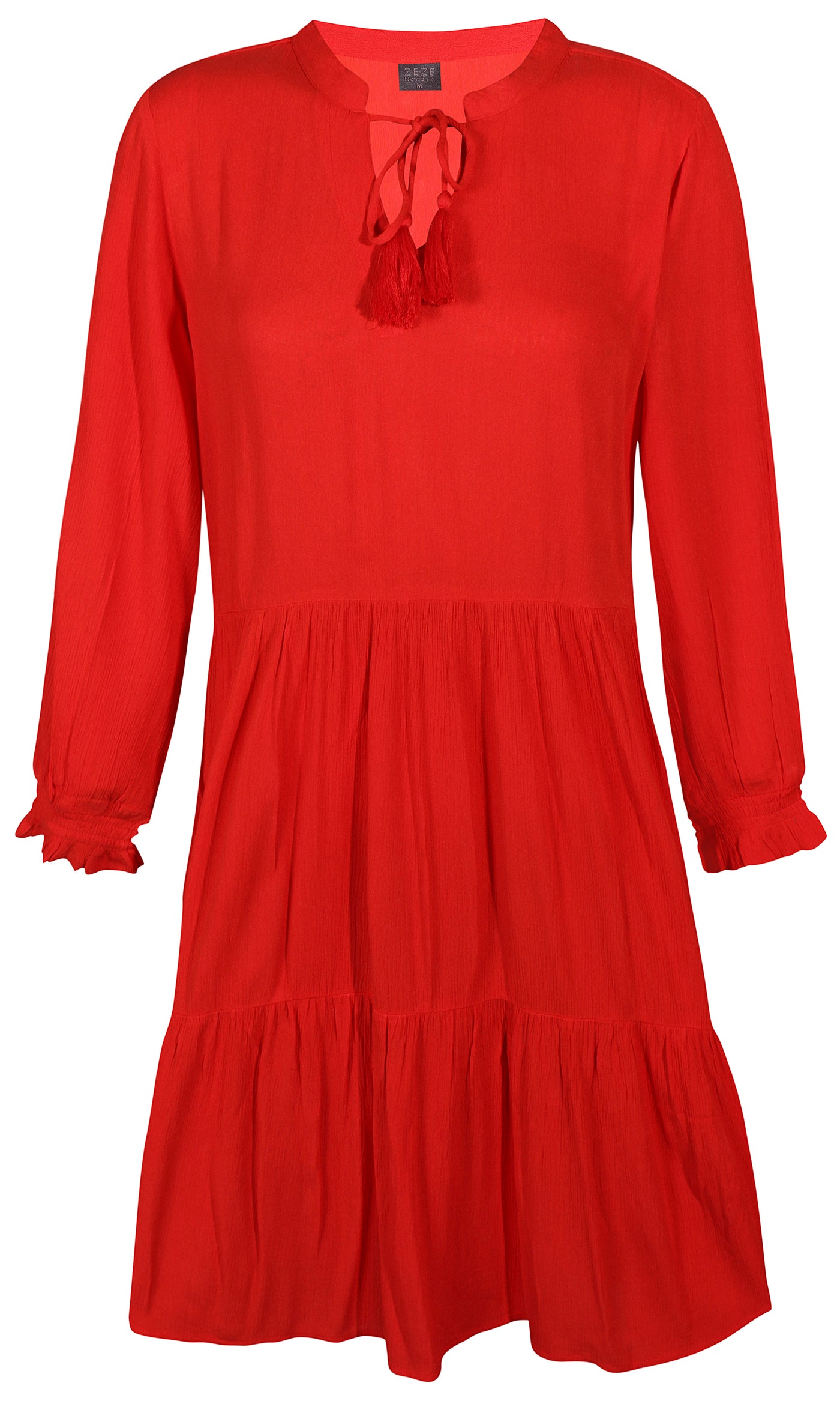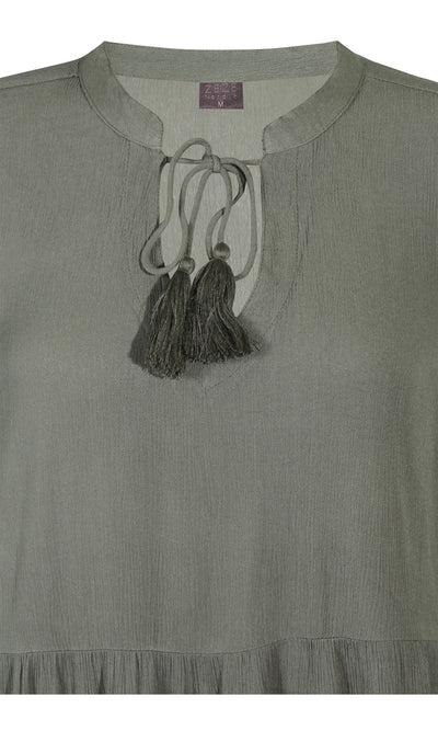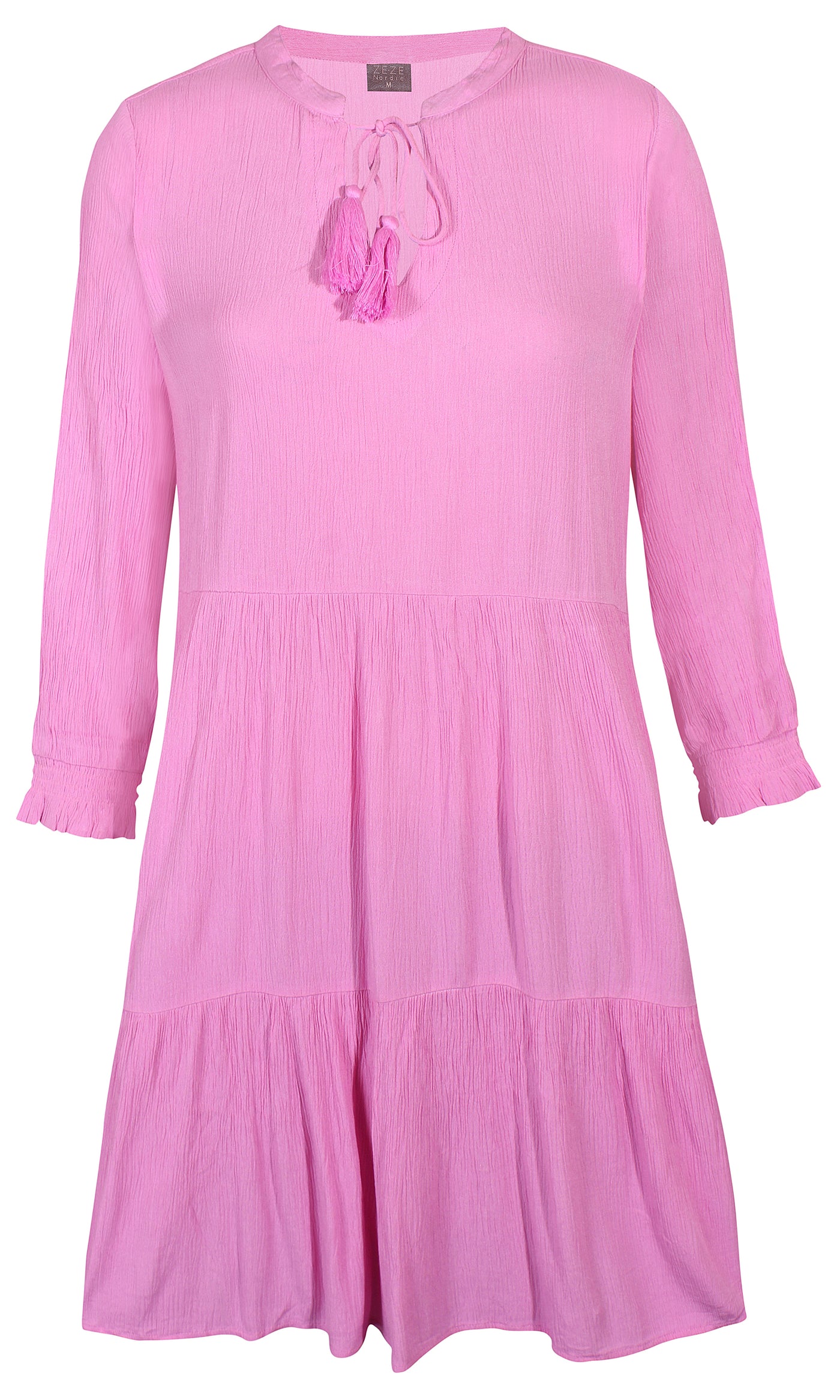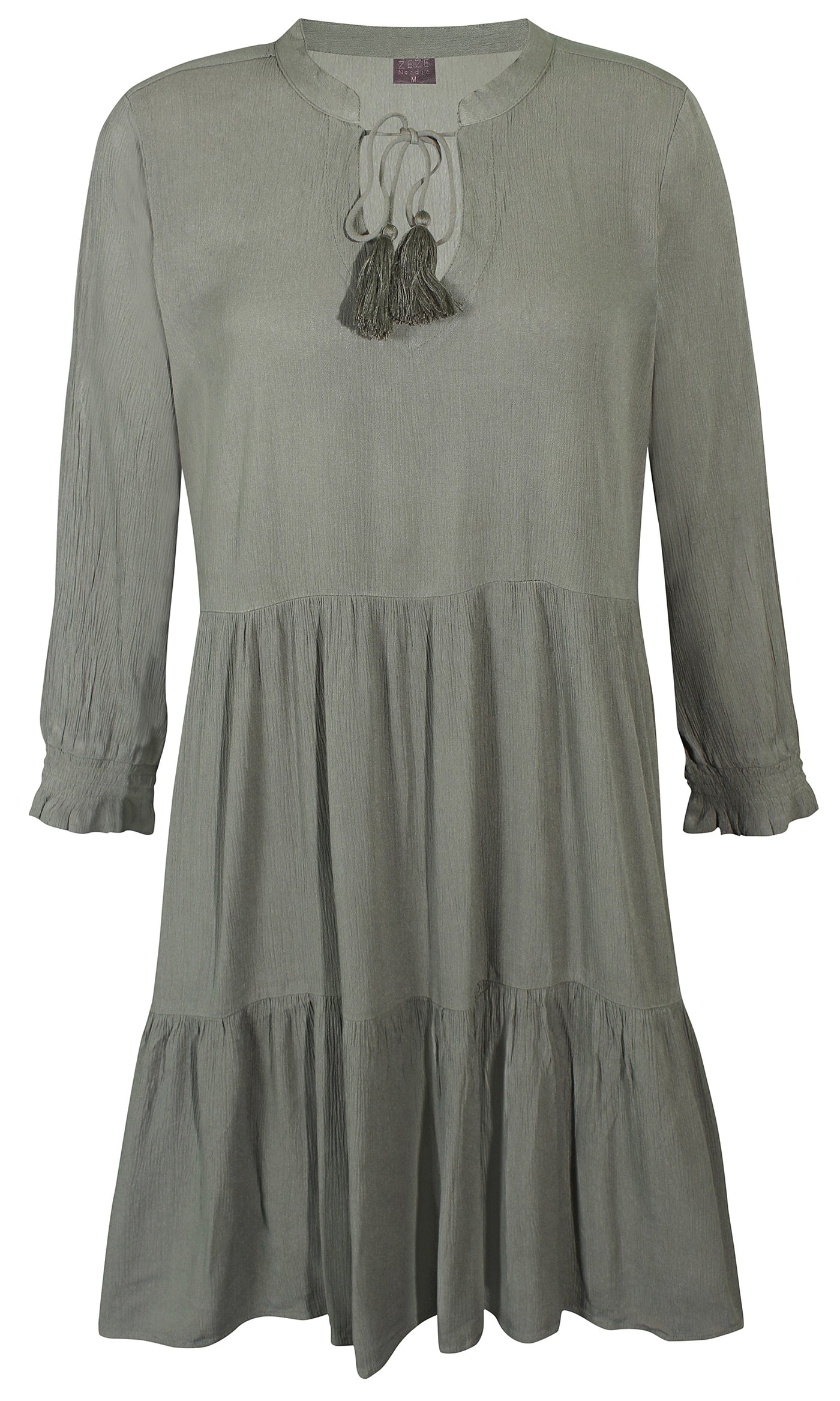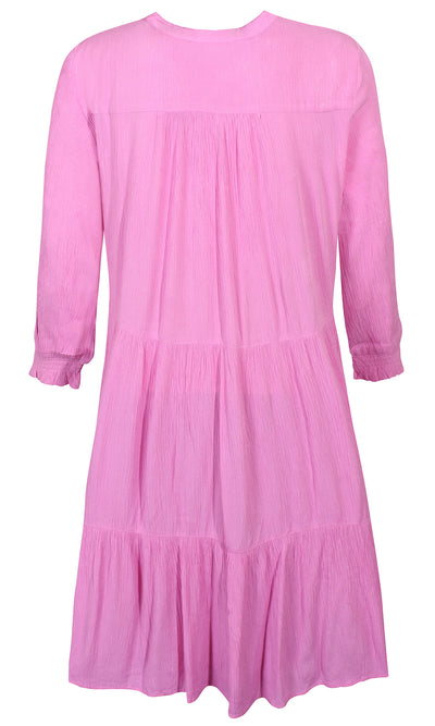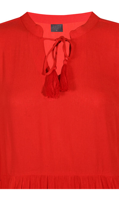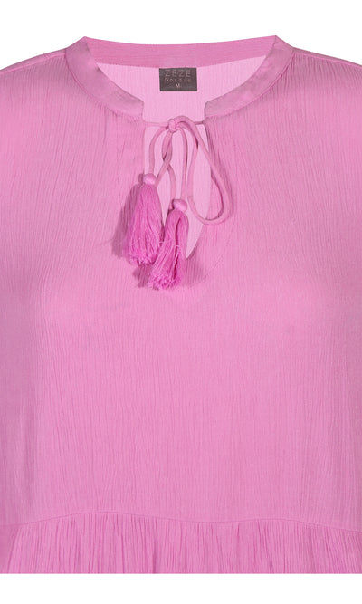 Ze-Ze - einlitur stuttur pífukjóll. V-hálsmál með pífukraga og bandi, vasar, hálfsíðar ermar með smá teygju fremst, penar pífur sem gefa skemmtilega hreyfingu. Létt og þægilegt efni.