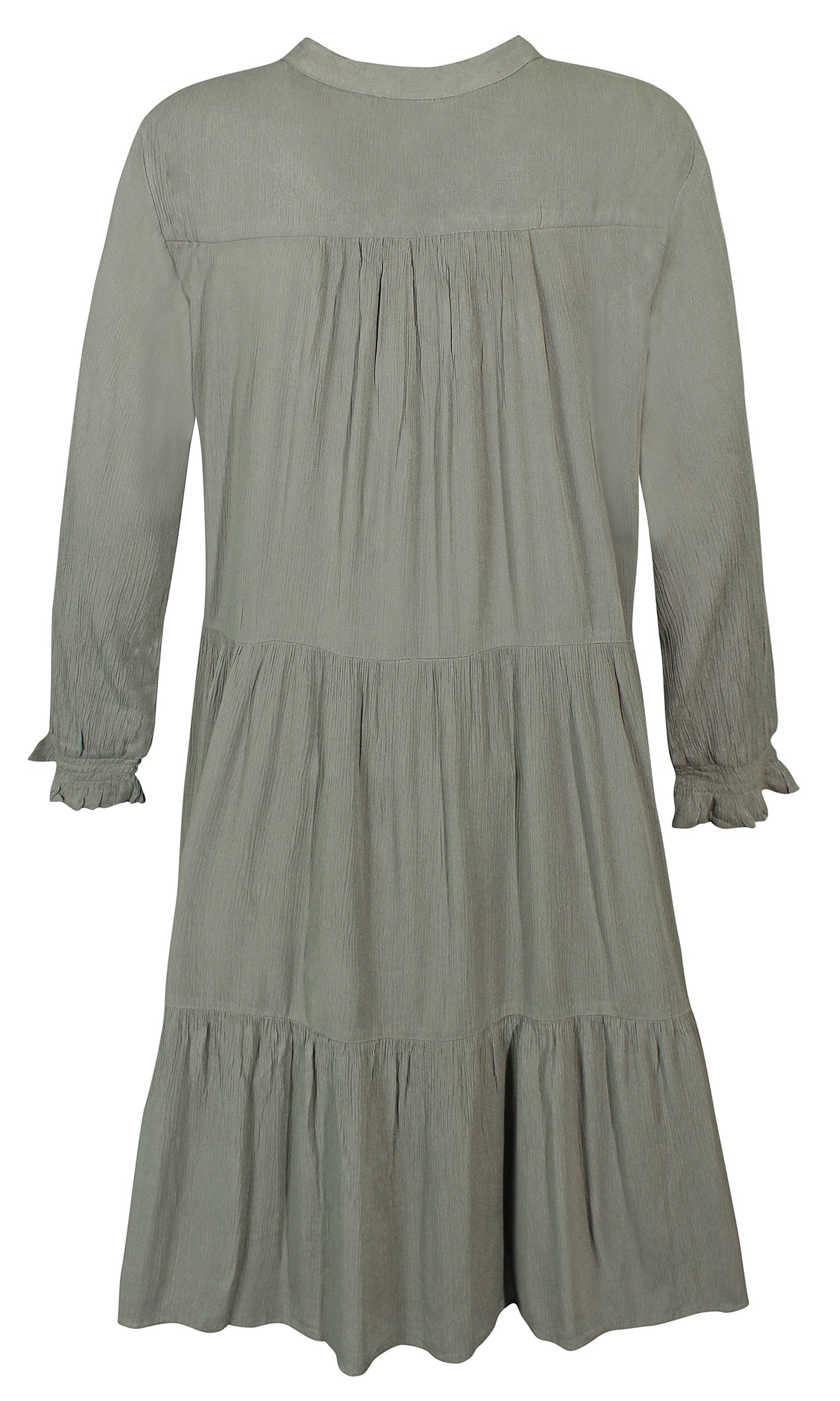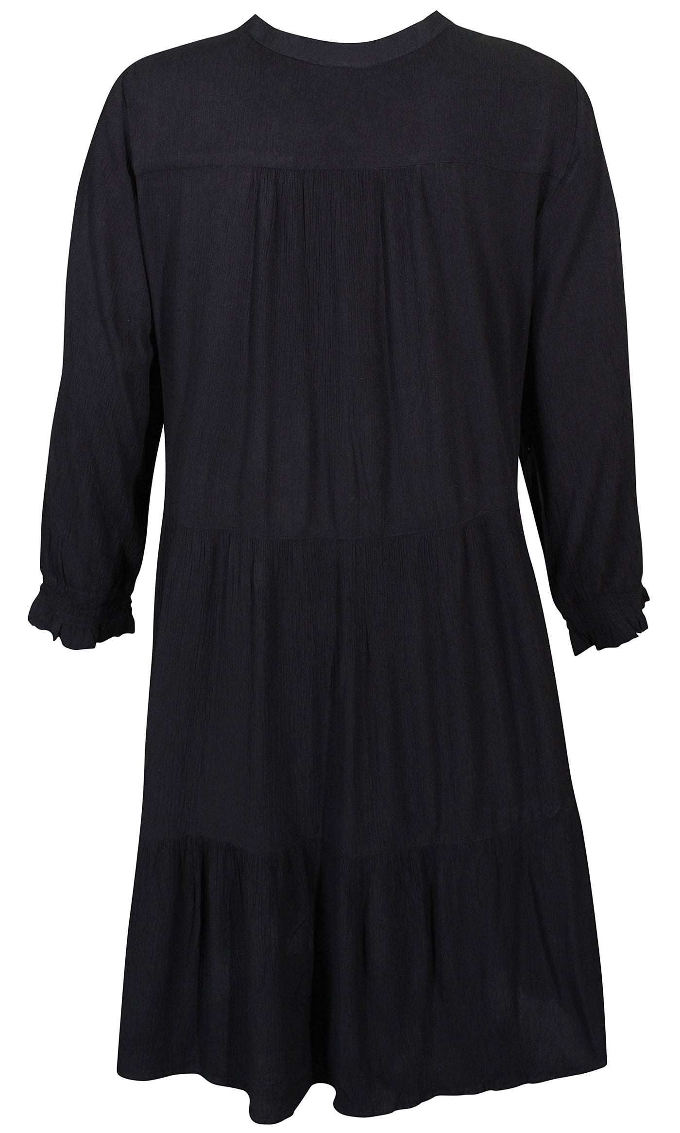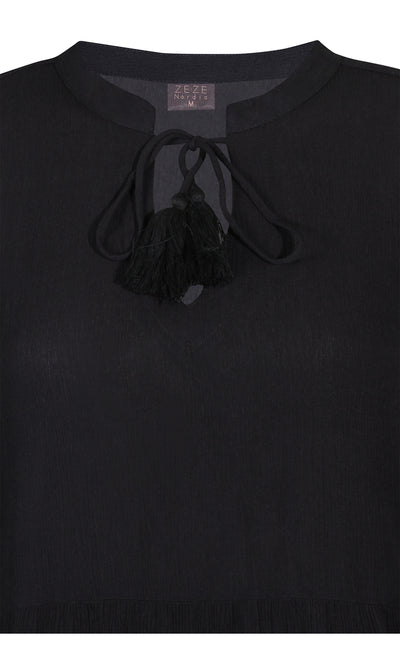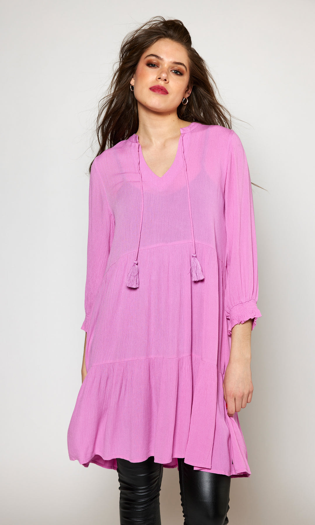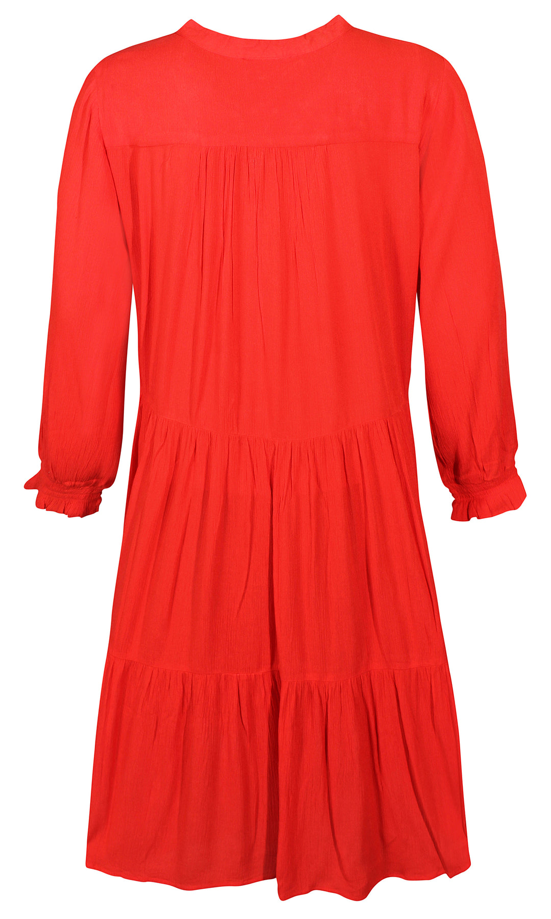 Ze-Ze - einlitur stuttur pífukjóll. V-hálsmál með pífukraga og bandi, vasar, hálfsíðar ermar með smá teygju fremst, penar pífur sem gefa skemmtilega hreyfingu. Létt og þægilegt efni.