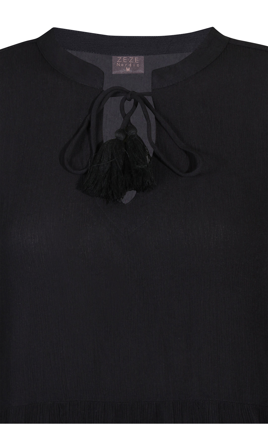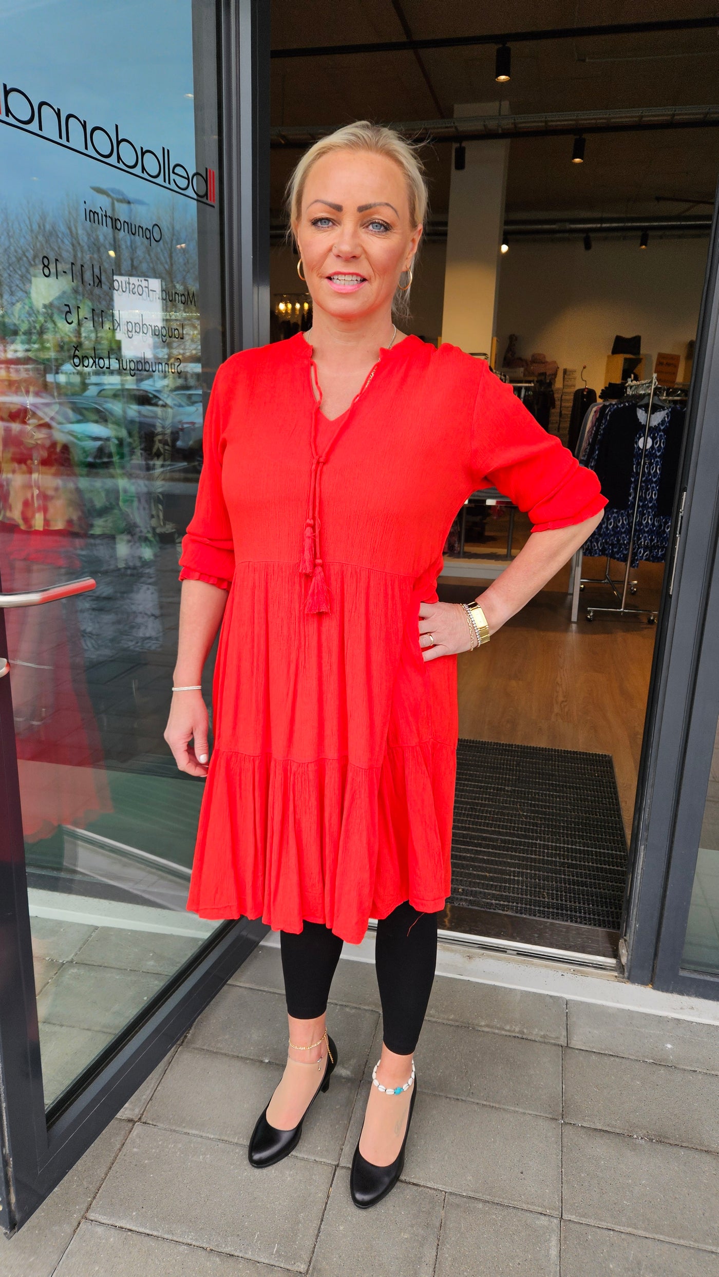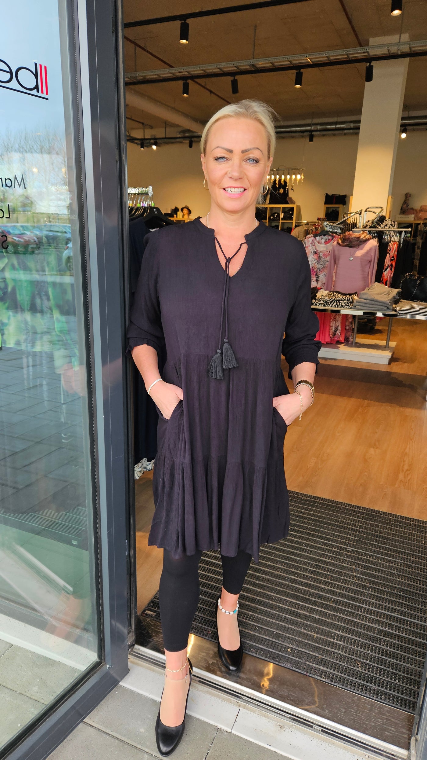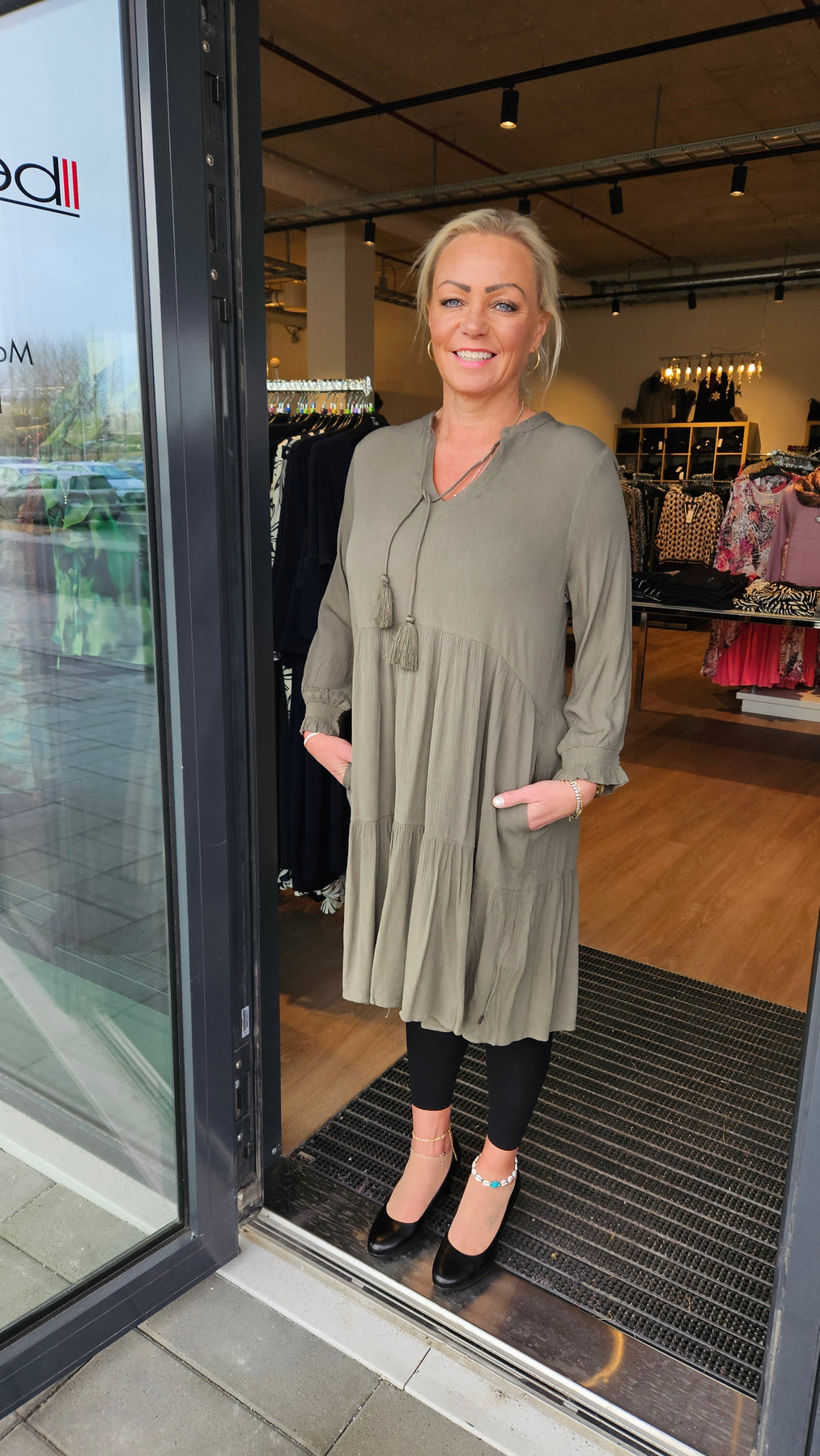 Ze-Ze - einlitur stuttur pífukjóll. V-hálsmál með pífukraga og bandi, vasar, hálfsíðar ermar með smá teygju fremst, penar pífur sem gefa skemmtilega hreyfingu. Létt og þægilegt efni.